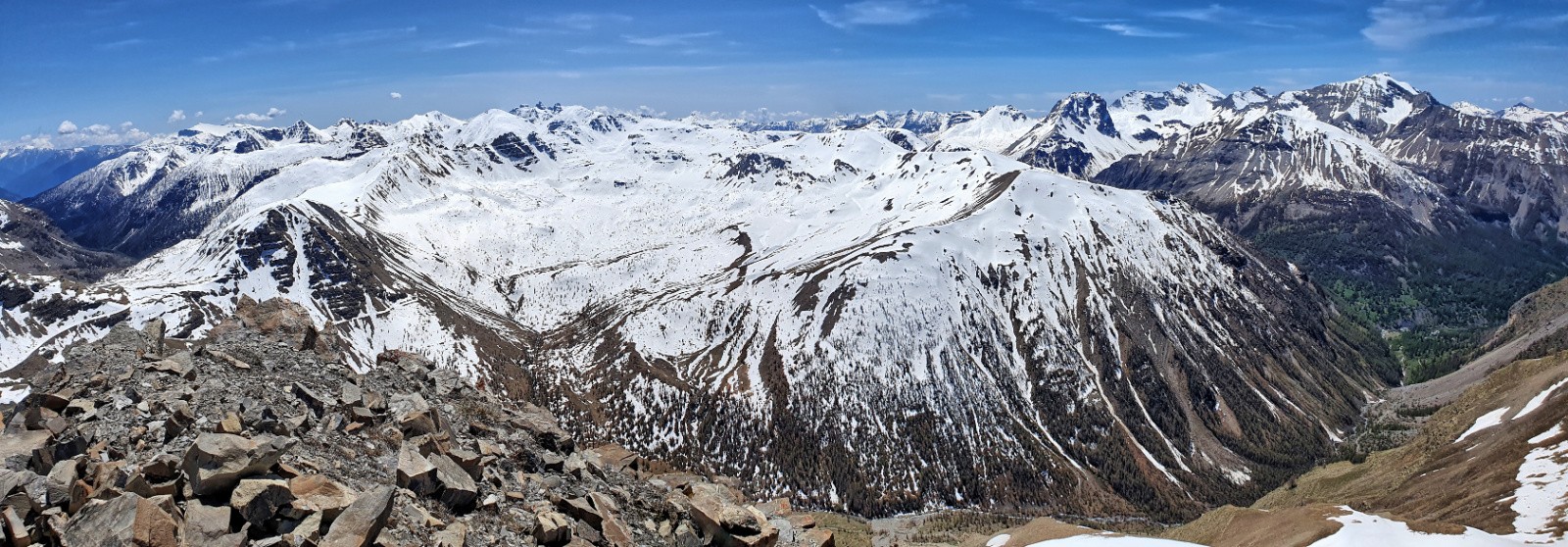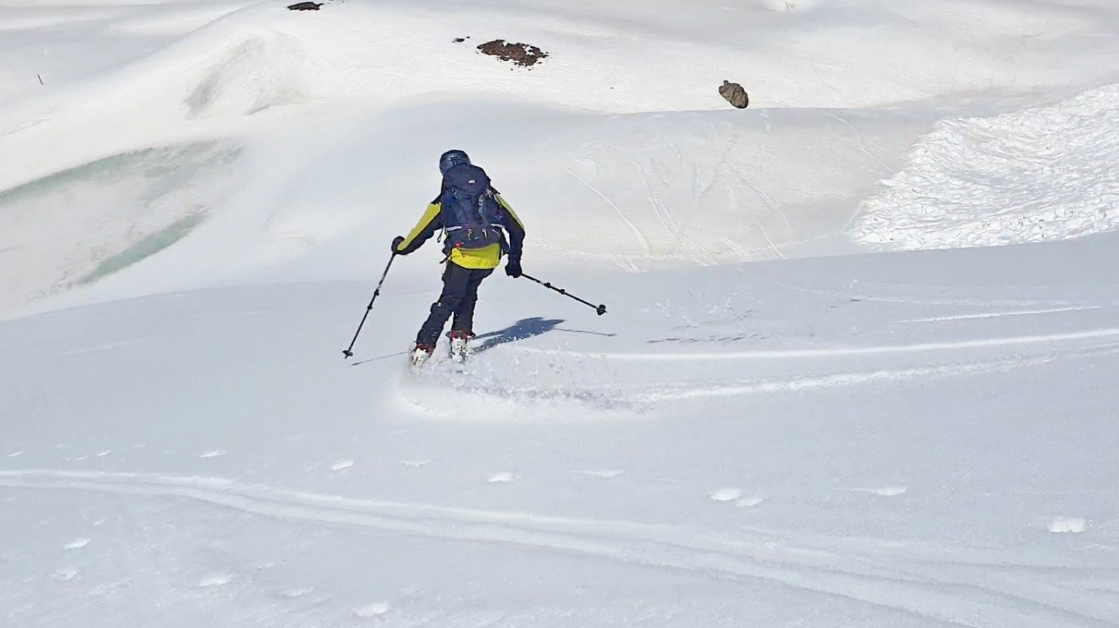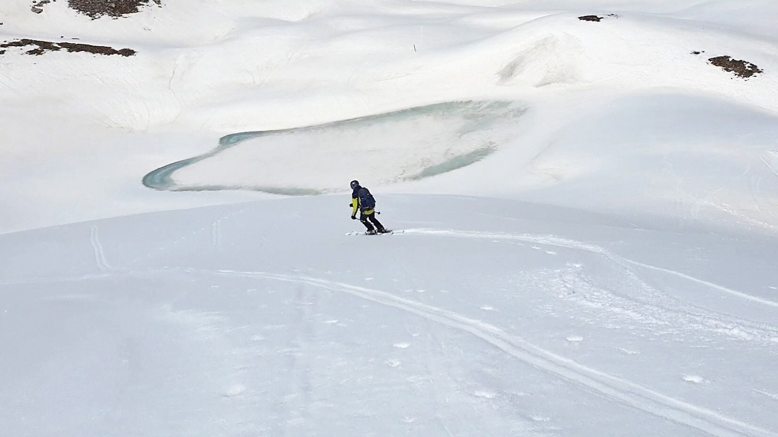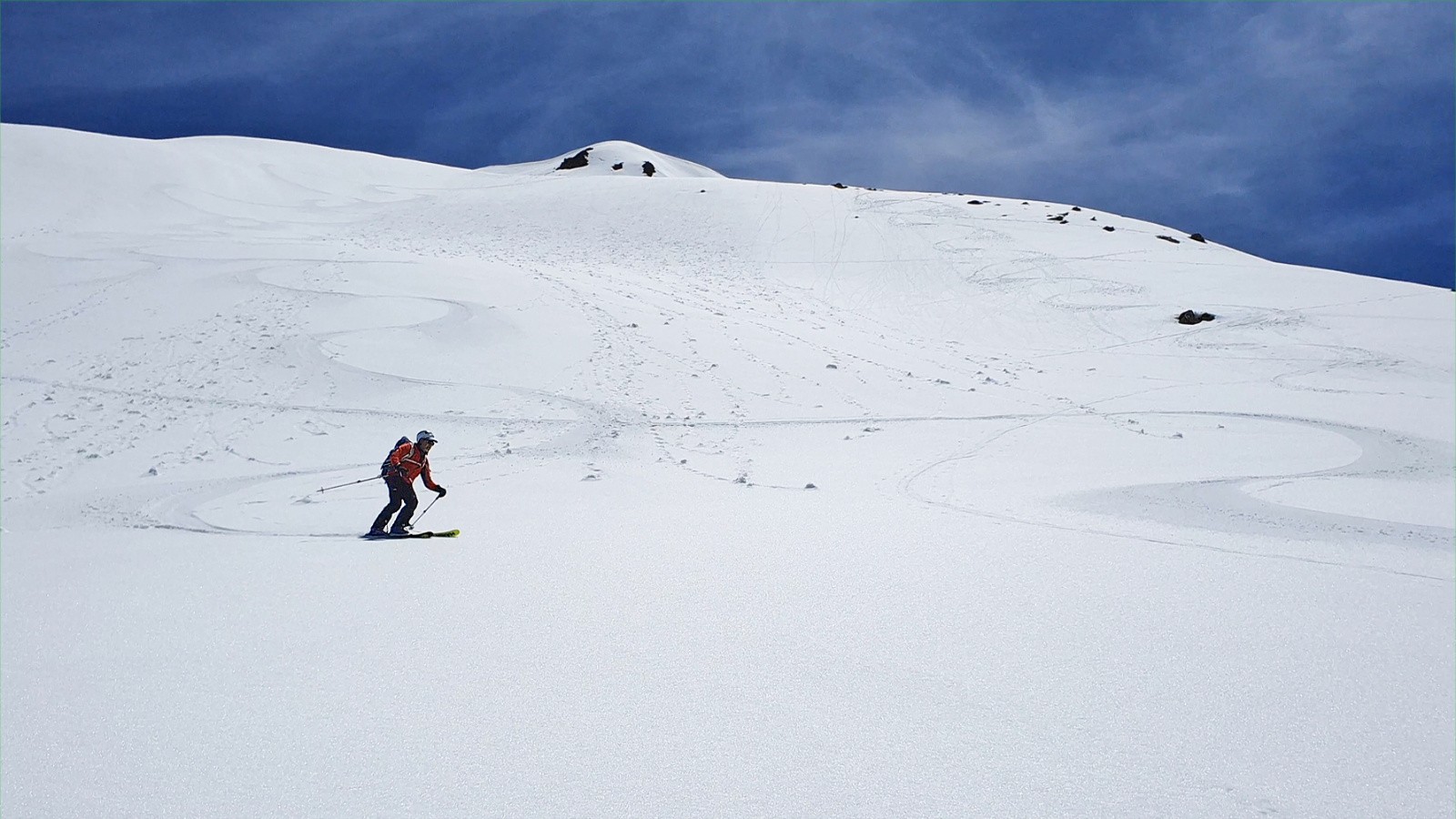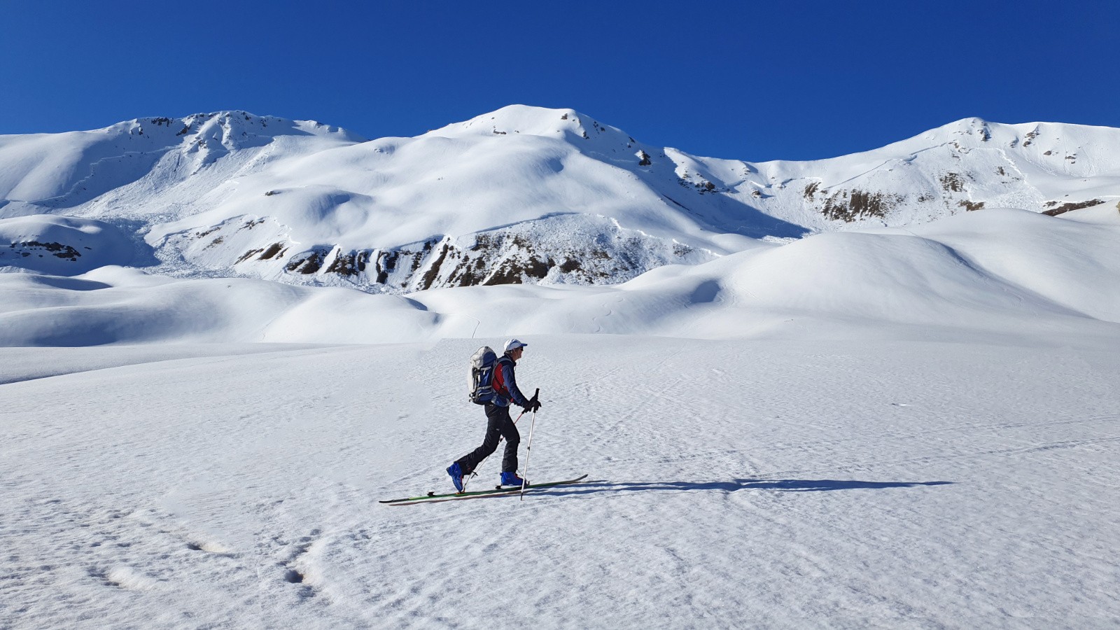 Pour ce clap de fin, on profite de l'ouverture du Col de la Bonette pour bénéficier du très bon enneigement sur les versants Nord de la Bonette, sans portage, comme souvent en fin de saison, secteur Cimes du Chevalier et du Caire Brun, aux pentes soutenues idéales pour le ski.