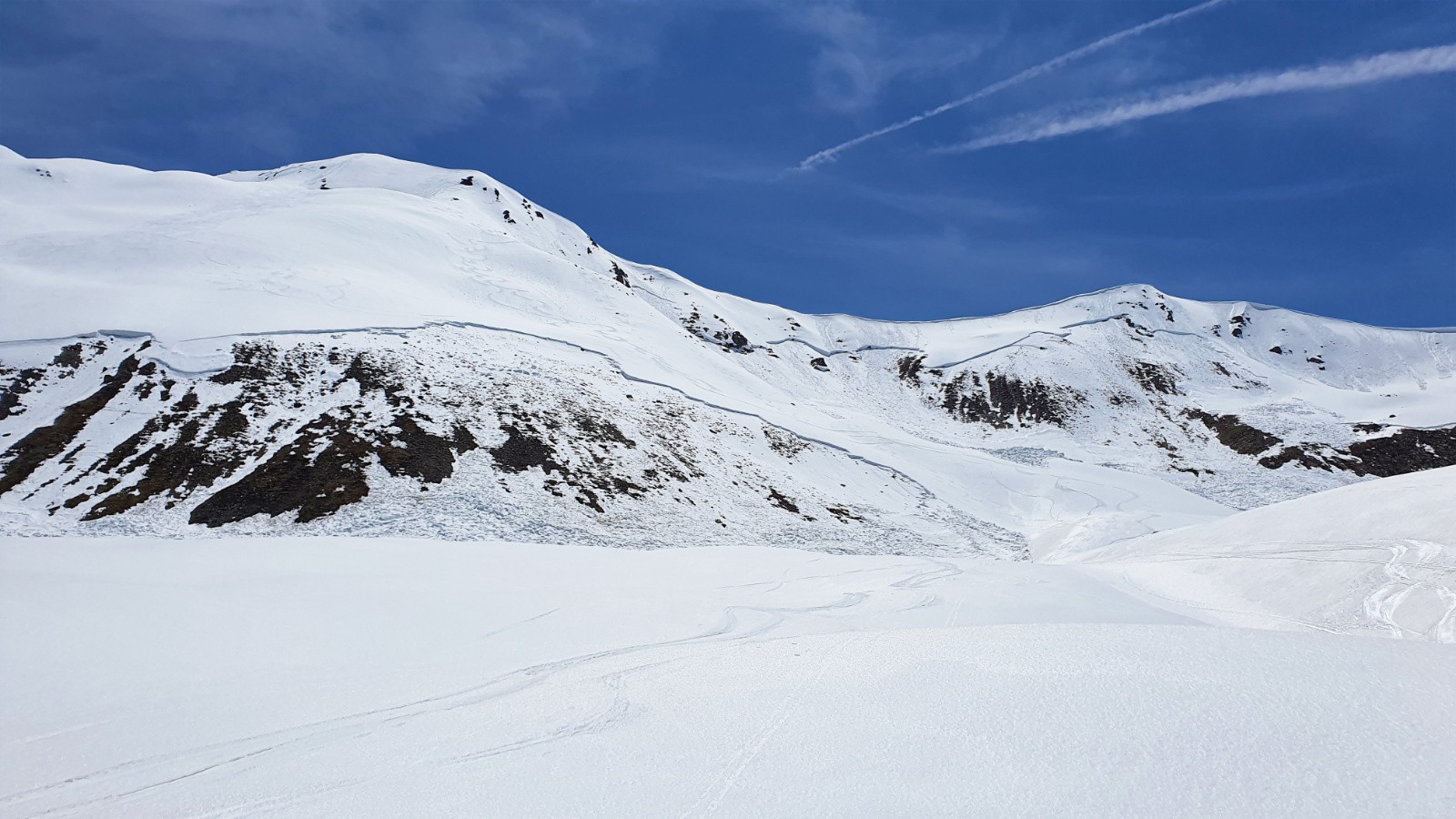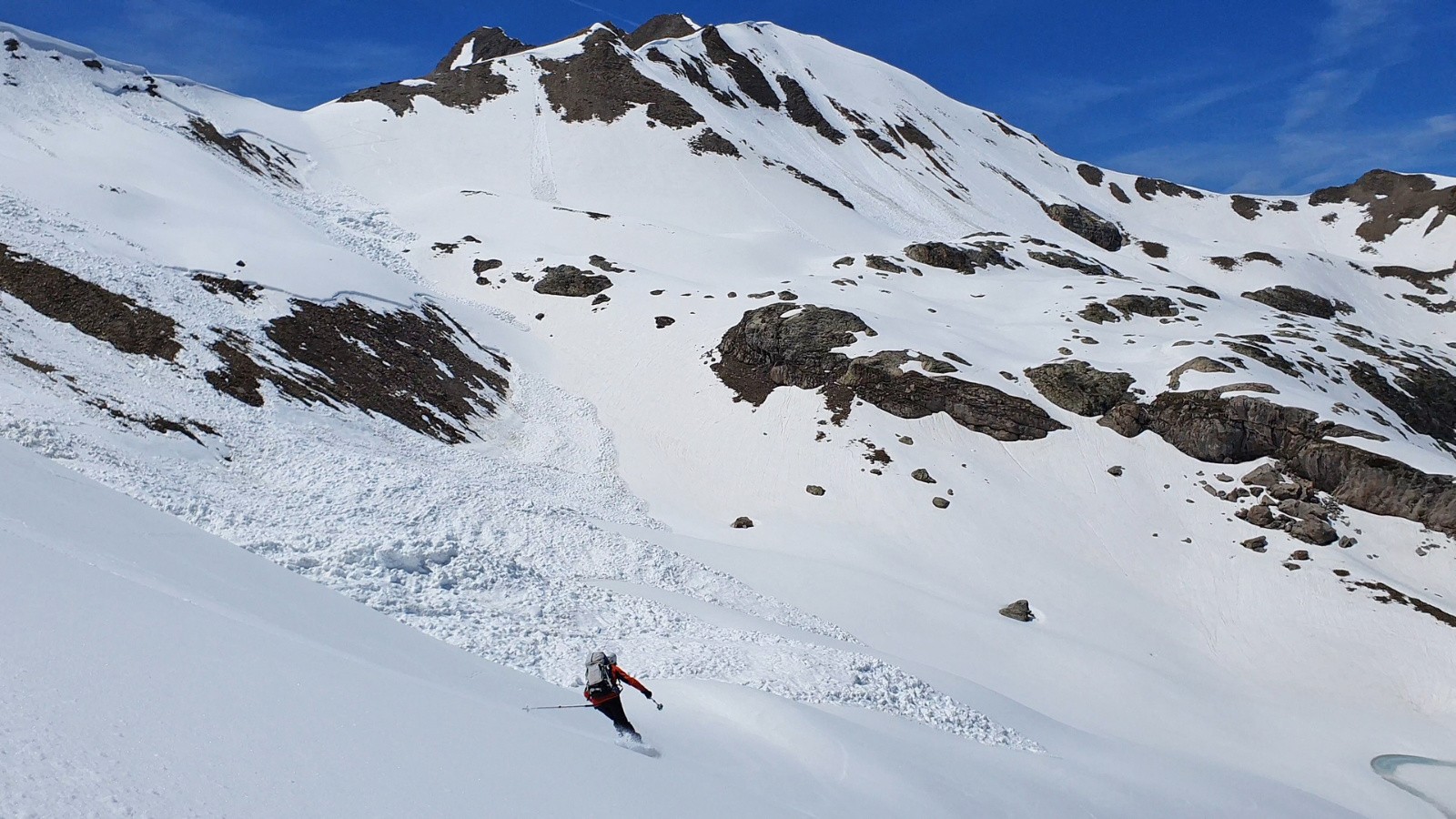petit glissement de neige de surface déclenché en versant E en milieu d'aprèm au passage en descente sous le sommet du Caire Brun
