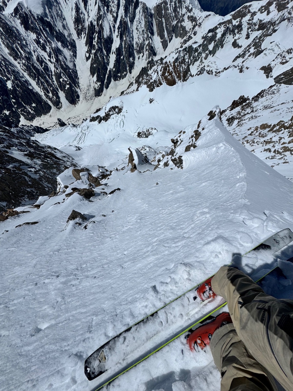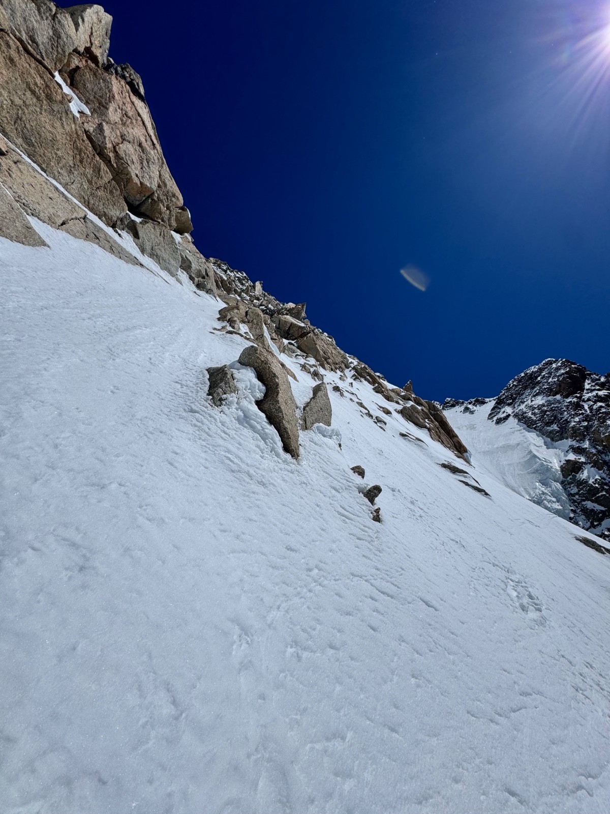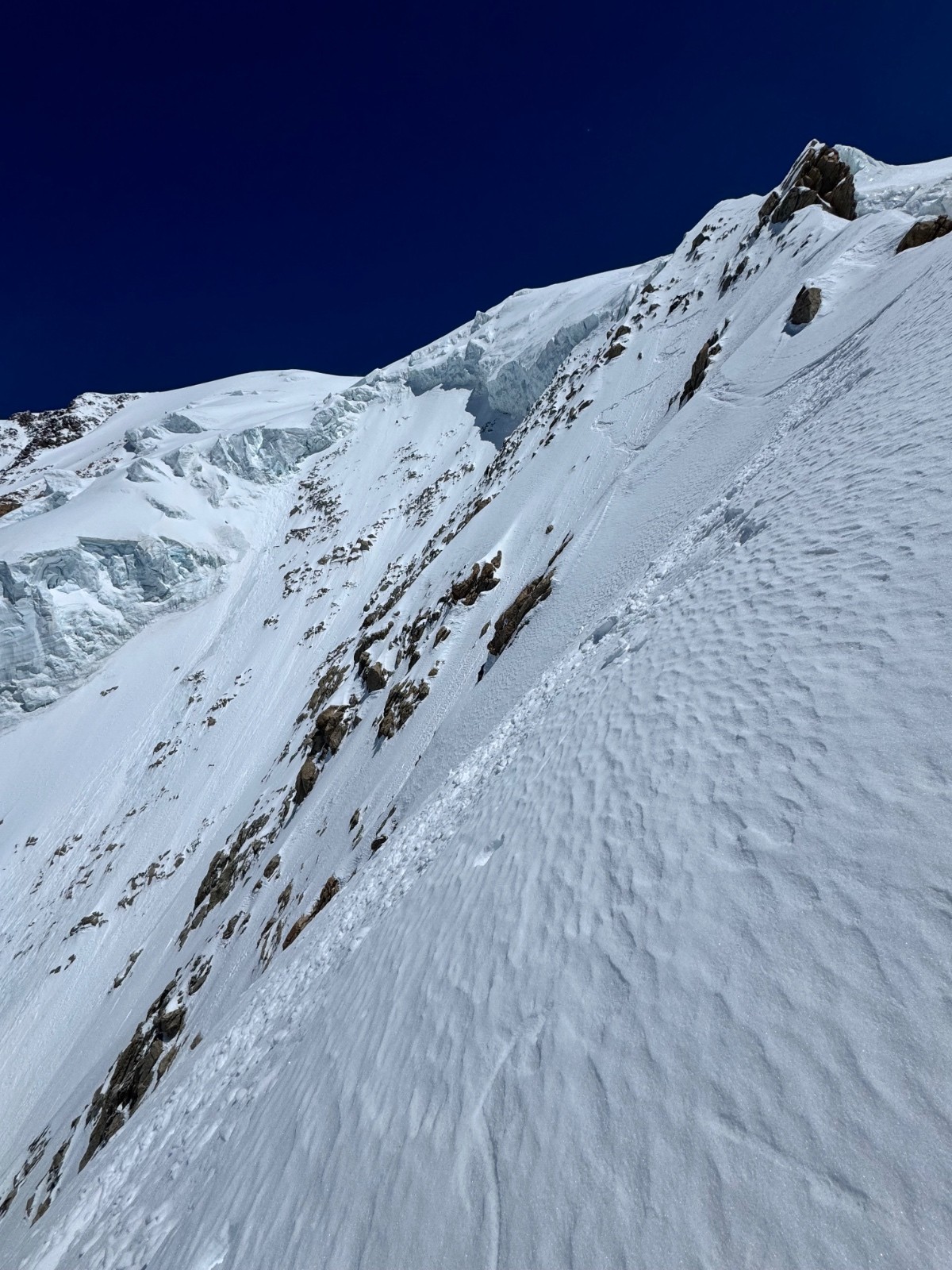 Conditions pour le ski : Globalement béton avec grip à croûte. Très légère décaillée plus bas sous 4000