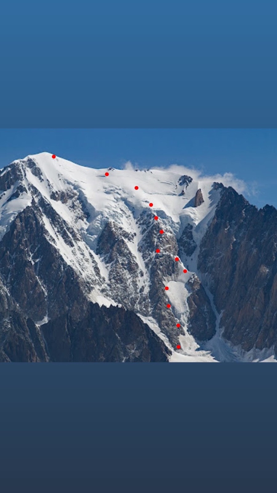 Itinéraire suivi : 3 Monts. Sommet Mont blanc, ligne à vu. Vol en speed sous la rimaye jusque camping Peuterey