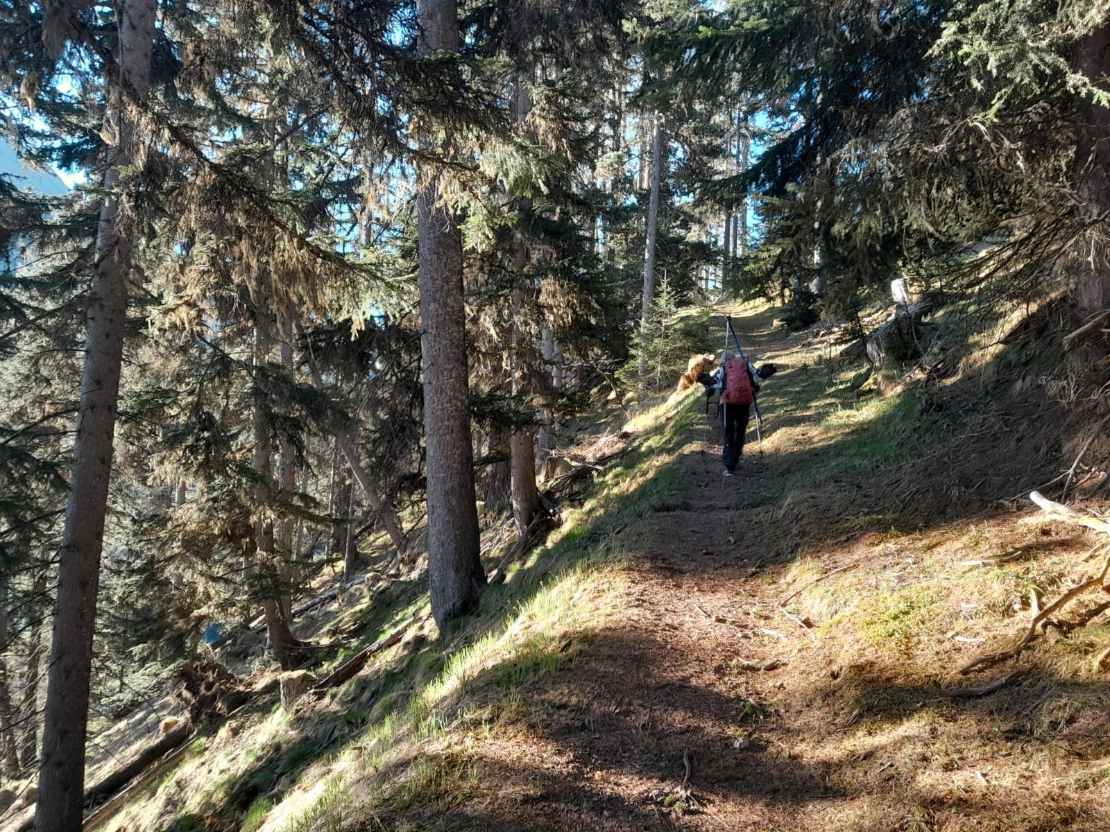 Départ 7h, une heure trop tard , accompagnés du chant du coucou , baignés de la fraiche senteur "matin dans les bois" . Piste rude et chemins creux, la rive gauche du Nant du Vallon , perchée 100 mètres au dessus du torrent, tourne résolument le dos à la station toute proche de la Norma. A peine si l'on remarque les canons à neige du départ. On se croirait dans Bambi, ou dans Blanche Neige ,mais on n'a vu personne...