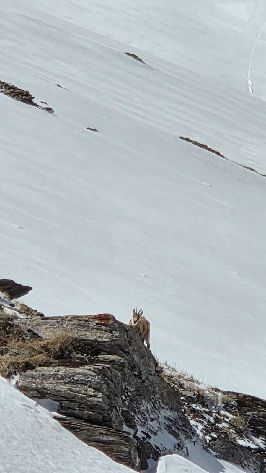 Horaires :9h30-13h30 avec pose casse-croûte où un chamois qui ne m'avait pas vu sur un rocher est venu droit sur moi. Nombreuses marmottes et chants de Tétras dans les mélèze.