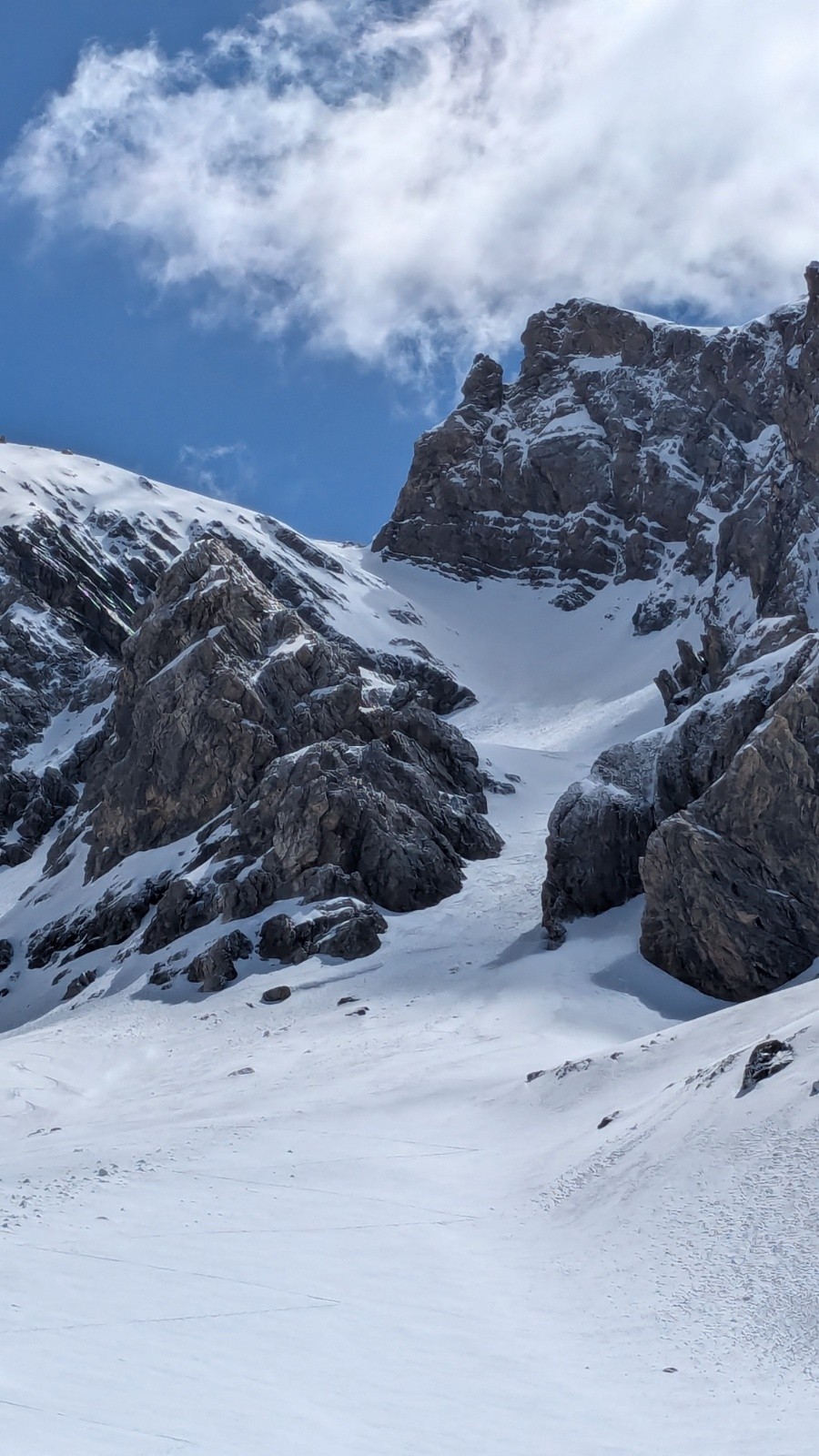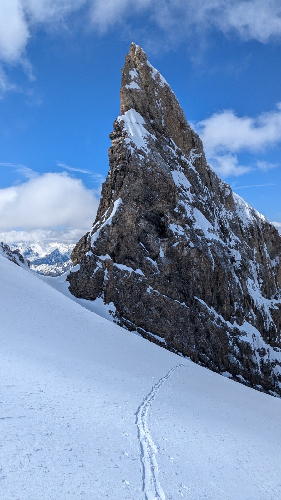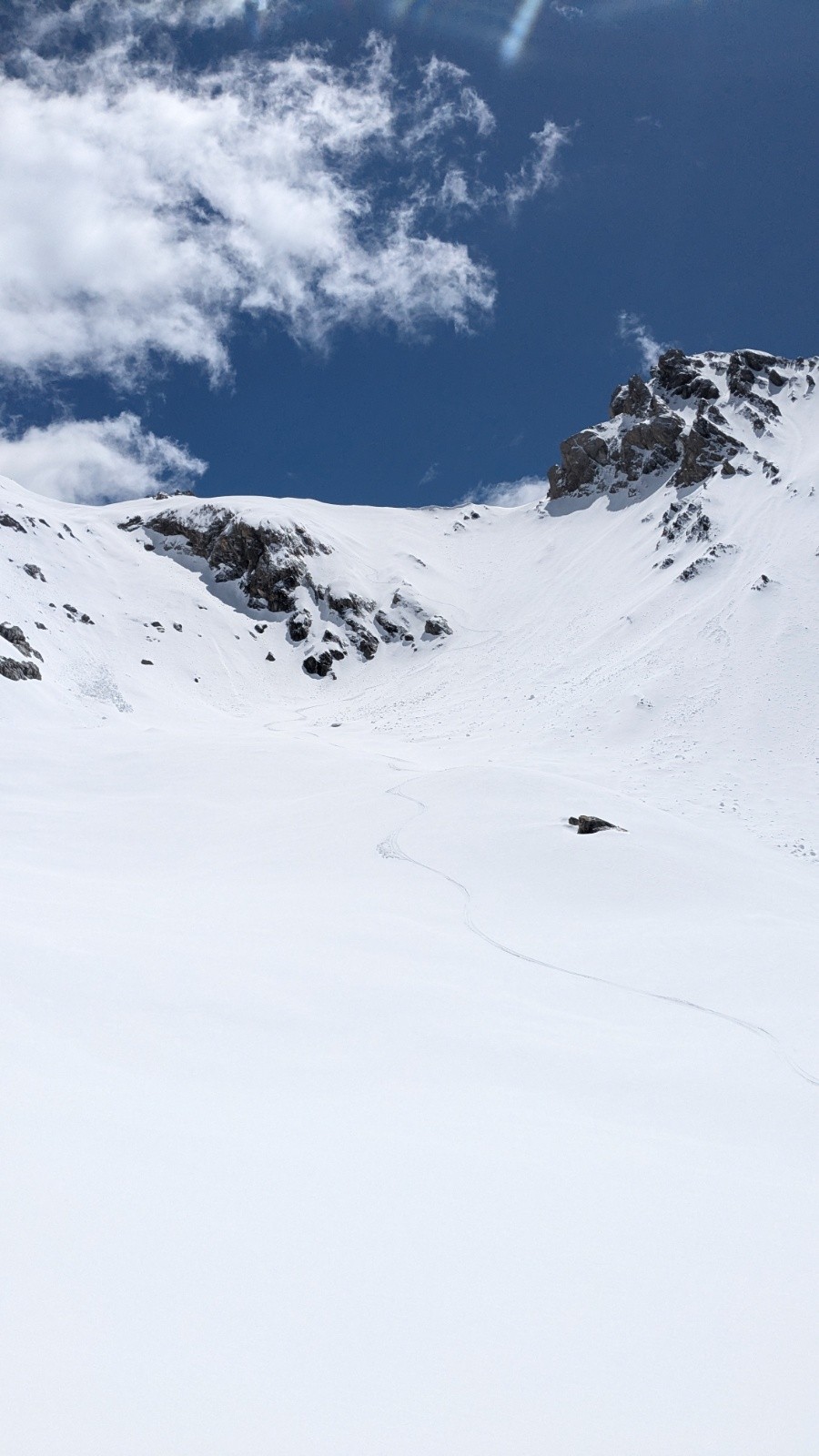 Pas de grosse motivation ce matin j'ai dû me faire violence. En arrivant quand je vois le portage que je vais devoir faire je me tâte à faire demi tour. J'ai compris le message mon corps me mets un stop pour cette saison (103000mD+) mais comme je n'ai jamais mis les pieds dans le coin j'y vais quand-même. 6km de portage avant de chausser mais ça se passe sur un joli sentier et le paysage est vraiment beau donc ça passe bien. Montée intégralement en peaux jusqu'au sommet, j'ai vaguement tenté de cramponner mais je me suis enfoncé jusqu'au cuisses. Obligé de mettre les couteaux sinon je zip à chaque pas et c'est épuisant. Les 2 descentes sont en top conditions, neige lisse froide et douce, pas une trace et pas un chat hormis un kite 🤮 qui galère 😈. On pestais avec les copains il y a quelques jours par rapport à l'ouverture tardive de la barrière qui permet d'accéder à ce secteur, mais finalement c'est très bien comme ça, préservons ce coin des hordes de skieurs et laissons les bestioles se retaper avant l'afflux touristique.