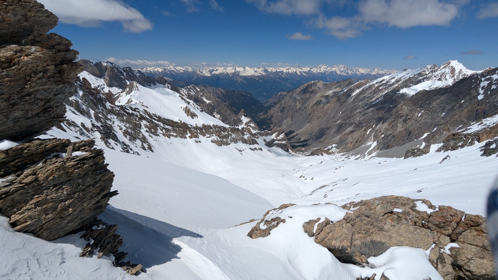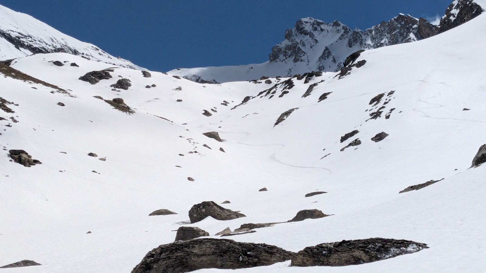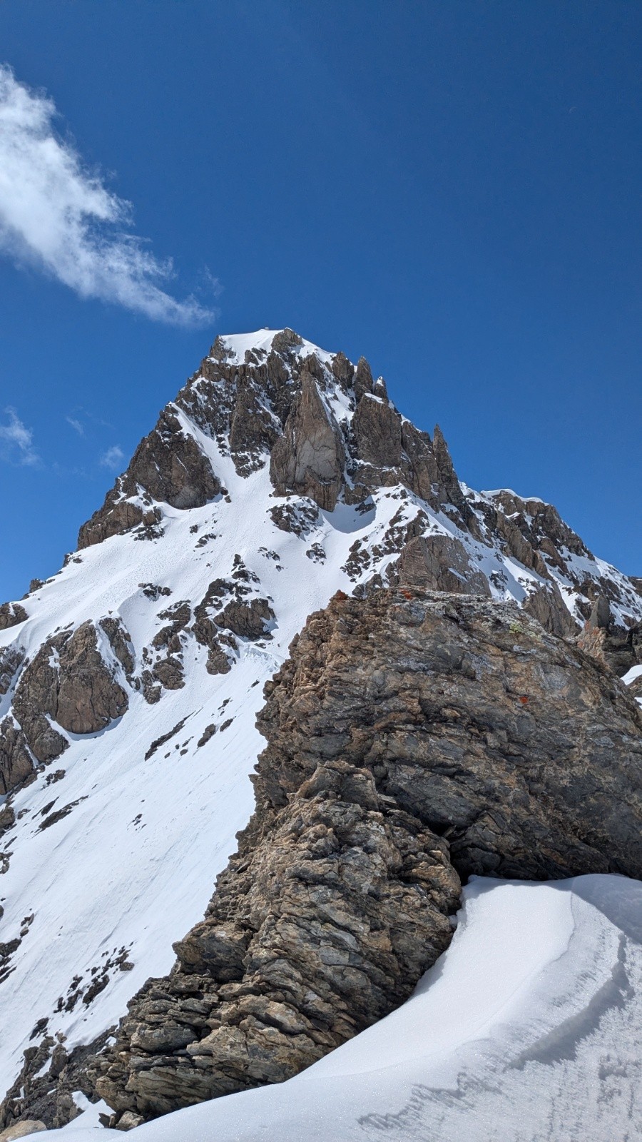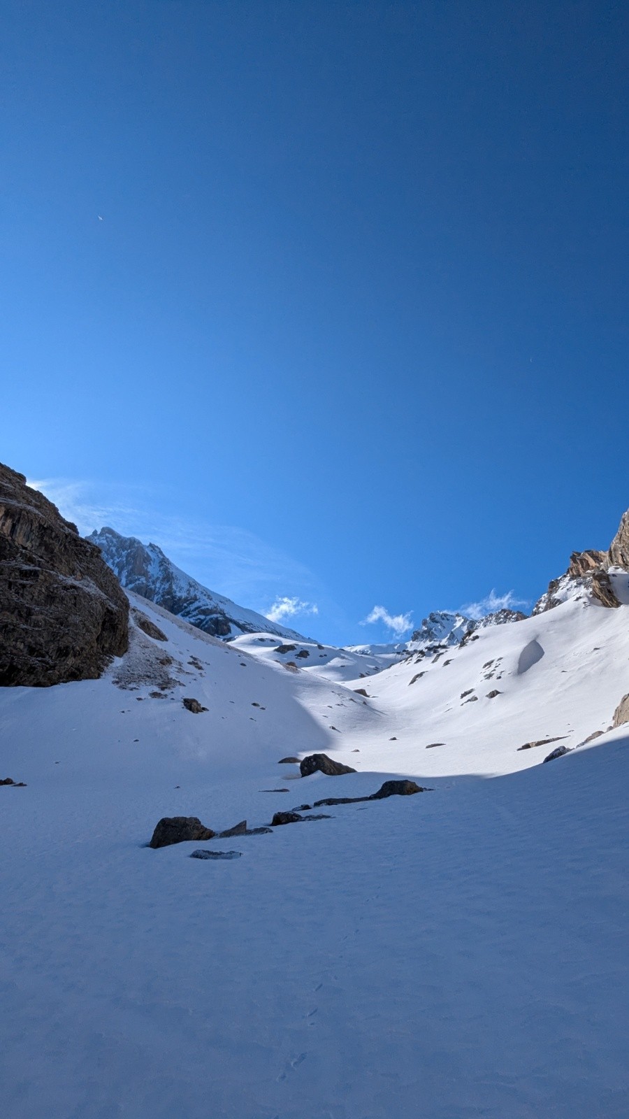 Pas de grosse motivation ce matin j'ai dû me faire violence. En arrivant quand je vois le portage que je vais devoir faire je me tâte à faire demi tour. J'ai compris le message mon corps me mets un stop pour cette saison (103000mD+) mais comme je n'ai jamais mis les pieds dans le coin j'y vais quand-même. 6km de portage avant de chausser mais ça se passe sur un joli sentier et le paysage est vraiment beau donc ça passe bien. Montée intégralement en peaux jusqu'au sommet, j'ai vaguement tenté de cramponner mais je me suis enfoncé jusqu'au cuisses. Obligé de mettre les couteaux sinon je zip à chaque pas et c'est épuisant. Les 2 descentes sont en top conditions, neige lisse froide et douce, pas une trace et pas un chat hormis un kite 🤮 qui galère 😈. On pestais avec les copains il y a quelques jours par rapport à l'ouverture tardive de la barrière qui permet d'accéder à ce secteur, mais finalement c'est très bien comme ça, préservons ce coin des hordes de skieurs et laissons les bestioles se retaper avant l'afflux touristique.