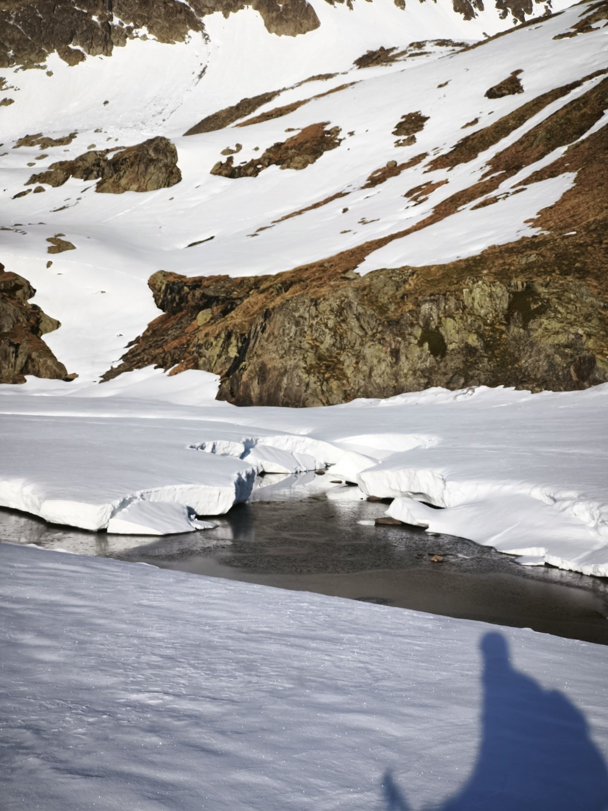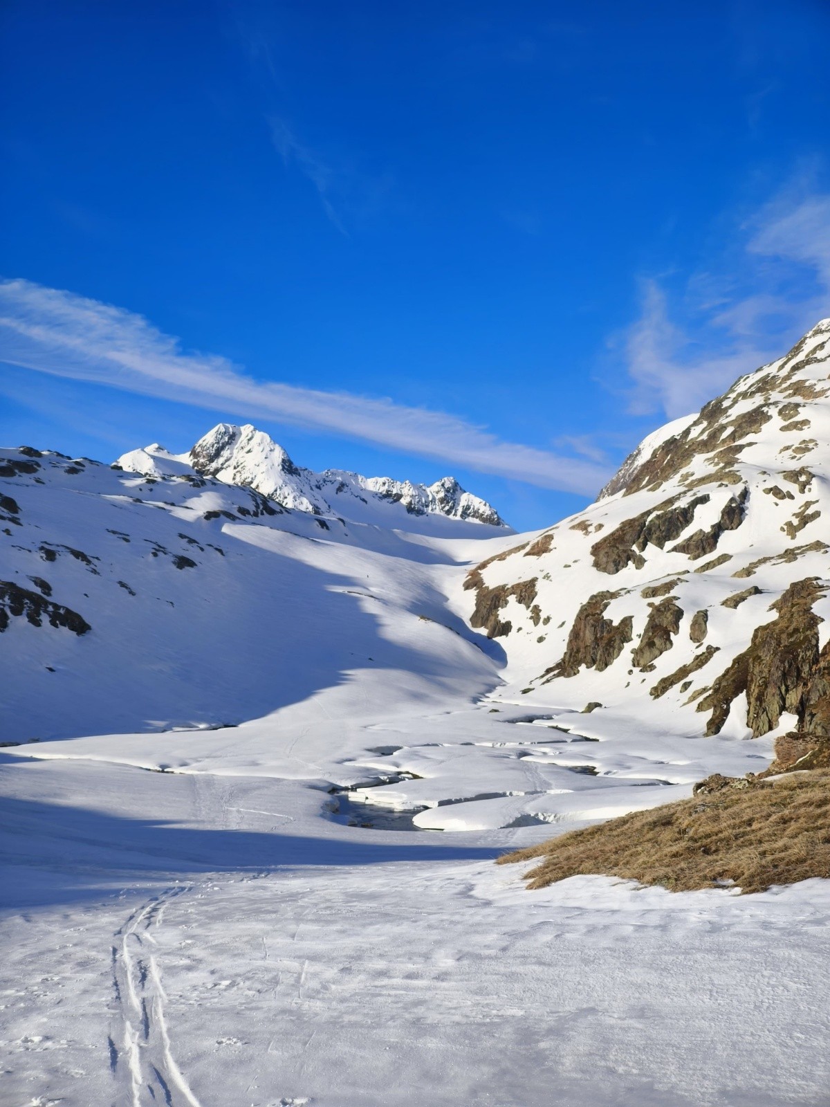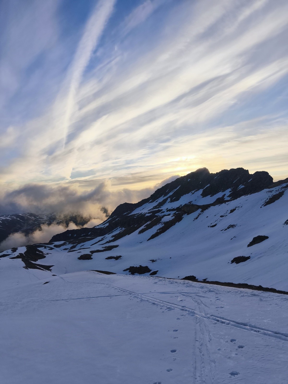 Je repaute et me laisse glisser jusqu'à la dernière montée après le refuge, avec les peaux. C'est possible de dépeauter pour les petites descentes mais je préfère éviter les manips et me laisse porter. Dernière pause au lac Bramant pour me recharger en eau. La dernière descente est en transfo parfaite, pas collante, juste revenue comme il faut.