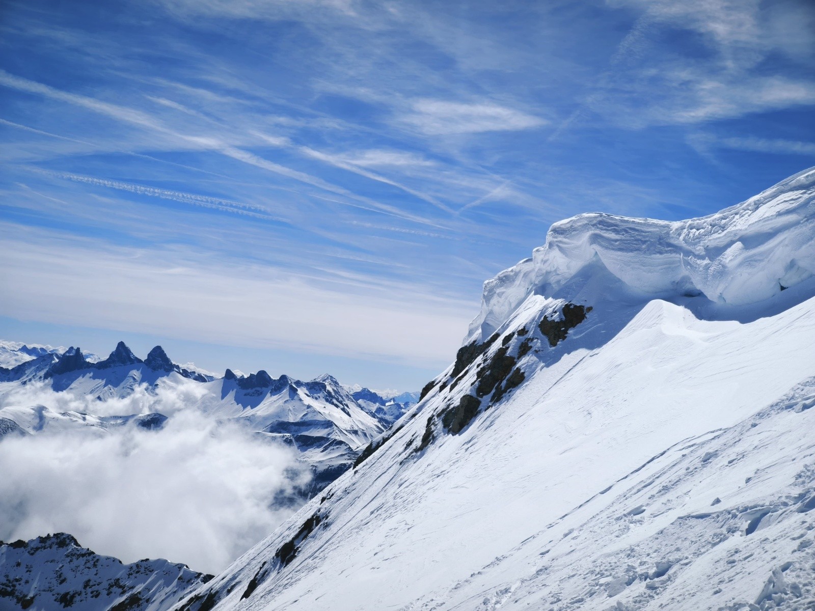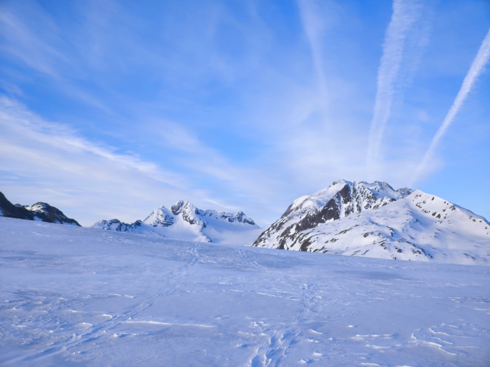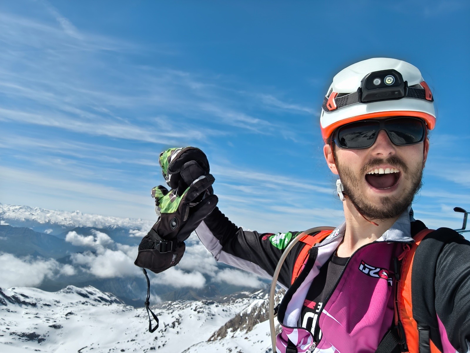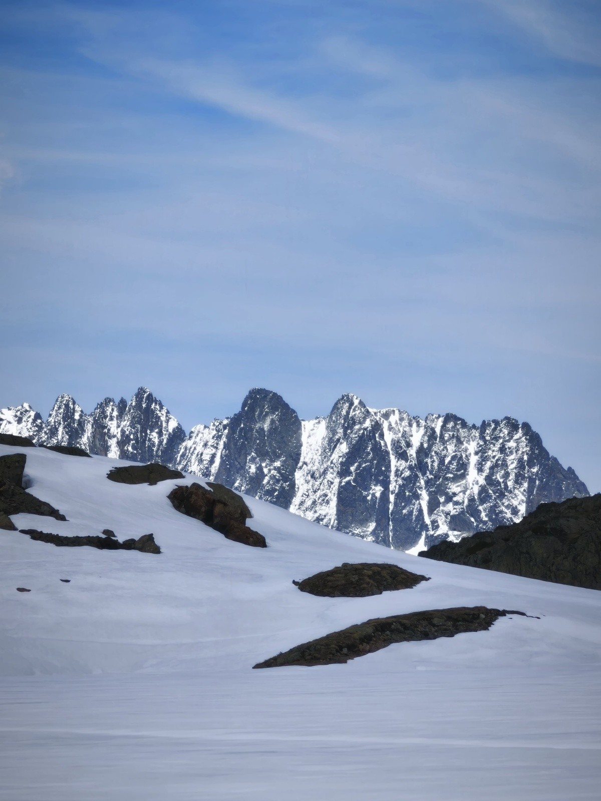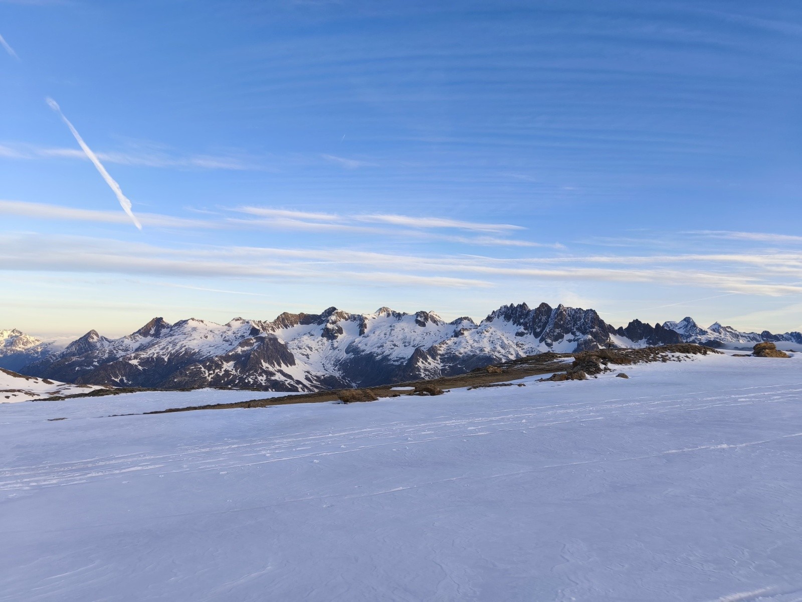 Les deux premiers skieurs qui descendent la face, s'arrêtent et me voyant pas très bien, me proposent de la bouffe (adorables vraiment). Le groupe de 4 du CAF de Lyon qui suivent, pareil, me donnent un bout de saucisson avec du pain (si vous passez par là, encore un grand merci). Ils me remotivent, m'incitent à faire une pause pour me remplir le ventre et m'encouragent à continuer. La météo est niquel toute la journée et je suis largement dans l'horaire. Pause d'environ 20 minutes pour manger. J'en profite pour appeler deux copain.ine.s pour leur demander conseil (coucou Valentin et Ariane), non, pas de vertige, pas de sensation bizarre et nouvelle, juste de la fatigue musculaire et générale, allé, ça devrait le faire, je les tiens au courant quand je fais demi-tour.