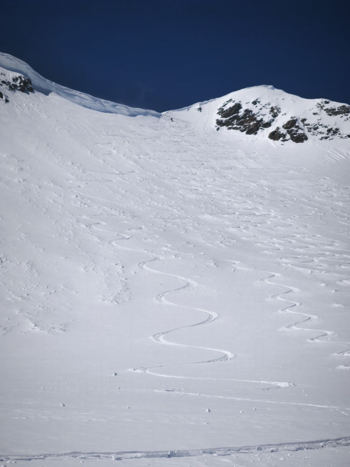 Sous la corniche, c'est crouté, ça embarque les skis, à deux doigts du tête pied sur le premier virage. Les 200 premiers mètres, petit couche de poudre sur fond dur et bien gelé, c'est super ! Puis pour attendre le bas du glacier, une neige décaillée, bien à point, se laisse skier parfaitement bien.