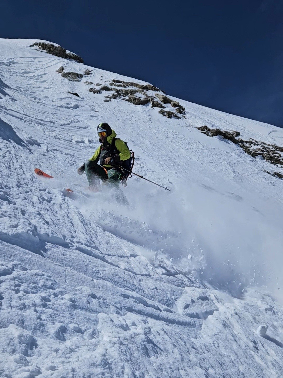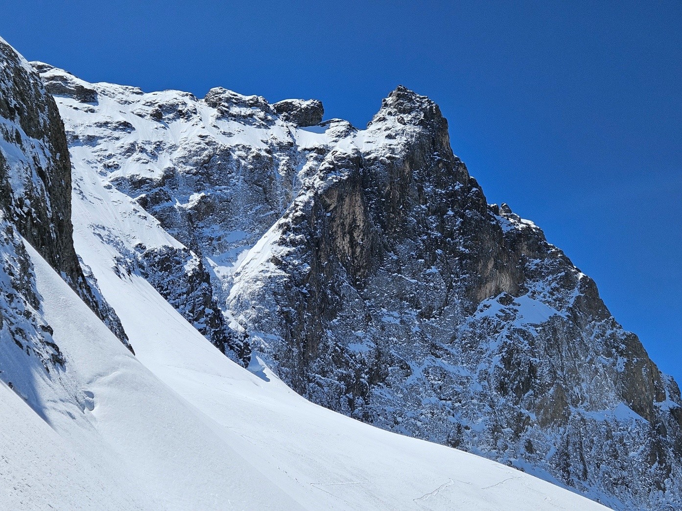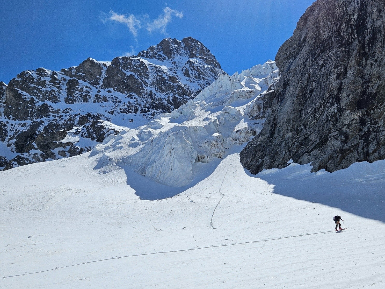 Conditions nivo et activité avalancheuse : une plaque assez imposante et toute récente partie naturellement à la rimaye située entre la Meije orientale et le Doigt de Dieu. Une accumulation purgée en skiant le goulet de transition entre la pente supérieure et le couloir inférieur des Corridors.