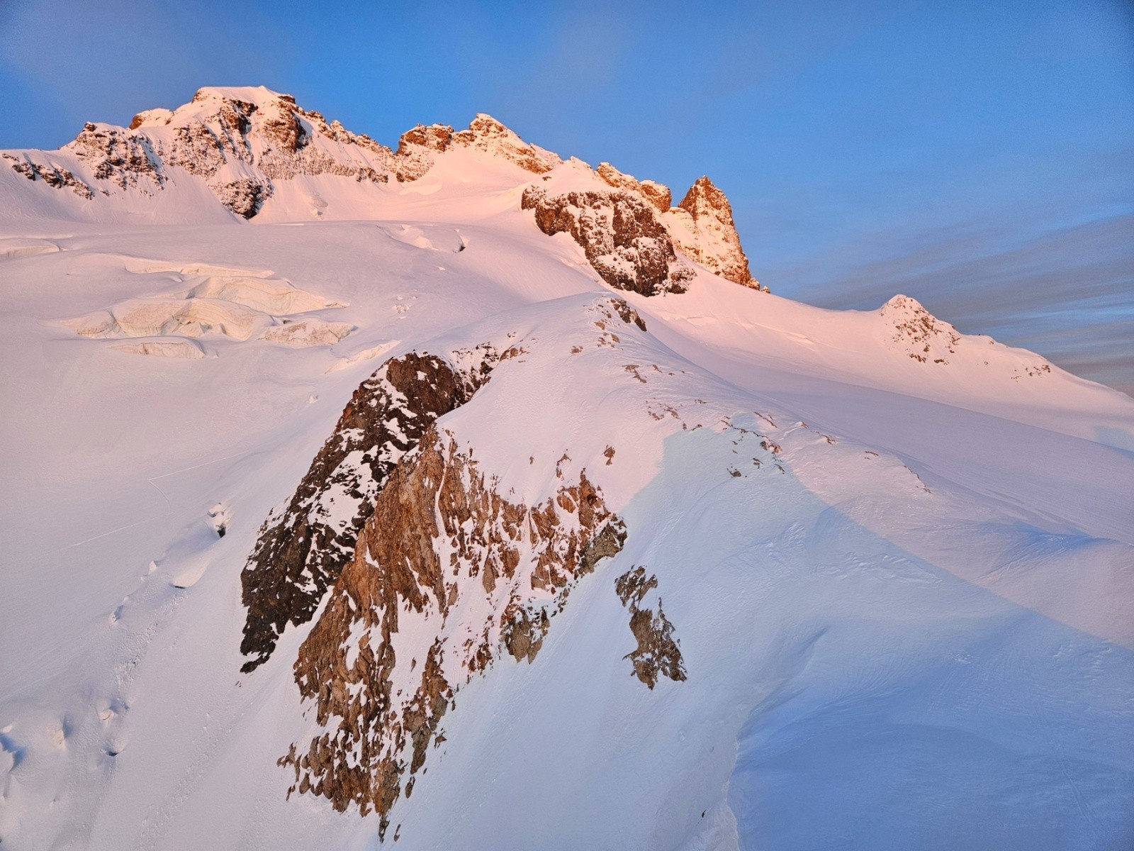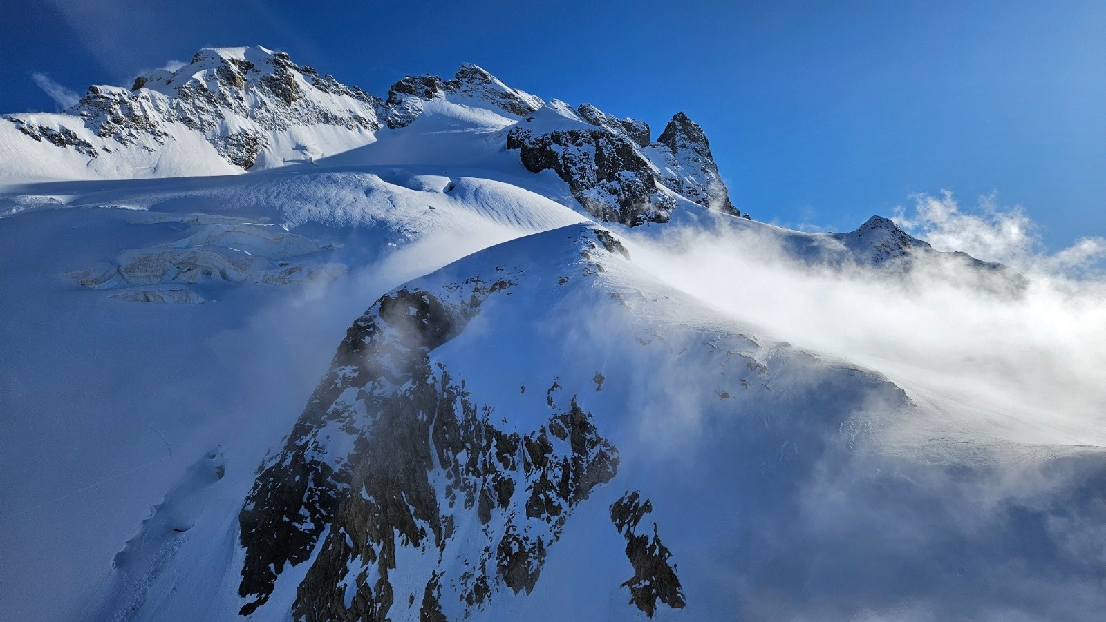 Ensuite, nous accédons à une pente large à 50°, un autre goulet sans cailloux celui-ci, une traversée à main droite et la pente sommitale en neige froide matée. Au sommet de la 3e dent (trois derniers mètres rocheux, relais de rappel à découvert), le vent est sans pitié, ma pipette a gelé à l'intérieur du sac, onglée majeure en prenant quelques photos. Il faut décamper !