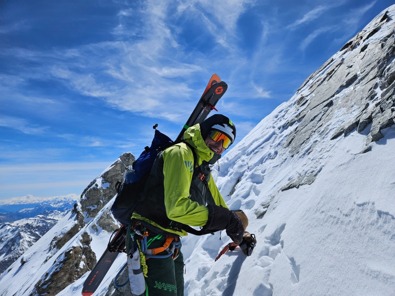 Conditions pour le ski : entre bonnes et excellentes dans la face nord des arêtes de la Meije : poudre tassée et frisottée de printemps majoritairement et neige froide lisse et matée à 3900 m. Serret du Savon : croûte gelée béton, un peu de neige fraîche tout en haut.