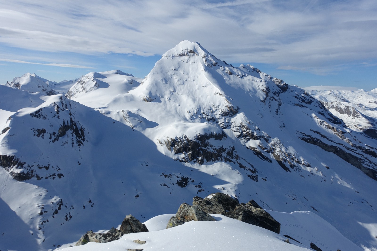 La montée est assez efficace et plutôt sympa. Les sommets alentours commencent à se cacher dans les nuages. On atteint le sommet un peu entamés. Poudre lourde sur les 50 premiers mètres puis ensuite un bonne descente en poudre dense puis transfo.