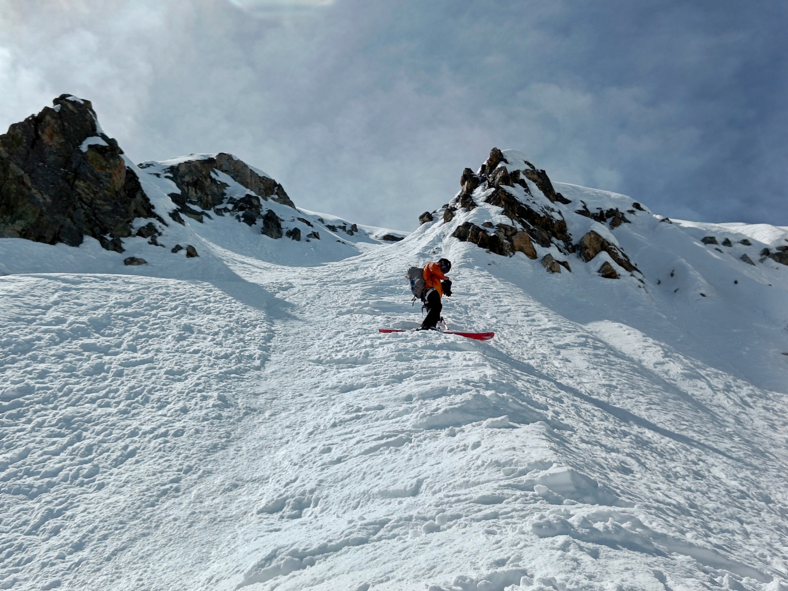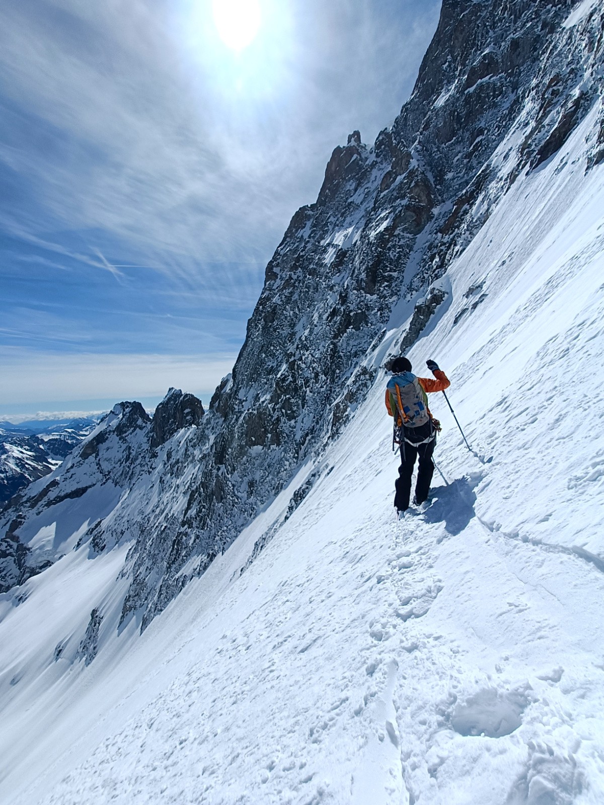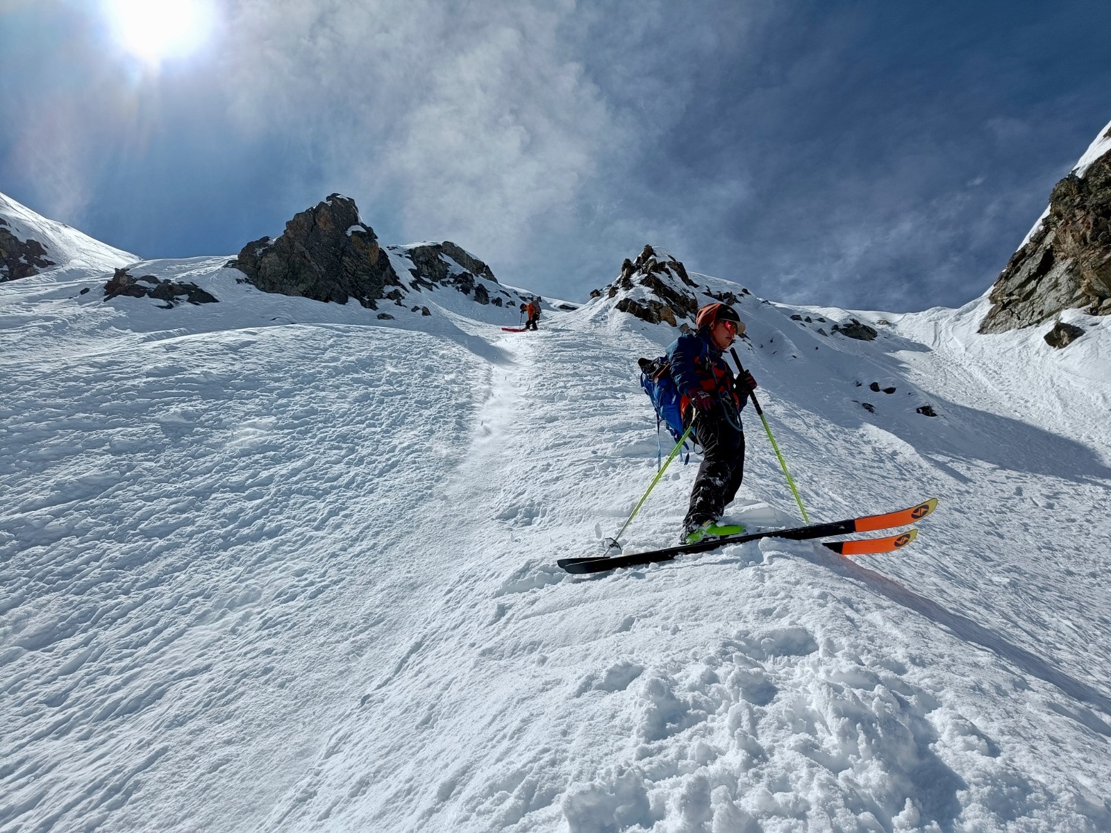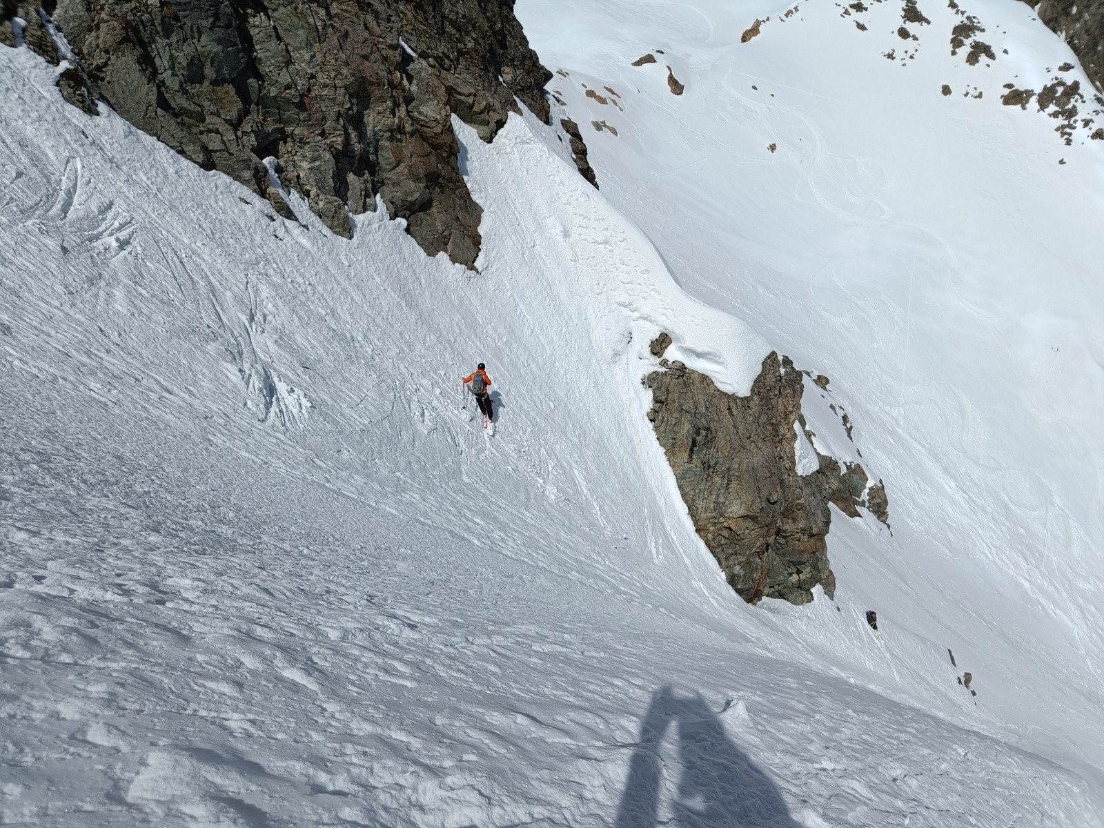 Après de longues hésitations, ne voulant pas du tout desescalader le passage qu'on vient de monter, on décide de redescendre par un autre couloir, situé entre la baïonnette et la où on est montée (cf photo). Cependant, c'est très raide et la neige est béton. Noé s'élance en premier enchaîne des virages de professionnel dans la partie haute du couloir. Johan et moi le rejoignons à notre tour et Noé repart dans une section qui sera la plus raide de la journée une petite étroiture suite auquel le couloir s'ouvre et donne lieu a plusieurs possibilités. De nouveau, on le rejoins doucement et puis on réussit a traverser vers de la neige plus ensoleillé et mieux décaillé. La suite passe mieux et on arrive vite a l'épaule. La suite est en moquette plus ou moins bonne jusqu'à l'alpage.
