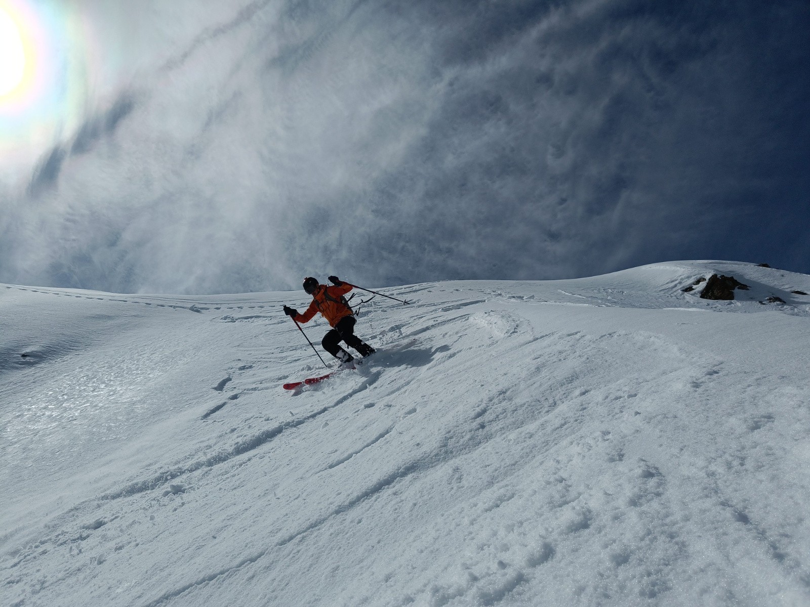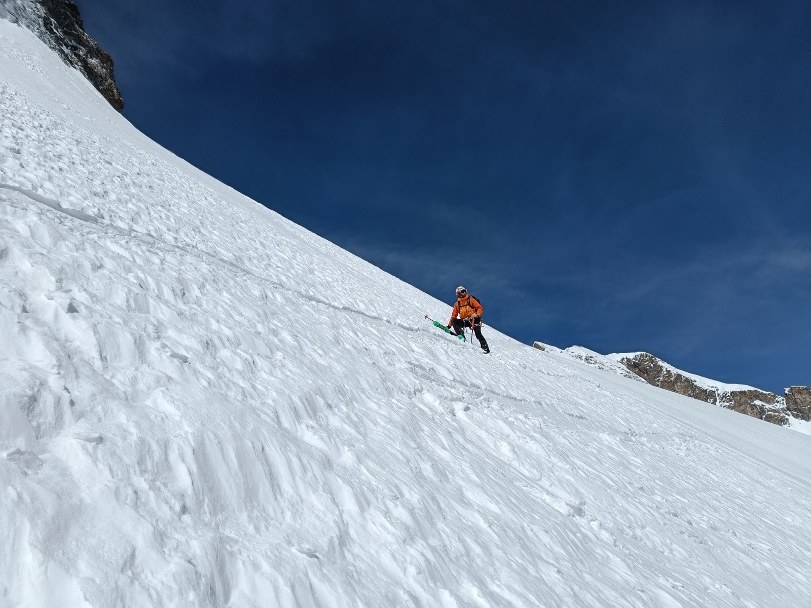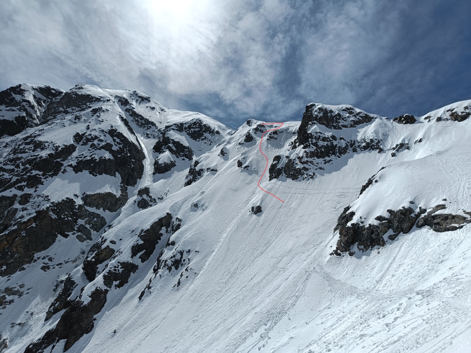 Nous avions ressenti cette descente comme un 5.3. Cependant, les conditions de neige étaient médiocres, donc en réalité c'est peu être plutôt 5.2. Il est très probable que ce bout de neige plutôt évident ai déjà été skié, mais entre nous, elle sera nommé La Paella, en lien avec les origines espagnoles de Johan (ne cherchez pas trop a comprendre).