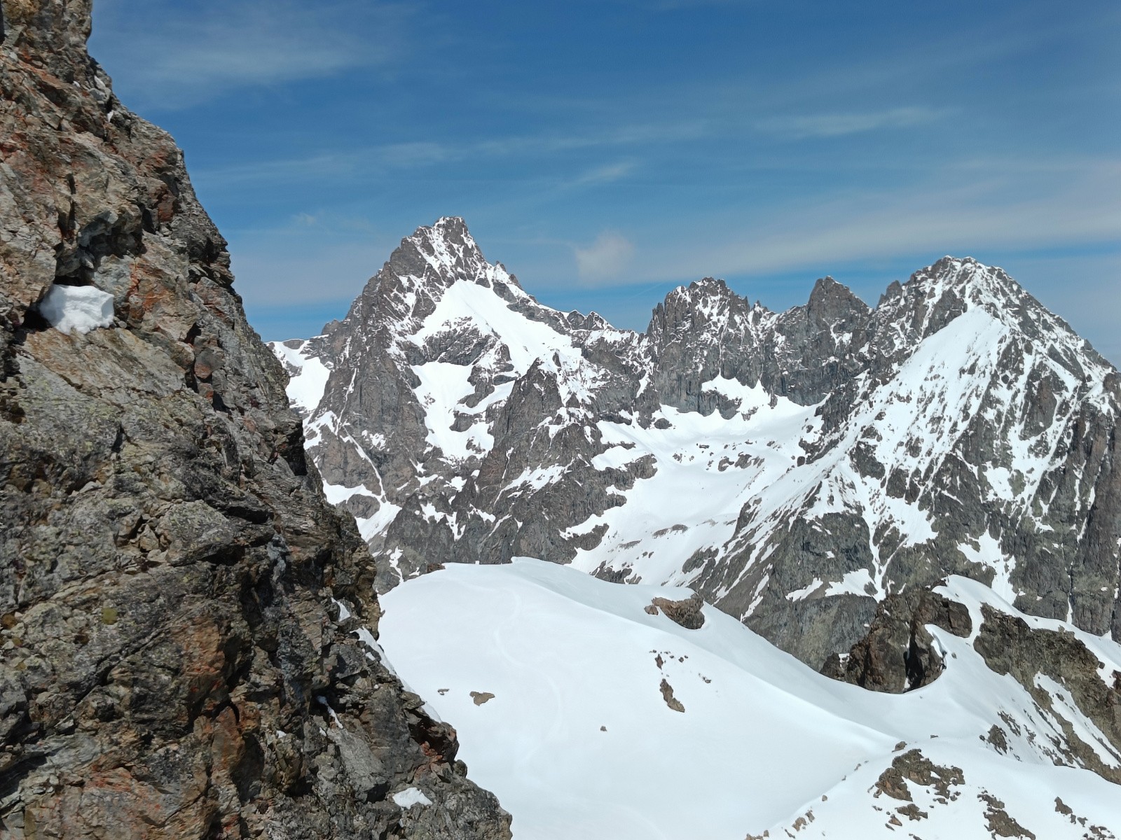 6h00 - Le réveil sonne de nouveau. Cette fois si, c'est la bonne. On se lève doucement, on mange un bout, et c'est reparti pour un peut de portage pour aller chercher la neige. Au moins, aujourd'hui, il y a un sentier qui nous mène quasiment jusqu'aux premiers névés, et de plus on peut chausser les skis en mode montée. Ainsi on remonte tranquillement jusqu'au pied du couloir de la baïonnette, qui s’avère être trop goulotté. On continue notre progression en passant par la droite dans des pentes de neige qui se transforment en couloir puis en passage de mixte un peut terrifiant pour déboucher sur les crêtes qui mènent au sommet.