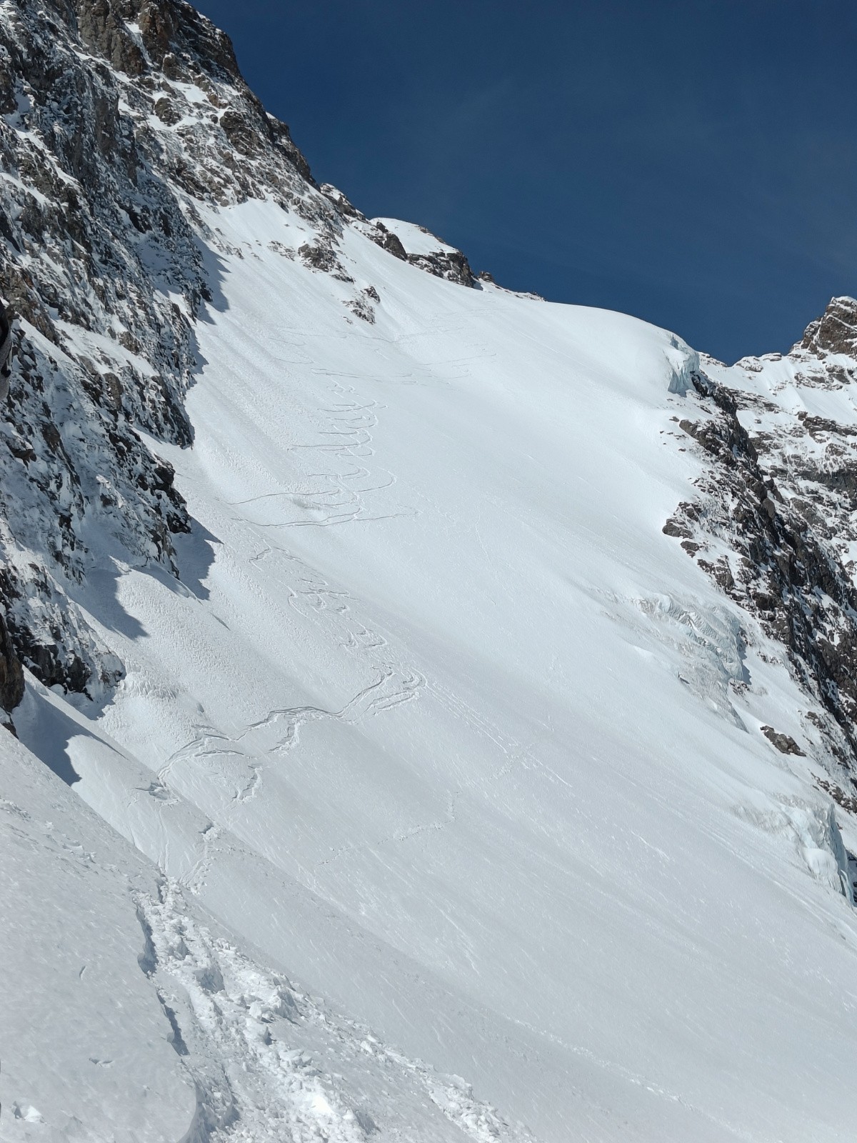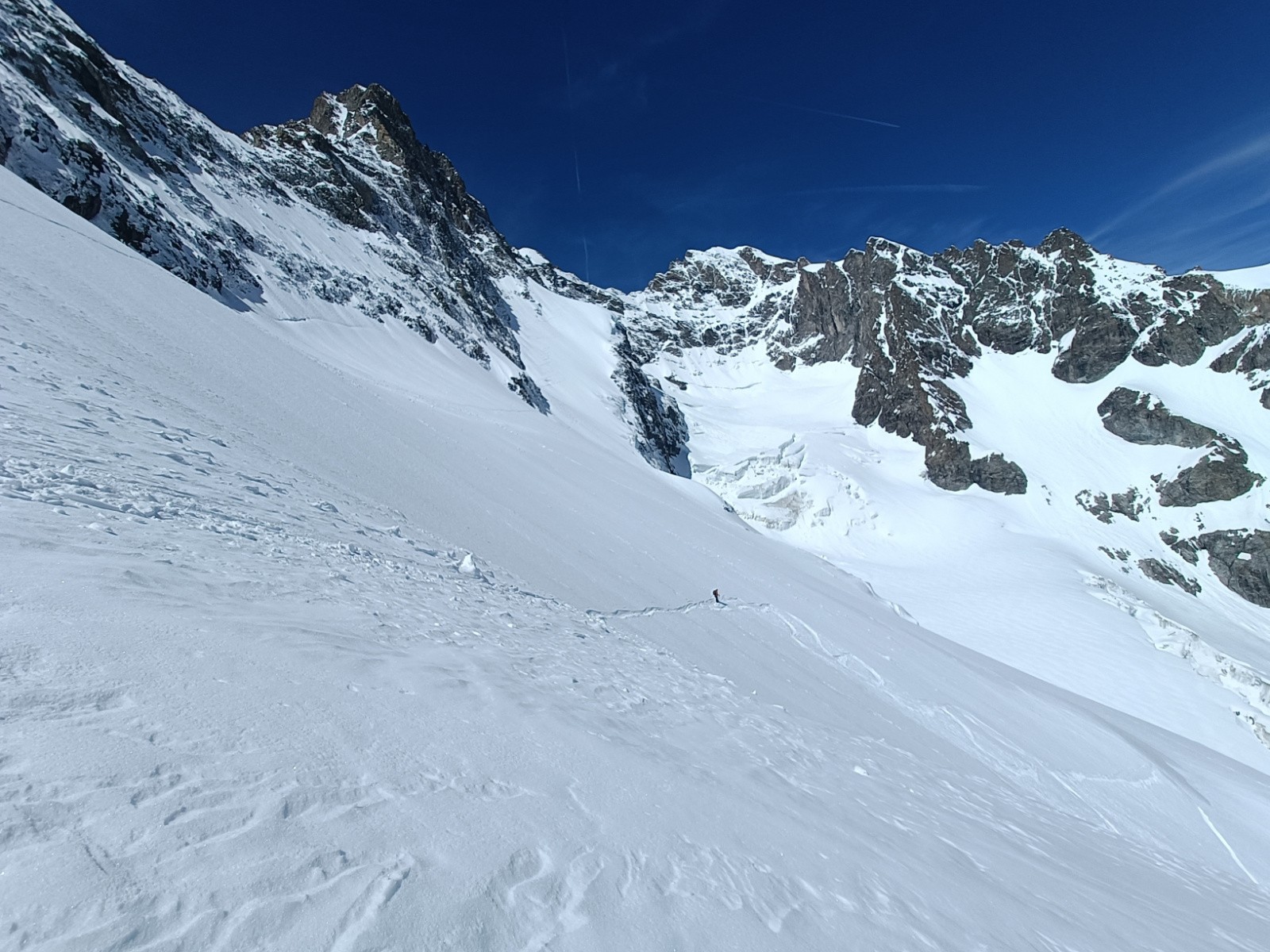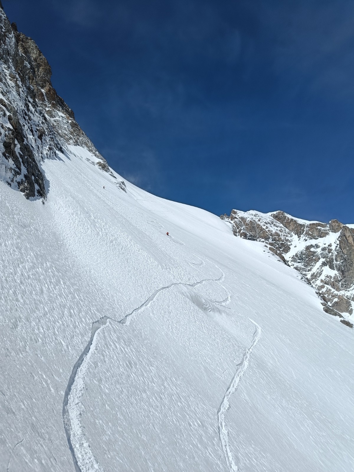 Ce n'est pas pour autant qu'on est décu, car on va tout de même skier ce glacier suspendu, d'une esthétique inégalée, exposée, et en bonne neige. Je suis curieux de savoir pourquoi si peu de skieurs y traînent les spatules. Même quand il n'y a pas les conditions pour le Pavé, c'est une pure ligne.