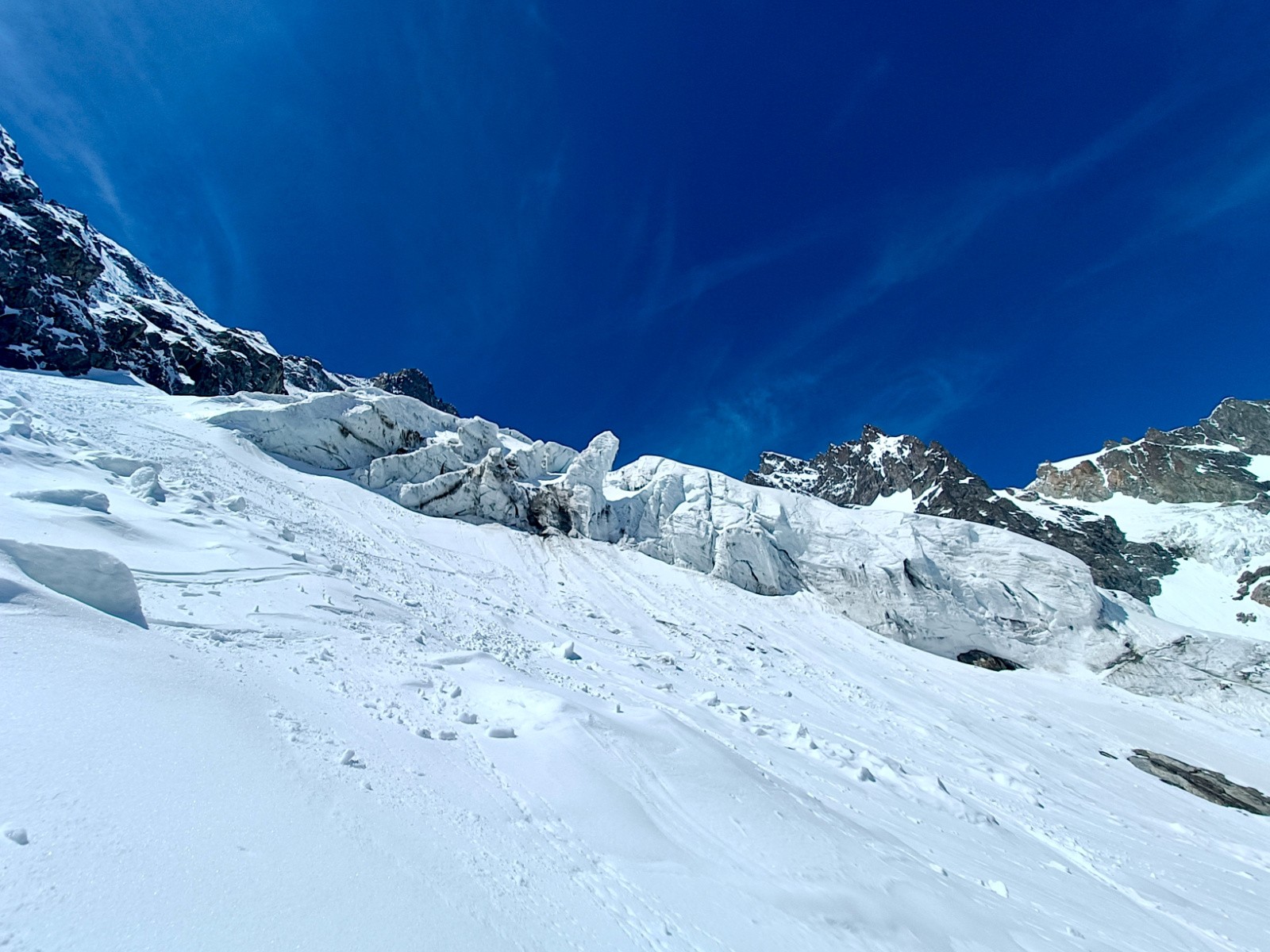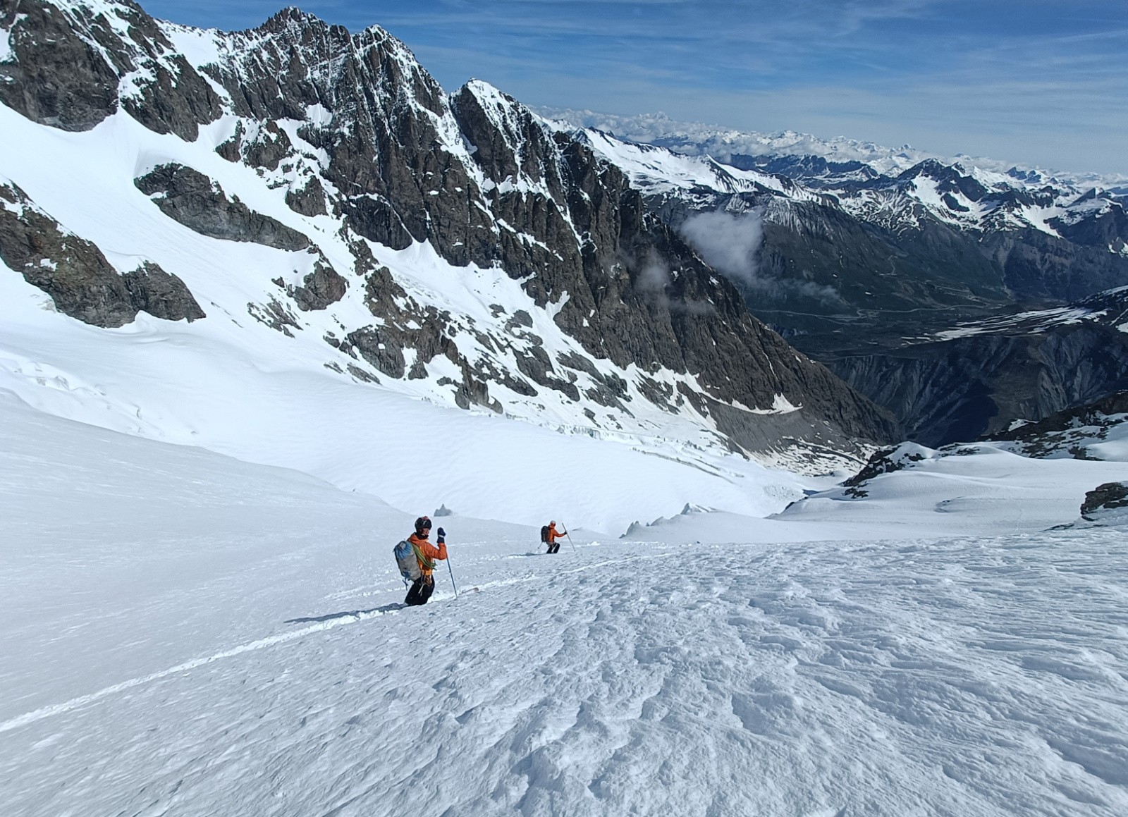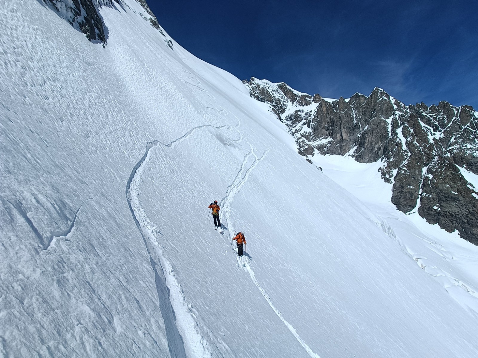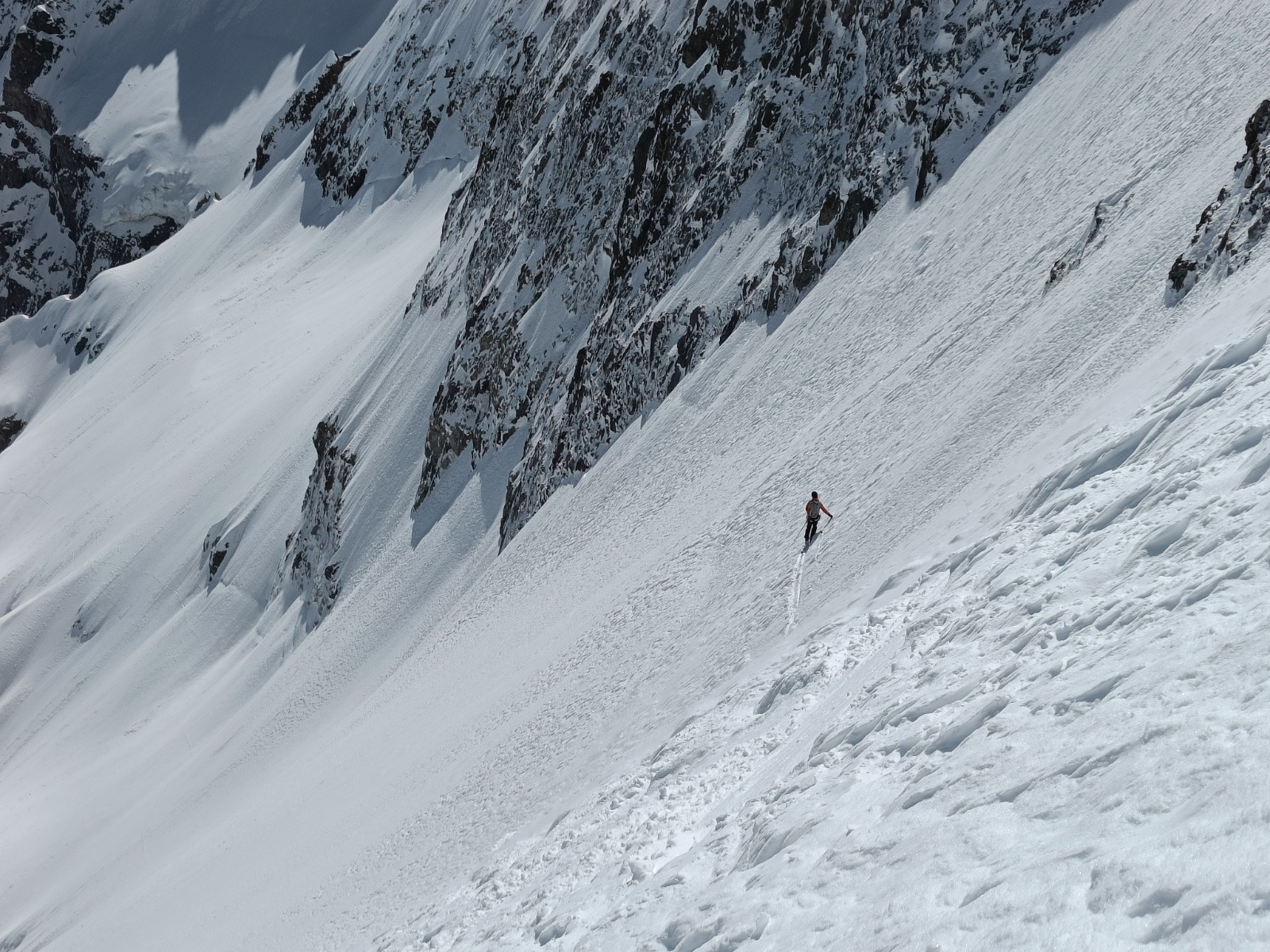 Ce n'est pas pour autant qu'on est décu, car on va tout de même skier ce glacier suspendu, d'une esthétique inégalée, exposée, et en bonne neige. Je suis curieux de savoir pourquoi si peu de skieurs y traînent les spatules. Même quand il n'y a pas les conditions pour le Pavé, c'est une pure ligne.