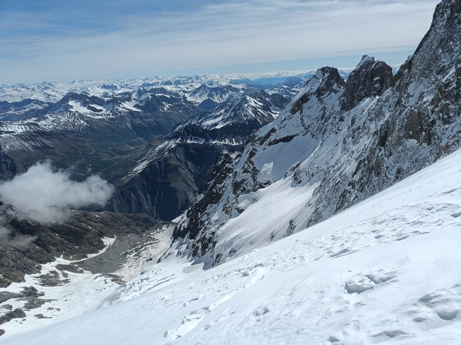 On attaque ensuite le glacier supérieur du Lautaret, l'ambiance est folle sur ce bout de glace suspendu au dessus du vide, sous l'imposante face nord du Pic Gaspard encore saupoudré de neige fraiche. La neige sous nos pieds est bonne. Cependant, on commence a fatiguer et la remontée du glacier parait interminable. D'abord une longue traversée, puis une longue montée, le tout au dessus de 3000. Je commence a payer les 3 semaines de cours sans aller en montagne.