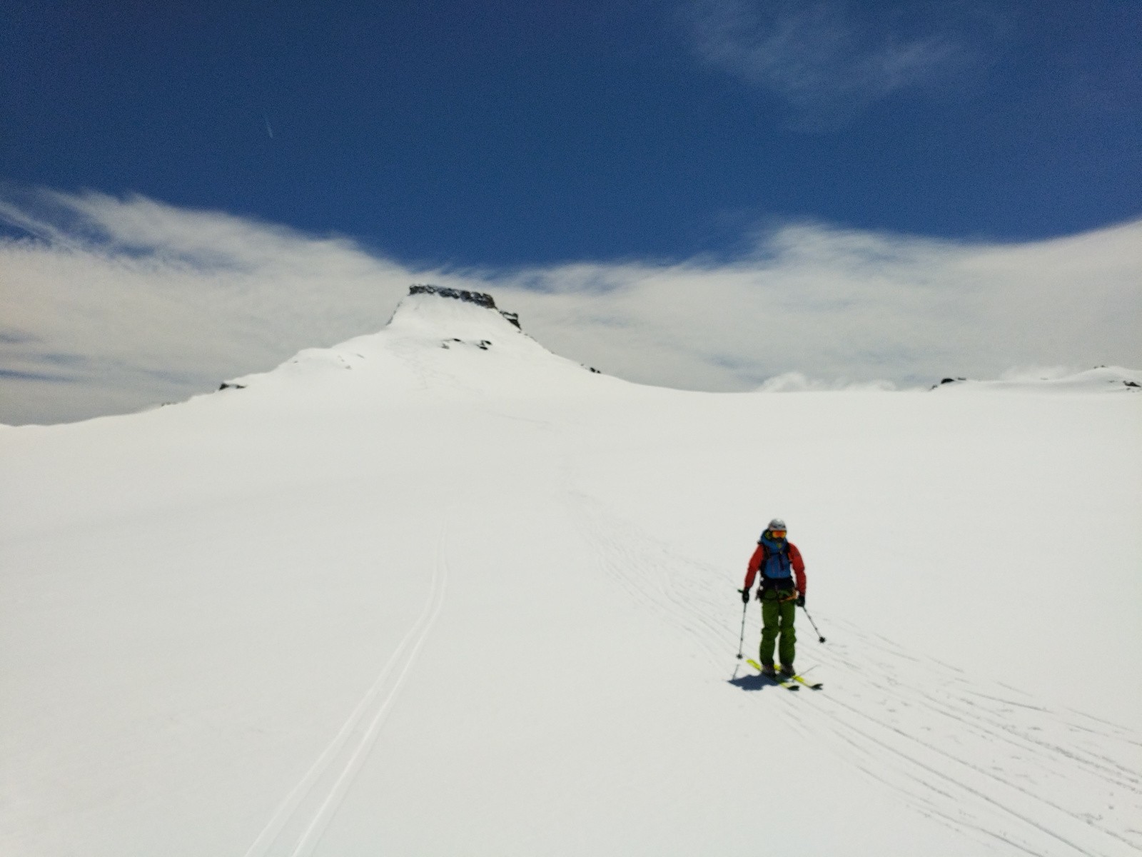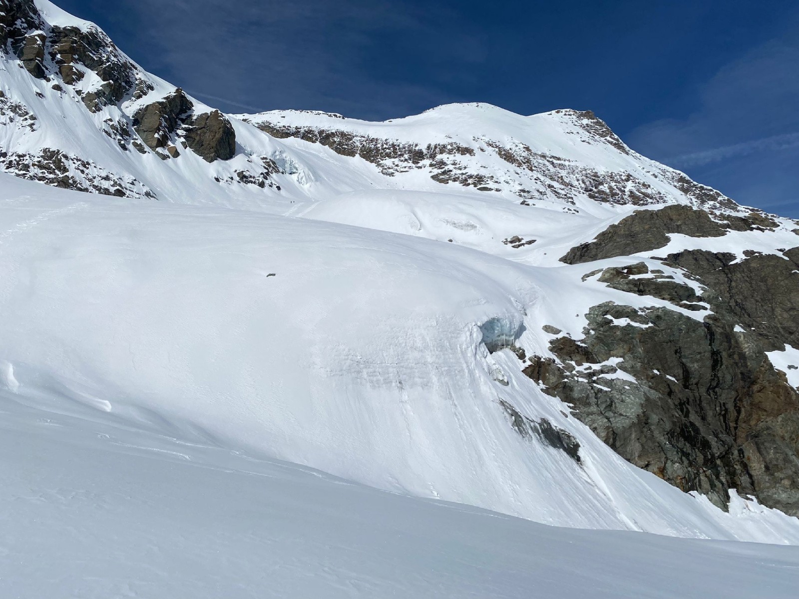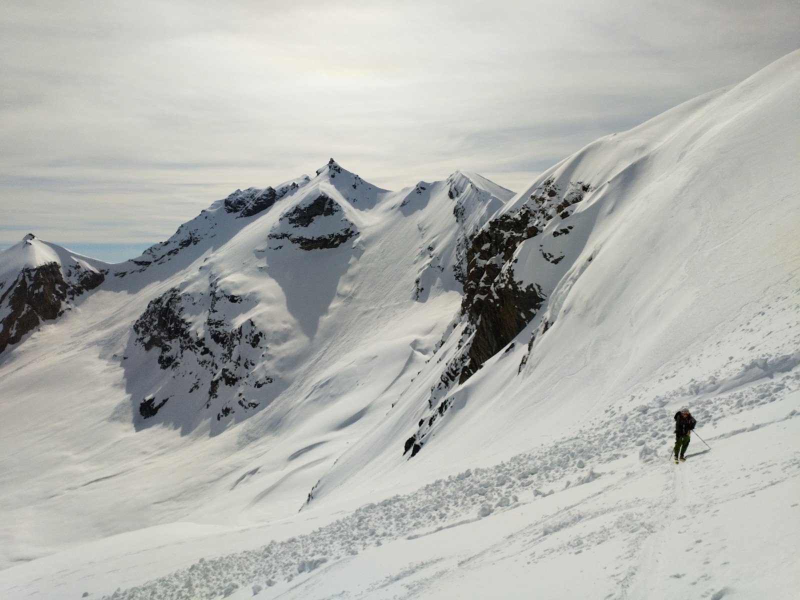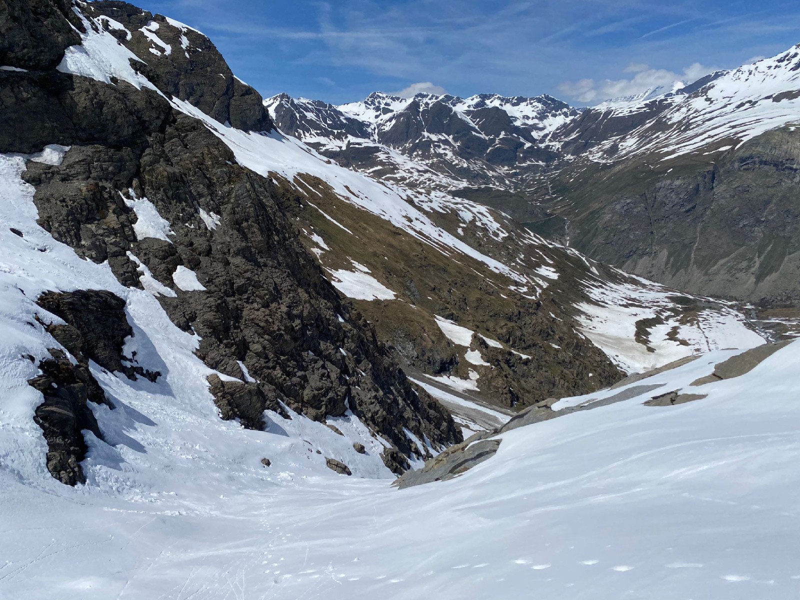 On avait bien lu qu'il ne fallait pas tirer à droite tout de suite pour ne pas atterrir dans les séracs du glacier inférieur donc on est resté bien à gauche, direction le col du grand fond. Une fois le glacier inférieur laissé à notre droite on s'est laissé glisser vers le vallon qui finit dans le goulet final. Tout ceci nous a mené sur un bombé dont les pentes nous ont paru un poil pentues et exposées pour pas grand chose.