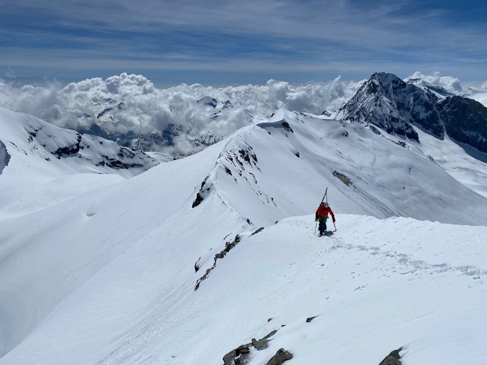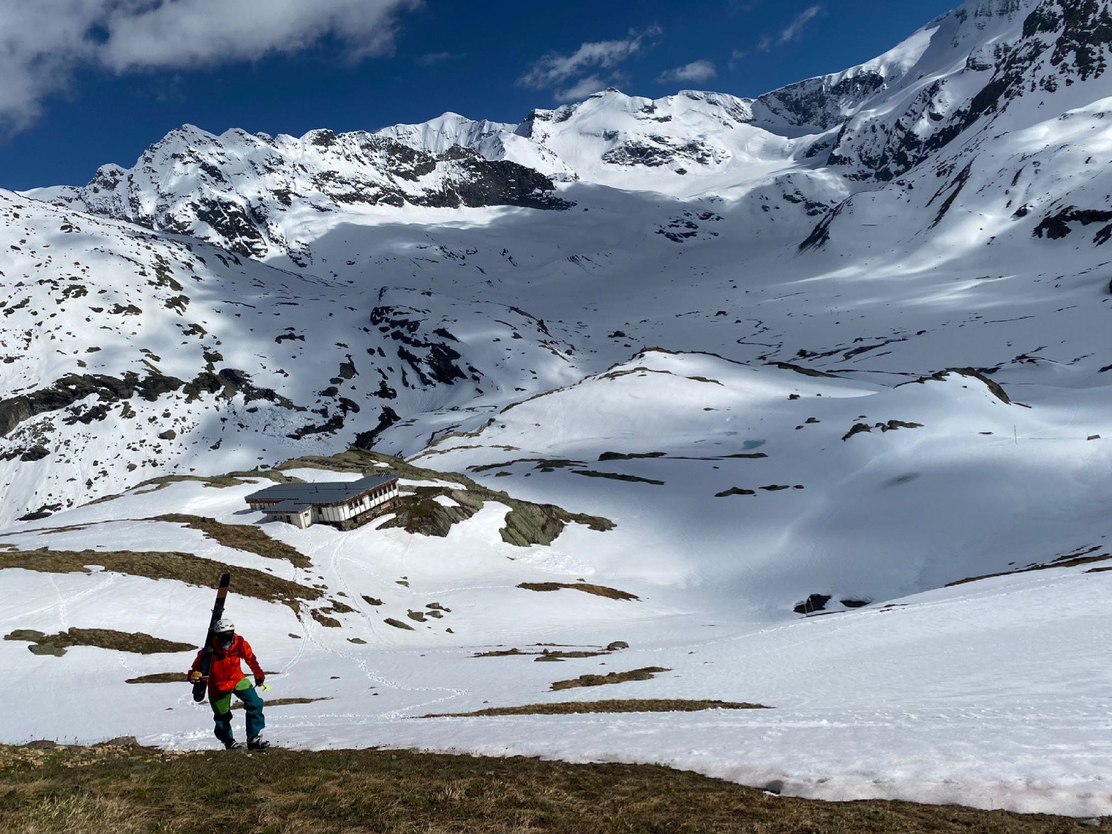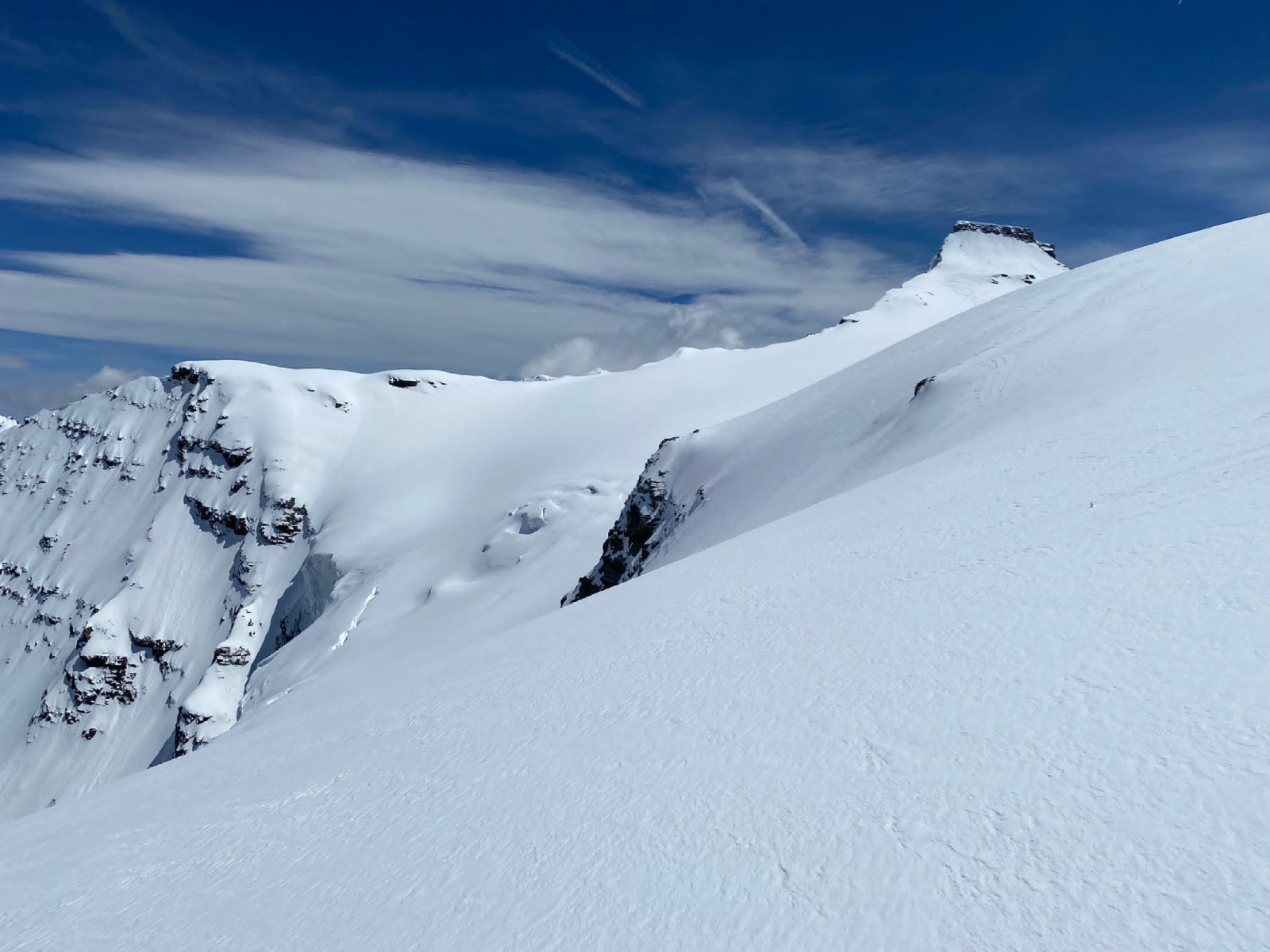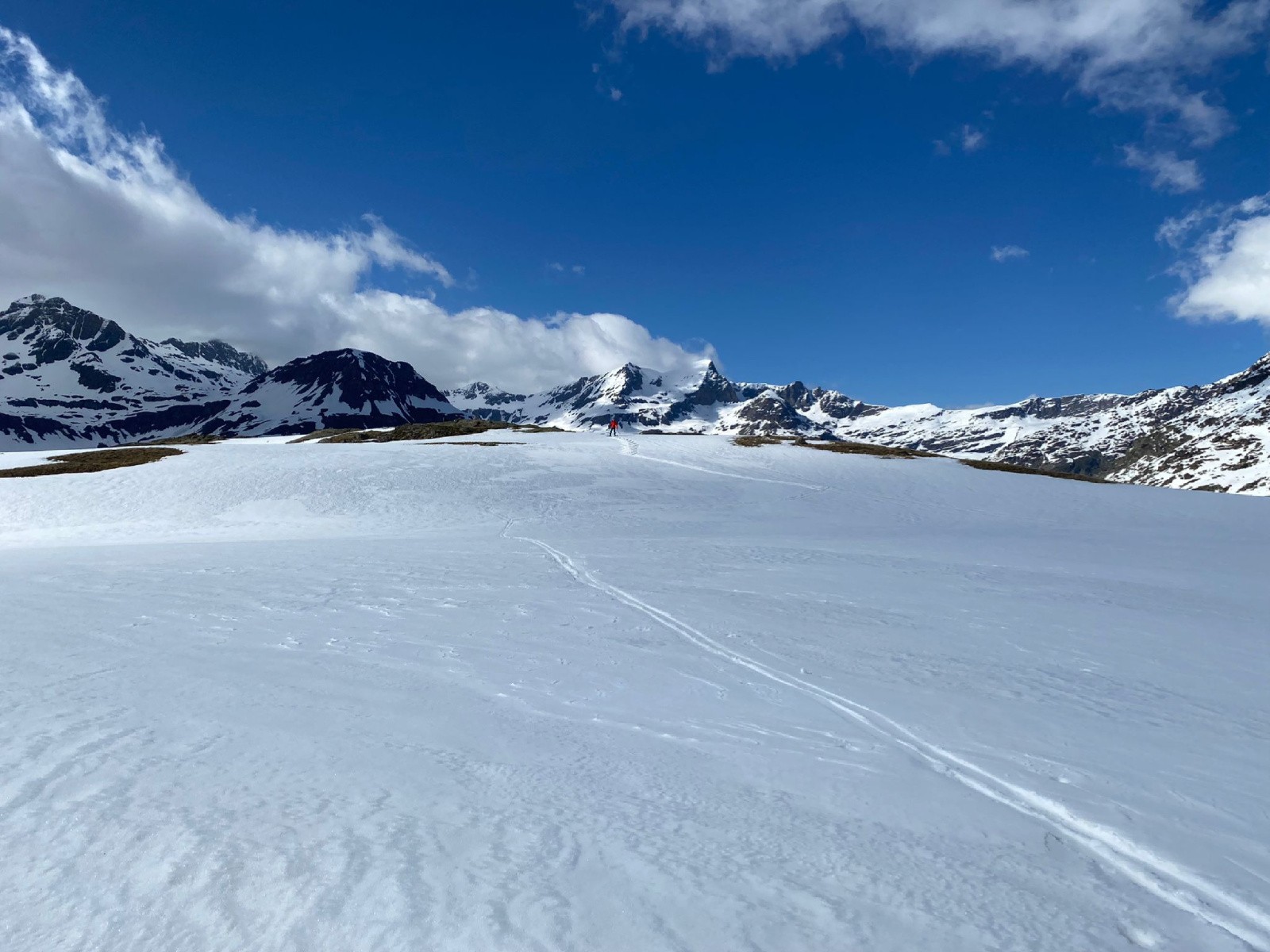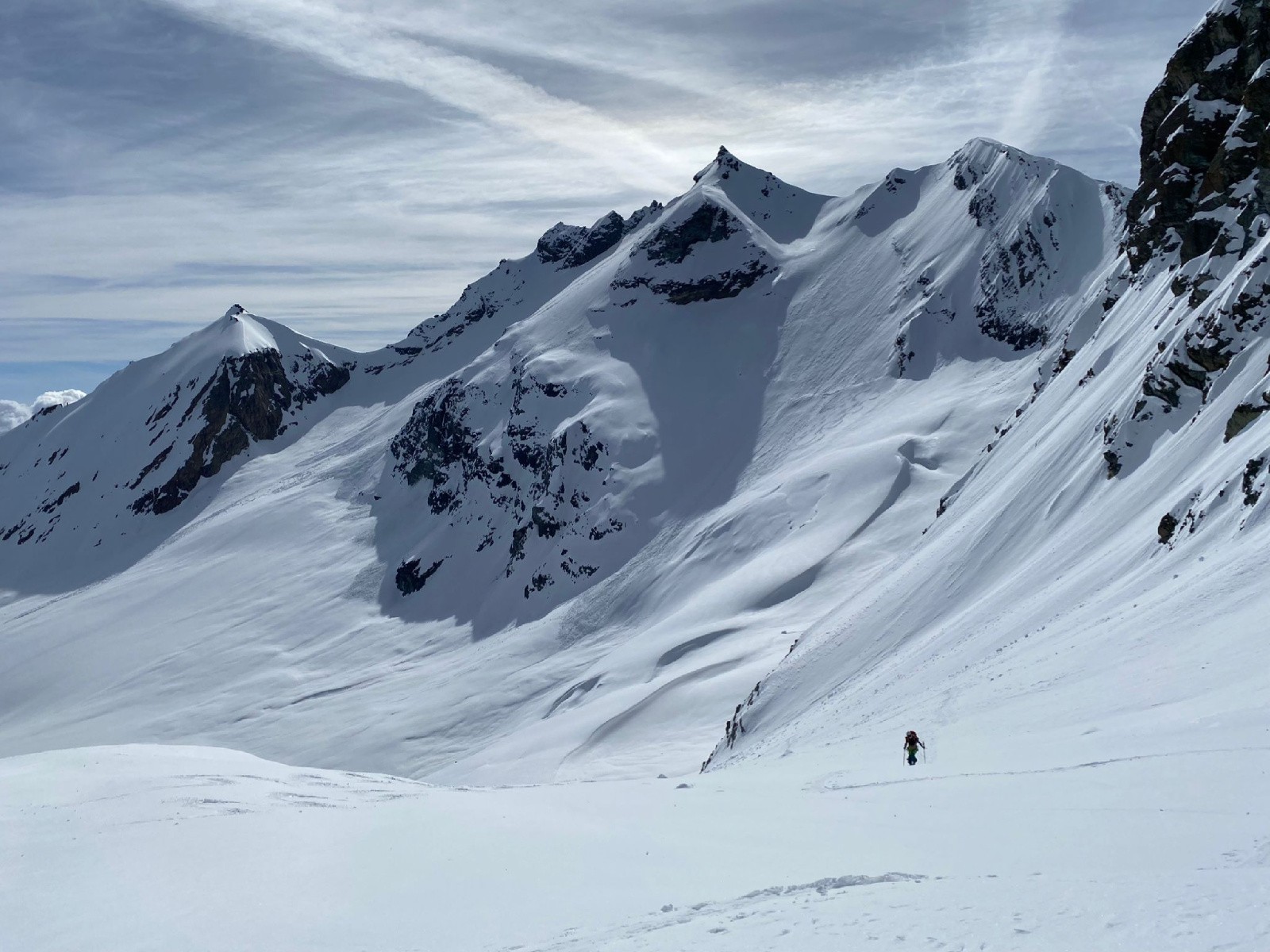 On avait bien lu qu'il ne fallait pas tirer à droite tout de suite pour ne pas atterrir dans les séracs du glacier inférieur donc on est resté bien à gauche, direction le col du grand fond. Une fois le glacier inférieur laissé à notre droite on s'est laissé glisser vers le vallon qui finit dans le goulet final. Tout ceci nous a mené sur un bombé dont les pentes nous ont paru un poil pentues et exposées pour pas grand chose.