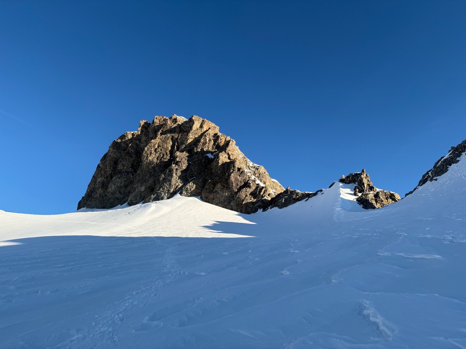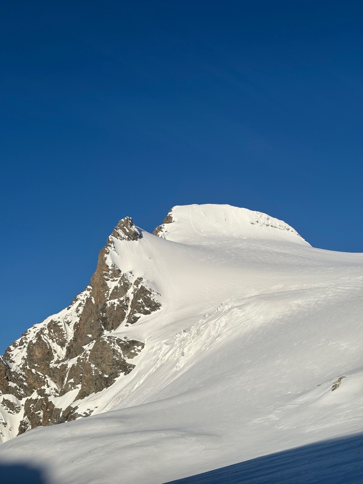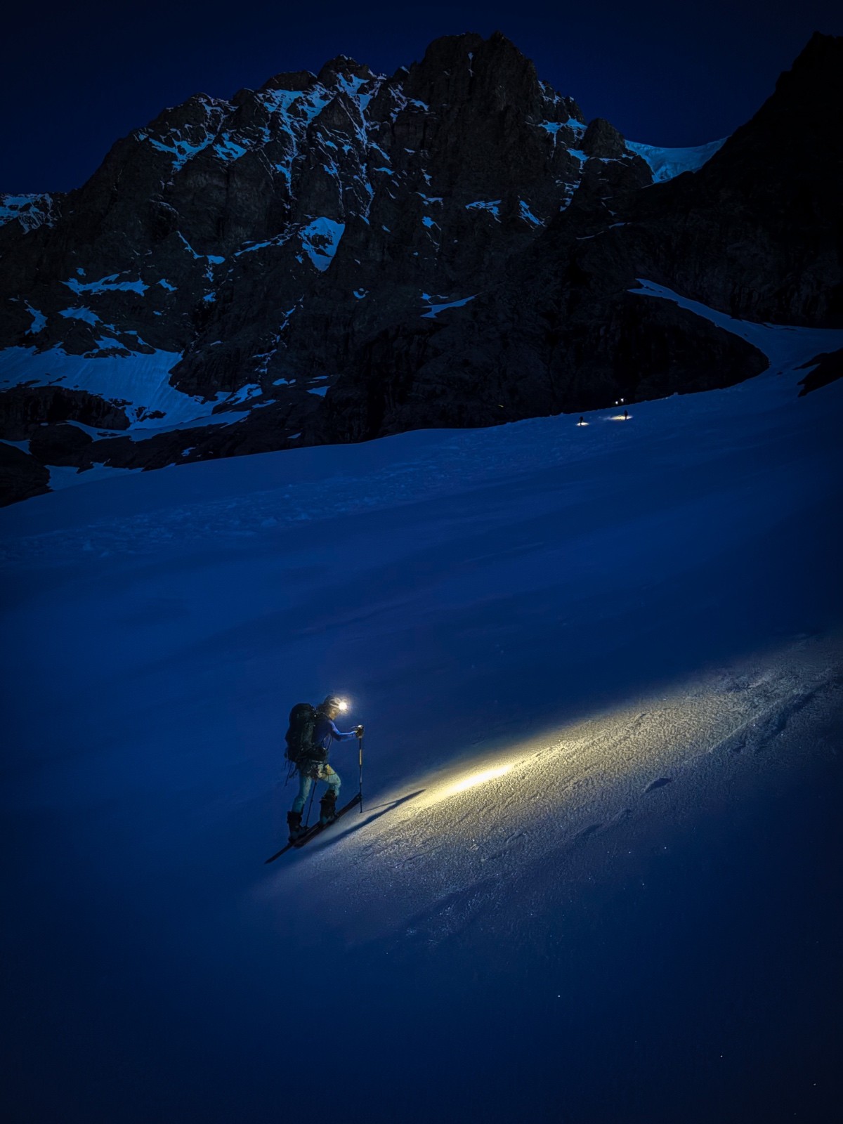 Lever à 3h15. Tout le monde s’active déjà autour. On se prépare et on arrive à partir à 4h comme prévu, malgré le bazar ambiant. On marche 5 min en portant les skis, puis on grimpe un peu plus haut que les marcheurs pour pouvoir faire toute la traversée à skis sans déchausser. Les premiers mètres sont un peu impressionnants car la pente est forte, tout est gelé. Mais finalement, avec les couteaux, ça accroche bien. On se félicite d’avoir repéré l’itinéraire la veille car il n’y a pas un pet de lune pour nous éclairer ! Tout se passe bien pour la traversée. On rejoint une première grosse équipe en bas de la gorge. On grimpera avec eux cette partie, pas très agréable car il faut passer sur une ancienne coulée. Ils passent mieux à pieds mais on se réconforte en pensant à notre descente tout à l’heure ! Le jour se lève. On arrive au pied du verrou vers 6h. On déchausse, on passe en crampons/piolet et c’est partie pour la petite grimpette. Aucune difficulté, les marches sont déjà prêtes ! On profite juste de l’instant. On prend pied sur le glacier, on repasse à ski et on s’encorde. Le soleil se lève ! La partie sur le glacier est très peu pentue, panorama à 360 magnifique ! Le sommet est proche. On arrive au pied de la dernière pente. On déchausse et on repasse en crampons/piolet. Encore une fois, aucune difficulté même si c’est légèrement plus raide. Les marches sont déjà faites, on kiffe la vue ! Arrivées au sommet à 8h, on croise les deux premières cordées qui entament la redescente. On savoure la vue, la joie d’être là !