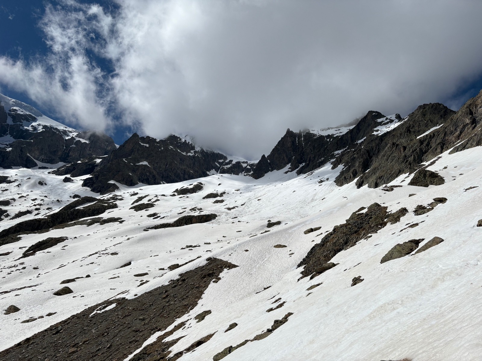 Le sentier jusqu’au refuge est bien sympa, on peut observer le torrent en dessous. Quelques névés à passer, dont un (le premier) qui tire franchement la gueule. Je passe au travers. Forte de mon expérience récente, on cherche un endroit plus safe pour traverser le deuxième, car en dessous de celui ci, c’est le gros torrent et on a pas envie de tomber dedans ! Vers la fin de la montée, on tombe à nouveau sur des névés. A noter que si on suit bien le sentier, on n’a pas besoin de les traverser. Mais évidement c’est pas ce qu’on a fait ! On l’a regretté après.. arrivée au refuge à 14h. Le refuge est déjà complet. On attrape deux trois couettes et on s’installe sous une table dans la salle commune. Bivouac top confort dans notre petite grotte. On profite de l’aprem pour travailler des manips sur les pentes de neige à côté de refuge. Le soir, on essaie tant bien que mal de coordonner toutes les équipes au départ pour la même course. Des cordées arrivent encore. On est plein à craquer. Finalement on se décide pour un départ à 4h, entre deux cordées. Dans tous ces groupes à prendre en compte, on serait parties à 5h pour profiter des meilleures conditions de neige.