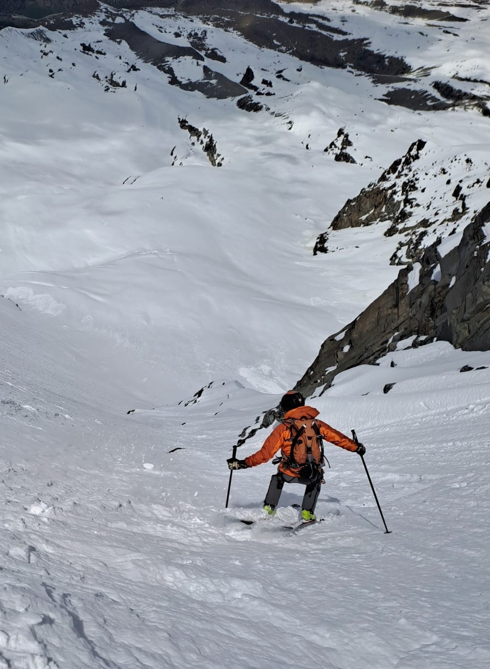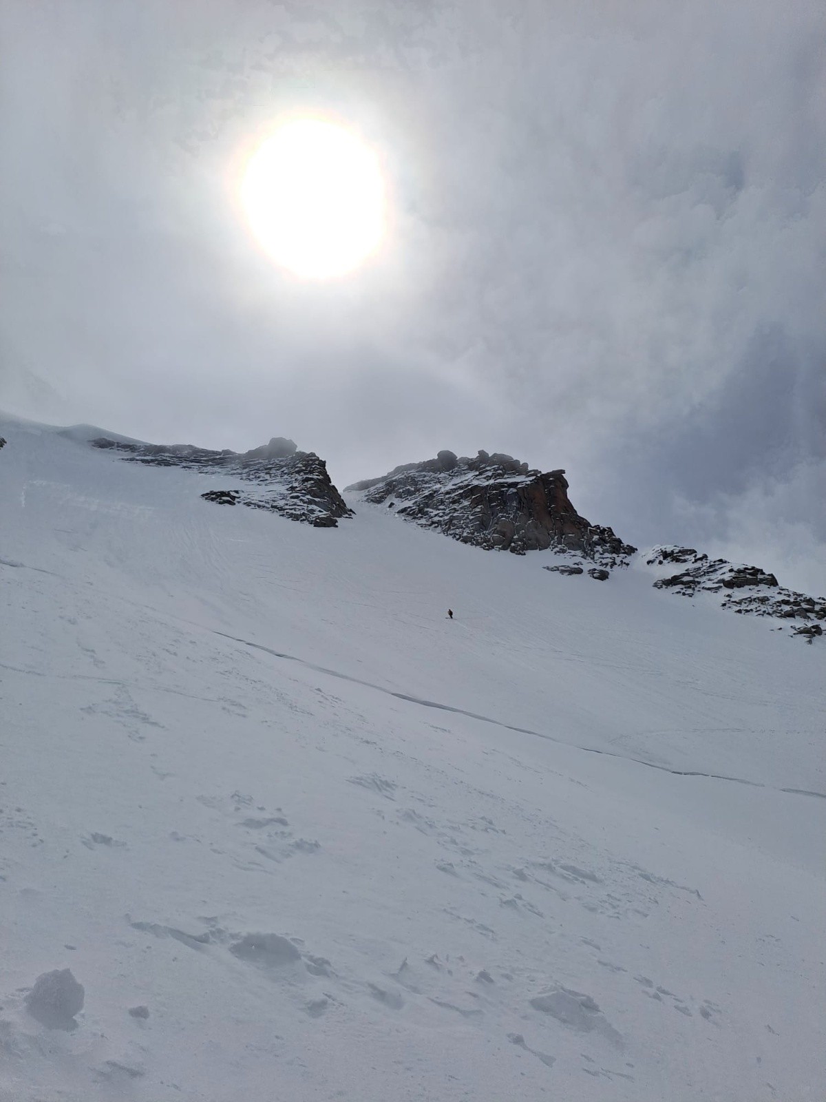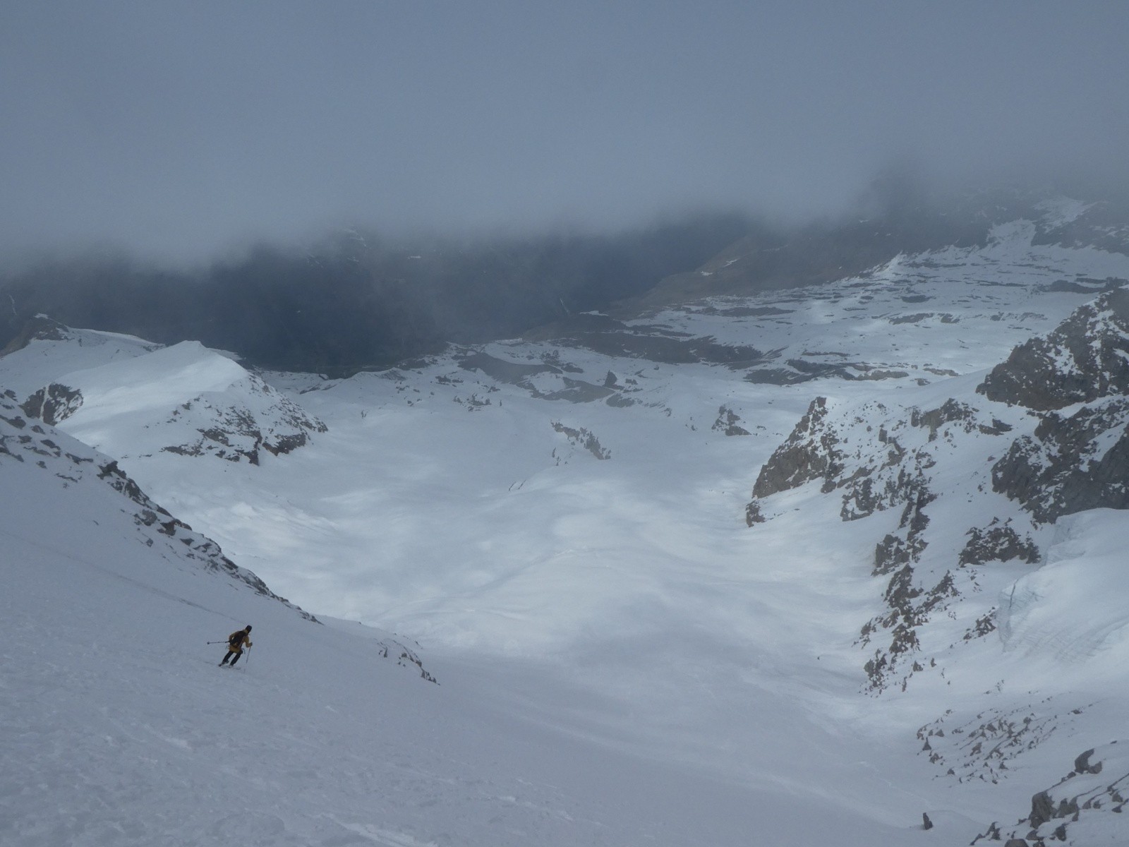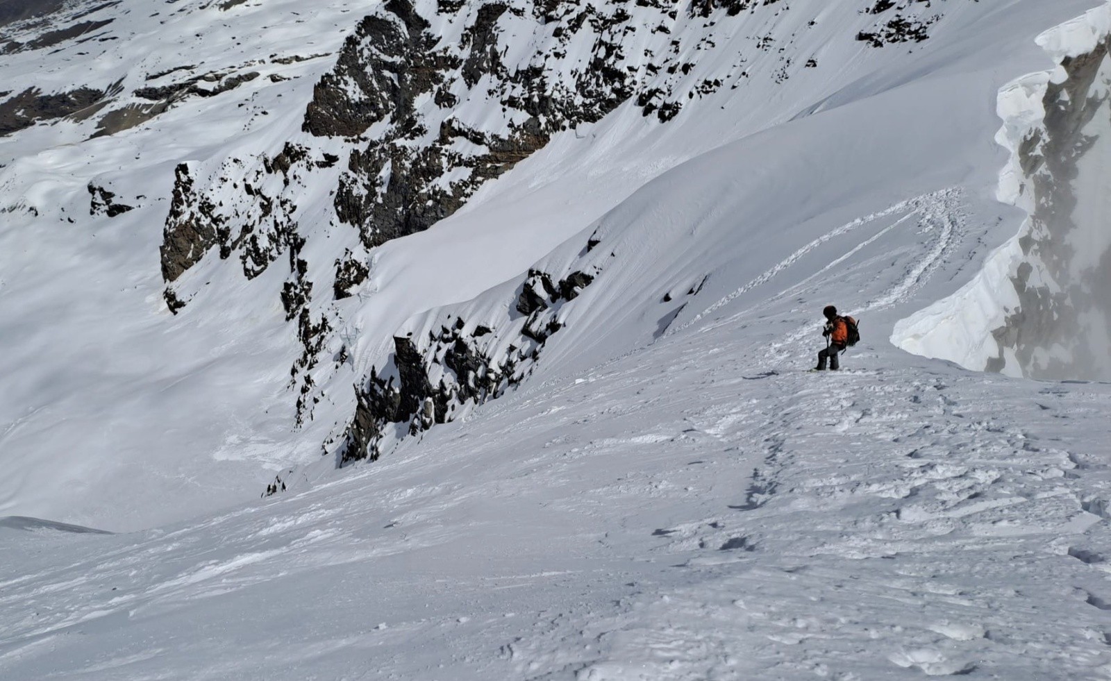 Arrivée à la partie plus technique. On voit à gauche le skieur, en sécurité mais en position malcommode