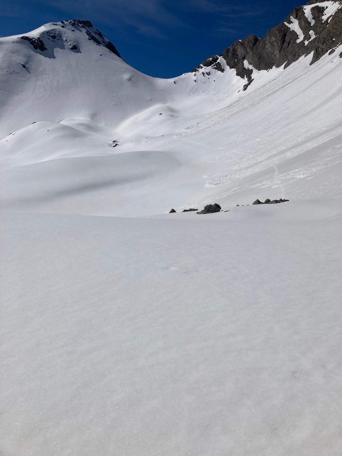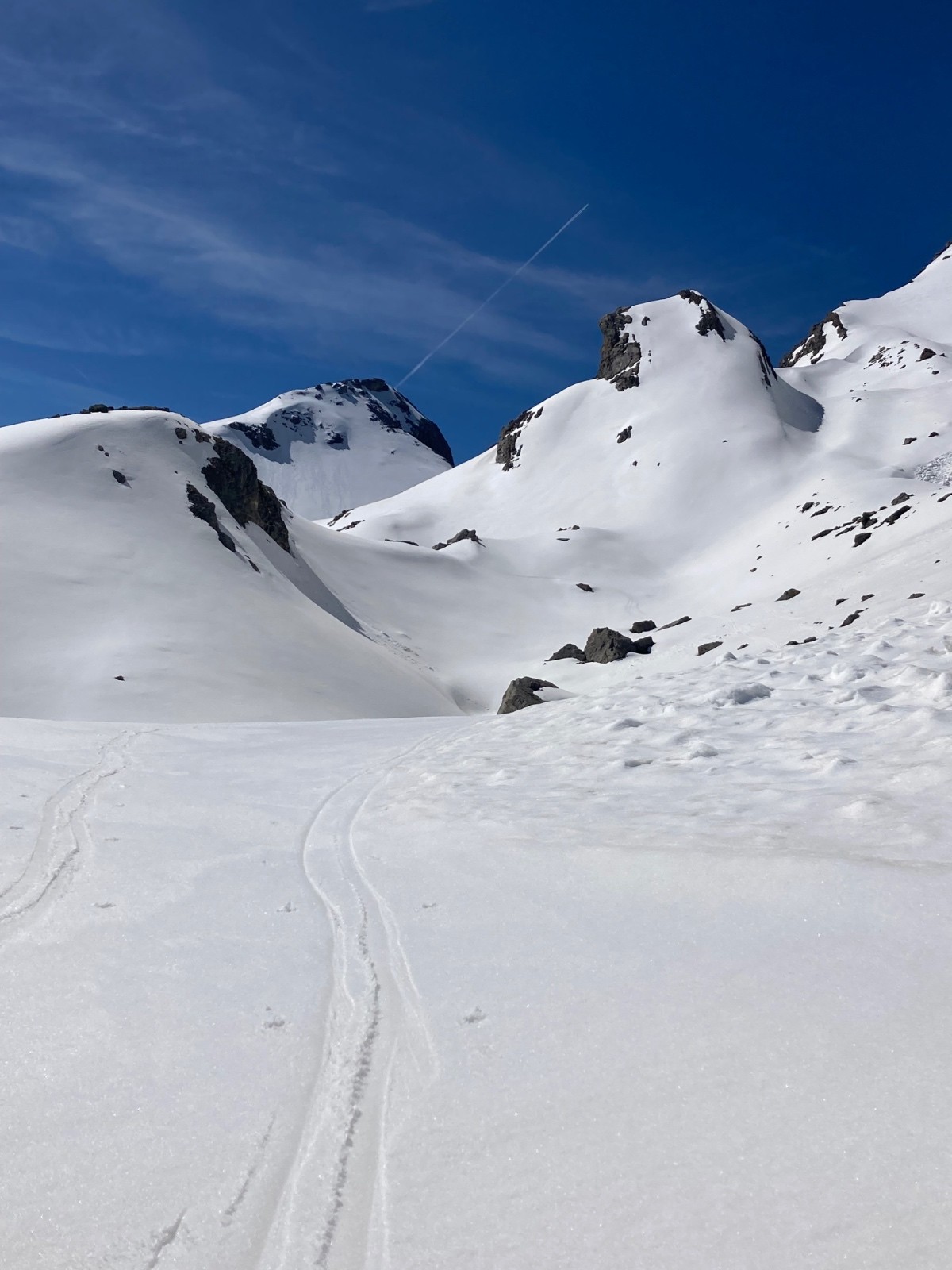 Après une pause nous descendons vers 11h45, moquette sous le sommet puis belle transfo dans cette magnifique pente sommitale. Nous descendrons un peu dans le vallon du lausanier jusque vers 2500, toujours bien enneigé, même sous le pas de la cavale. Remontée au pas de la petite cavale, descente excellente de sa face sud puis remontée à pelousette, un peu difficile à cause de la neige tombée jeudi soir qui ramollie n’adhère pas à la sous couche.( merci à la trace du skieur monté plus tôt).