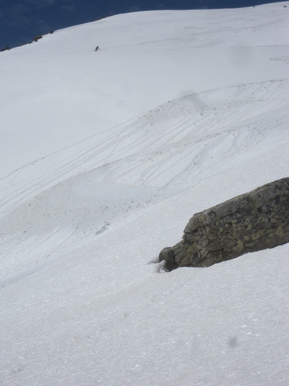 J’aperçois un skieur, vu peu après nous dans voga qui descend pelousette par un couloir.