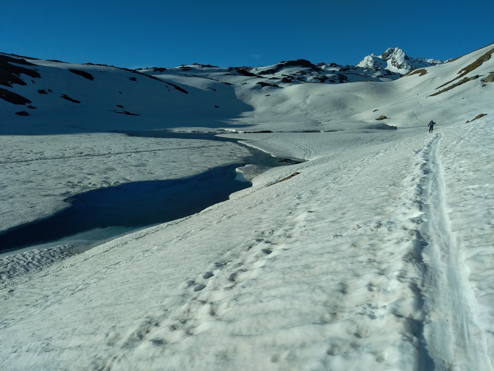 Retour en montant du refuge jusqu'au sommet du télésiège du Rouet... descente par la combe sous les Perrons pour éviter de pousser et aussi d'aller jusqu'en bas sur la piste de retour au col