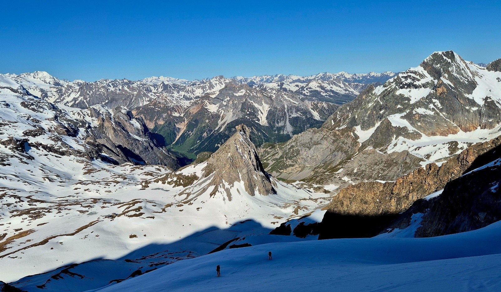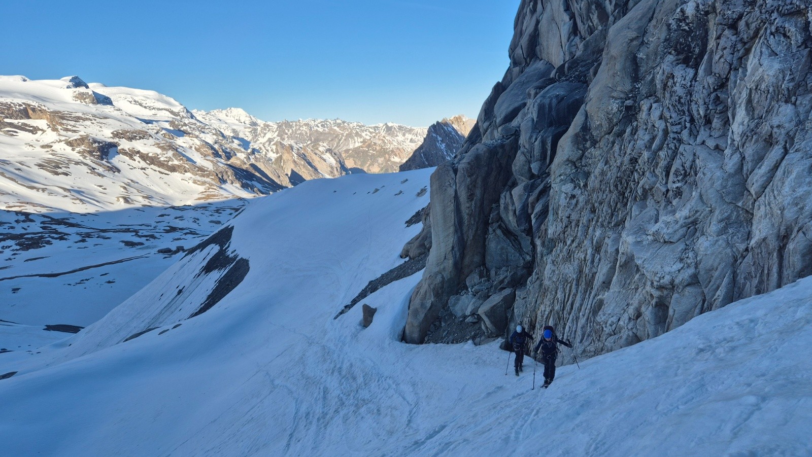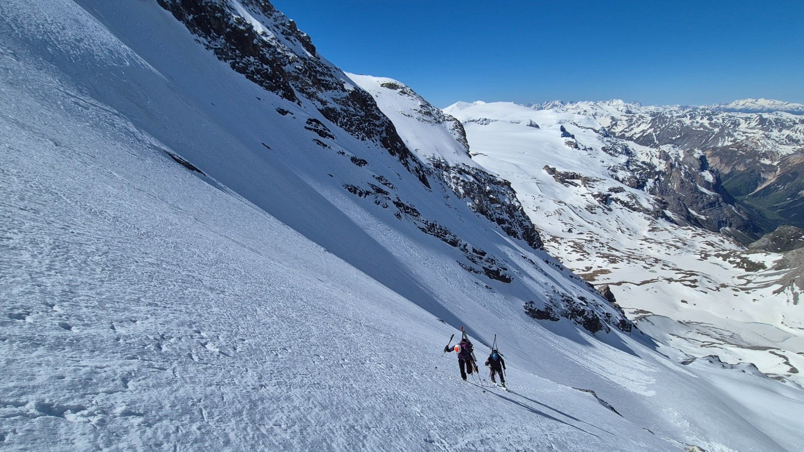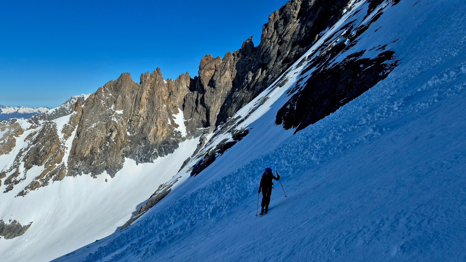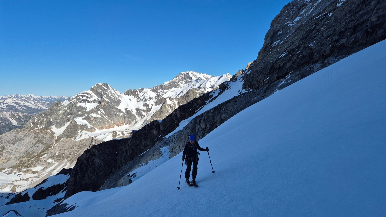 J2 depart tardif a 6h30. On veut pas etre trop tôt dans la descente du haut pour laisser le soleil decailler un peu la pente finale. Montee ok en rive droite. Quelques passages un peu expo bien raides limites en couteaux sous 3300 (quelques cordees mettent les crampons). La partie raide passe bien en.crampon piolet en neige dure le matin. Superbe montée ! Arrivé sur la crete, je vais faire un tour vers le les départs en FN. Les conditions ont l air excellentes. Ca me fait bien envie mais je reste sage ...Des traces partout pourtant en petite FN, dans la FN directe et plusieurs aussi dans les Italiens ou les skieurs se sont manifestement faits plaisir (incroyable de voir le haut du couloir avec pas mal de traces de ski malgré la raideur !!!)