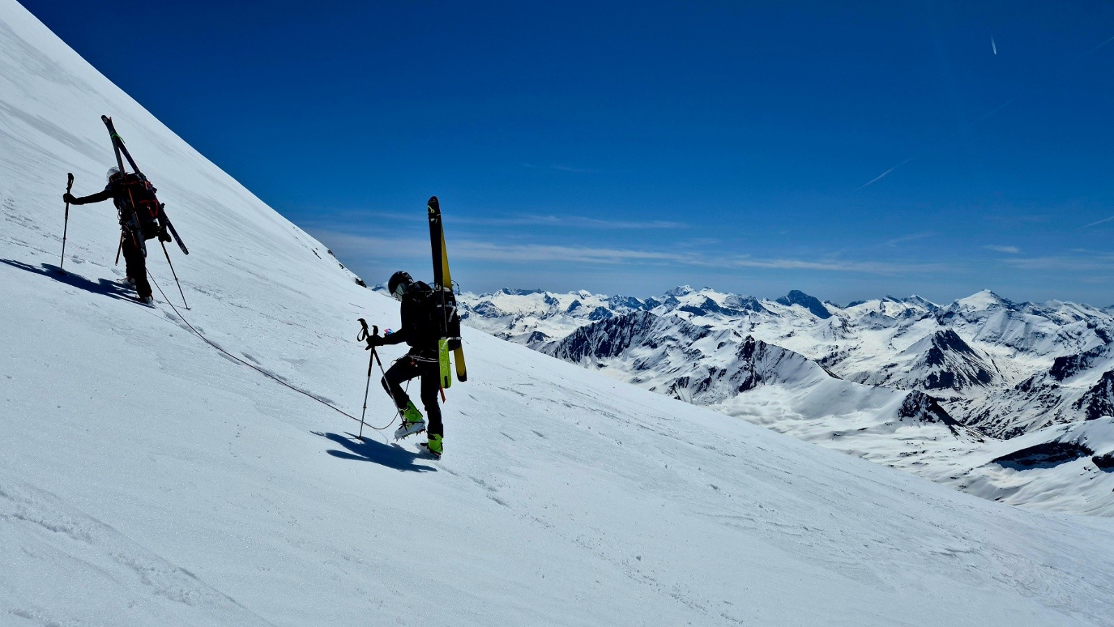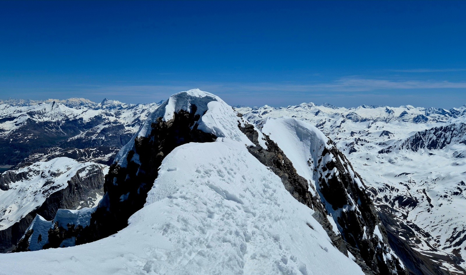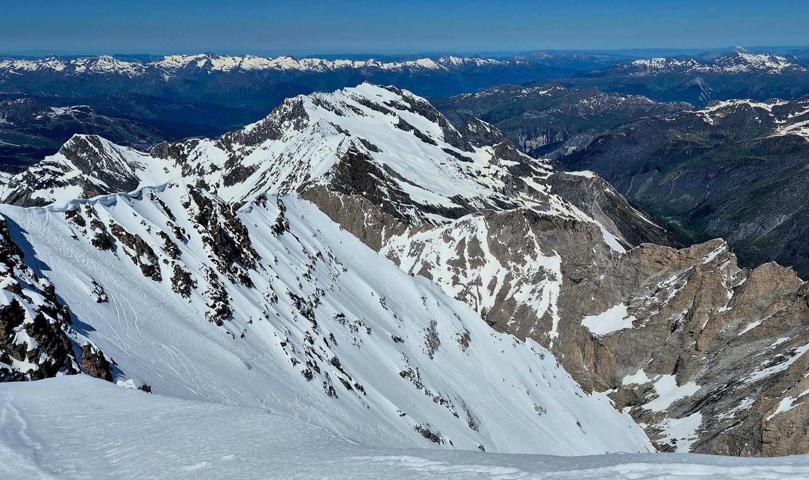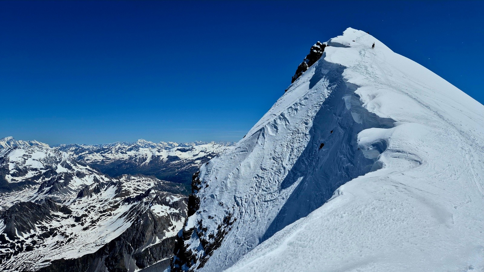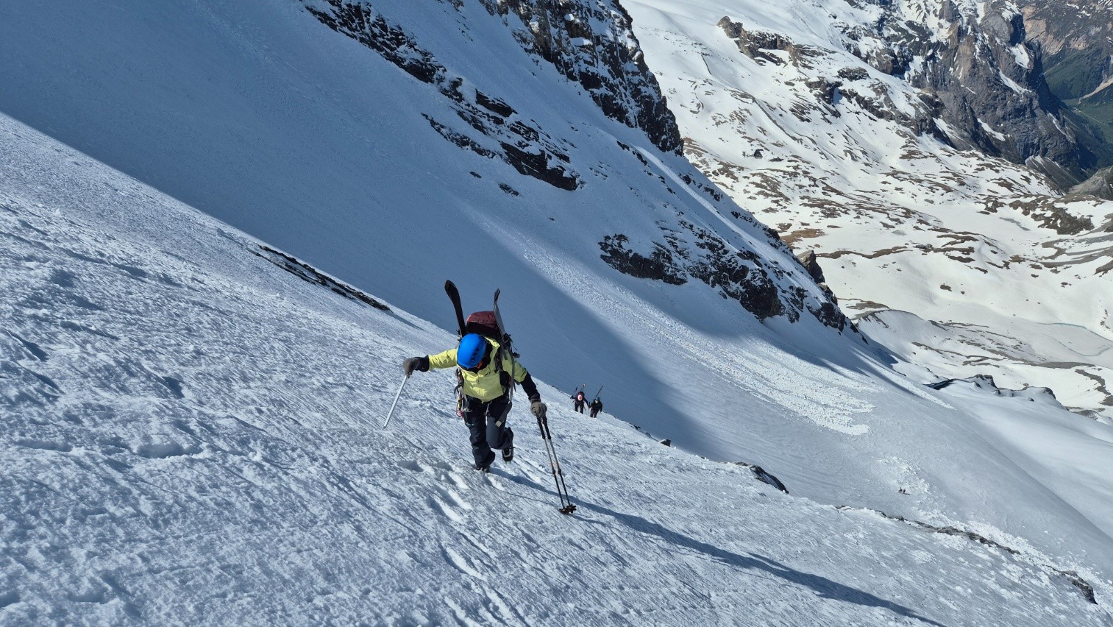 J2 depart tardif a 6h30. On veut pas etre trop tôt dans la descente du haut pour laisser le soleil decailler un peu la pente finale. Montee ok en rive droite. Quelques passages un peu expo bien raides limites en couteaux sous 3300 (quelques cordees mettent les crampons). La partie raide passe bien en.crampon piolet en neige dure le matin. Superbe montée ! Arrivé sur la crete, je vais faire un tour vers le les départs en FN. Les conditions ont l air excellentes. Ca me fait bien envie mais je reste sage ...Des traces partout pourtant en petite FN, dans la FN directe et plusieurs aussi dans les Italiens ou les skieurs se sont manifestement faits plaisir (incroyable de voir le haut du couloir avec pas mal de traces de ski malgré la raideur !!!)