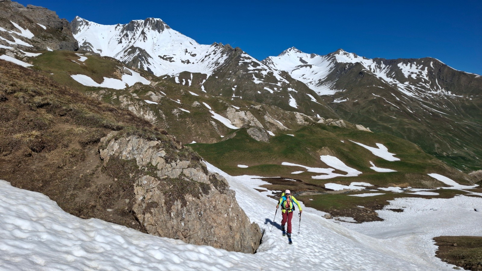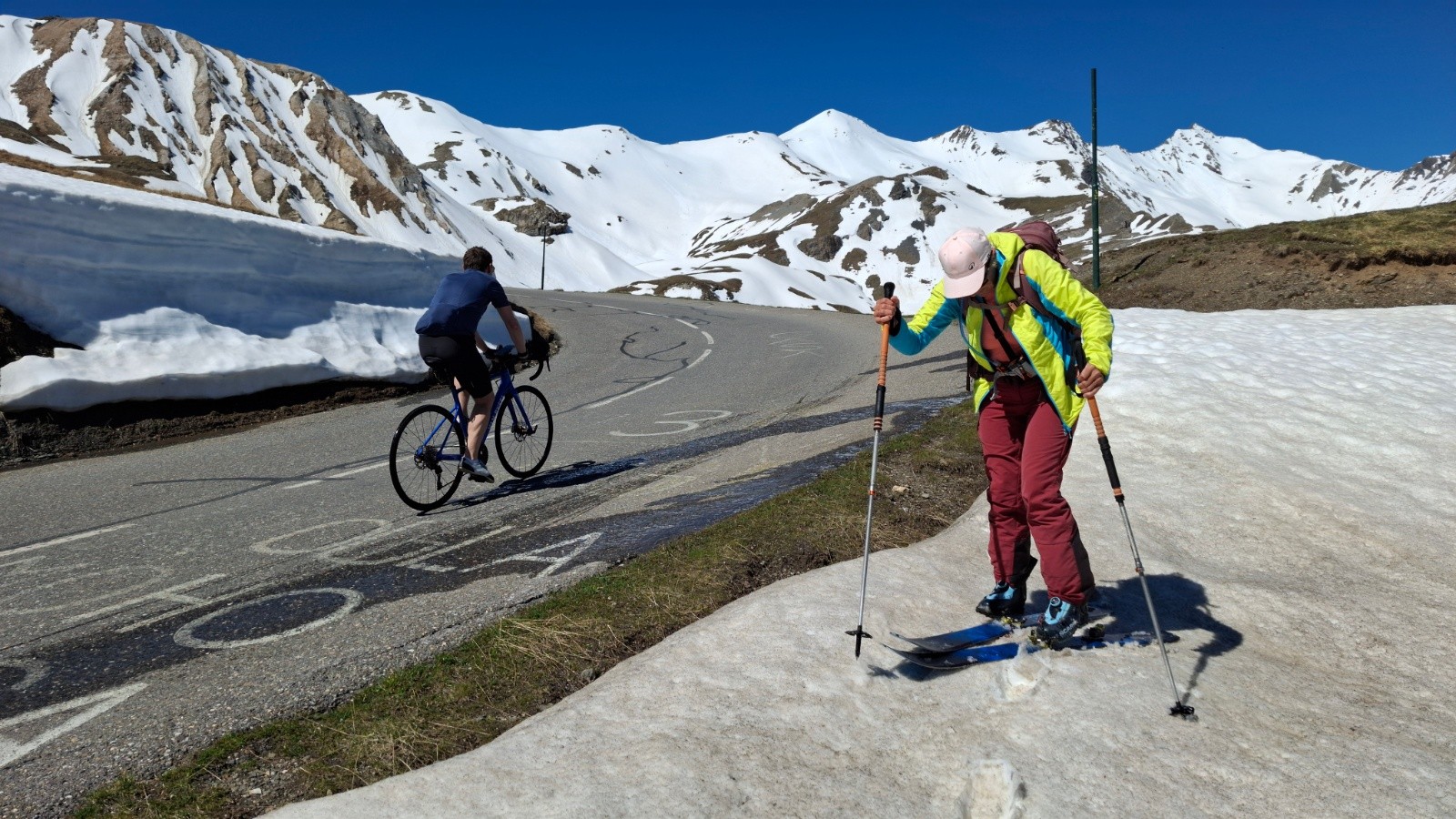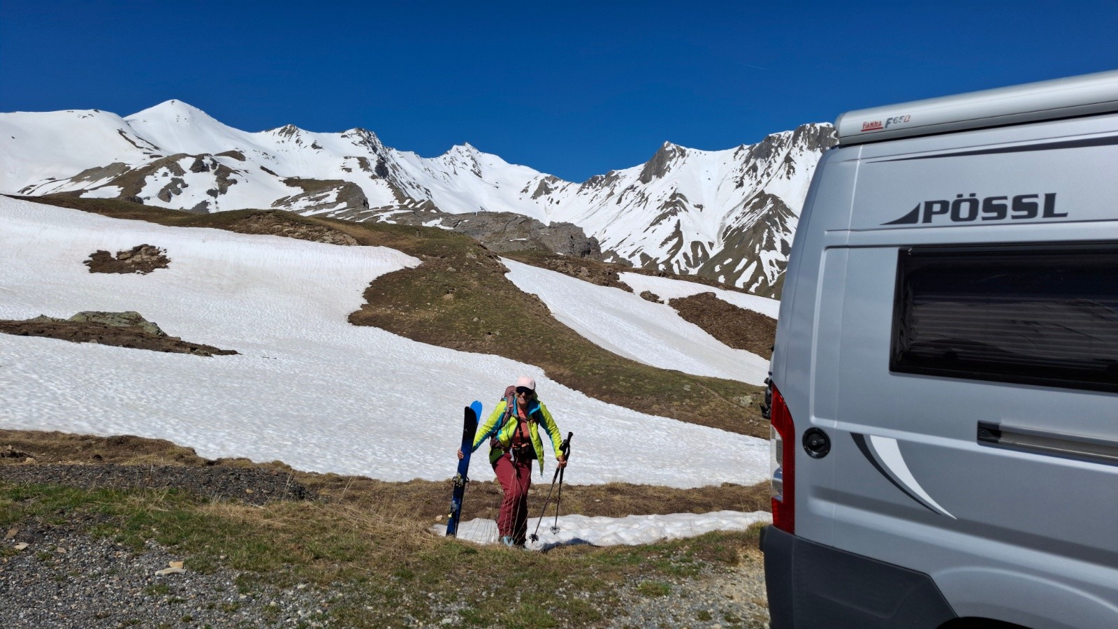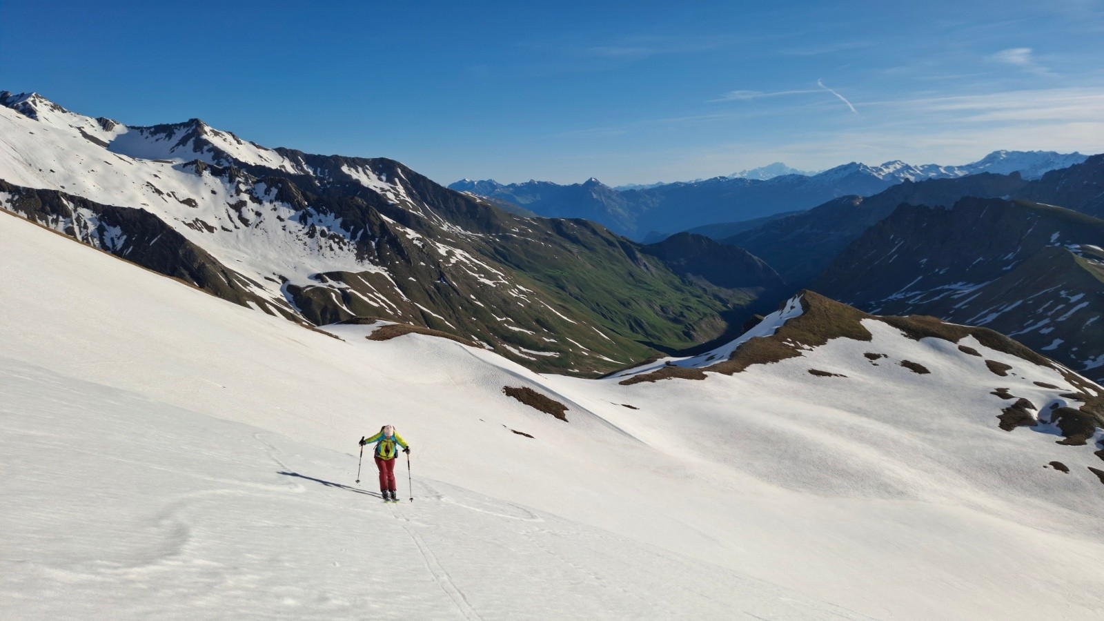 On retourne au galibier 2 semaines après avoir laissé le sommet du pic blanc pour une autre fois, et ce fut la bonne 😊, le col étant ouvert l’approche est simplifiée ✌️, quel changement au niveau enneigement ! Mais il y a encore de quoi faire 🫠. On commence donc par une descente, ce qui nous était jamais arrivé, ce qui implique de terminer par une montée...quoiqu’on aura réussi à rentrer au van sur des névés en insistant un peu 😄. Le regel étant moyen, la descente sur le vallon de l’ânesse passe mieux qu'on pensait. La montée est presque courte comparé au départ de Plan Lachat, et c'est tant mieux 😆. Le raidillon du sommet est déjà bien transfo, cool. On arrive les premiers, avec un couple et leur toutou, sympa. On retrouve aussi un solitaire croisé quand on montait, lui descendant déjà du pic blanc. Beaucoup de monde ensuite, même tard...On (je) décide de descendre dans le vallon de l’ânesse en bonus avant de retrouver celui de fontaine lombarde, au "prix" d'une remontée de 170m d+, rien quoi 🤫. Les 100 premiers m de d- plein Est sous le sommet sont déjà bien mou à 8h15, mais ensuite c'est top, bon choix donc 😉, on repeaute vers 2500m pour retrouver le vallon de fontaine lombarde, il fait chaud, mais la deuxième descente sur névé est encore bien bonne, pas mal de relief sur le dernier plat, mais ramolli donc correct. La dernière remontée se fait en mode "je savoure, c'est la dernière", mais comme on (je) veut qd même finir en descendant on pousse un peu le d+ 😆. Un névé pour le fun 😆 La saison se termine sur une bien belle impression 😍🥰. Les marmottes, les lagopèdes, les vélos, les motos et les skieurs étaient tous de sortie ! On passe en mode été, le temps de penser à l'hiver prochain 😄. Bonne fin de saison aux plus accros et bel été à tout le monde !