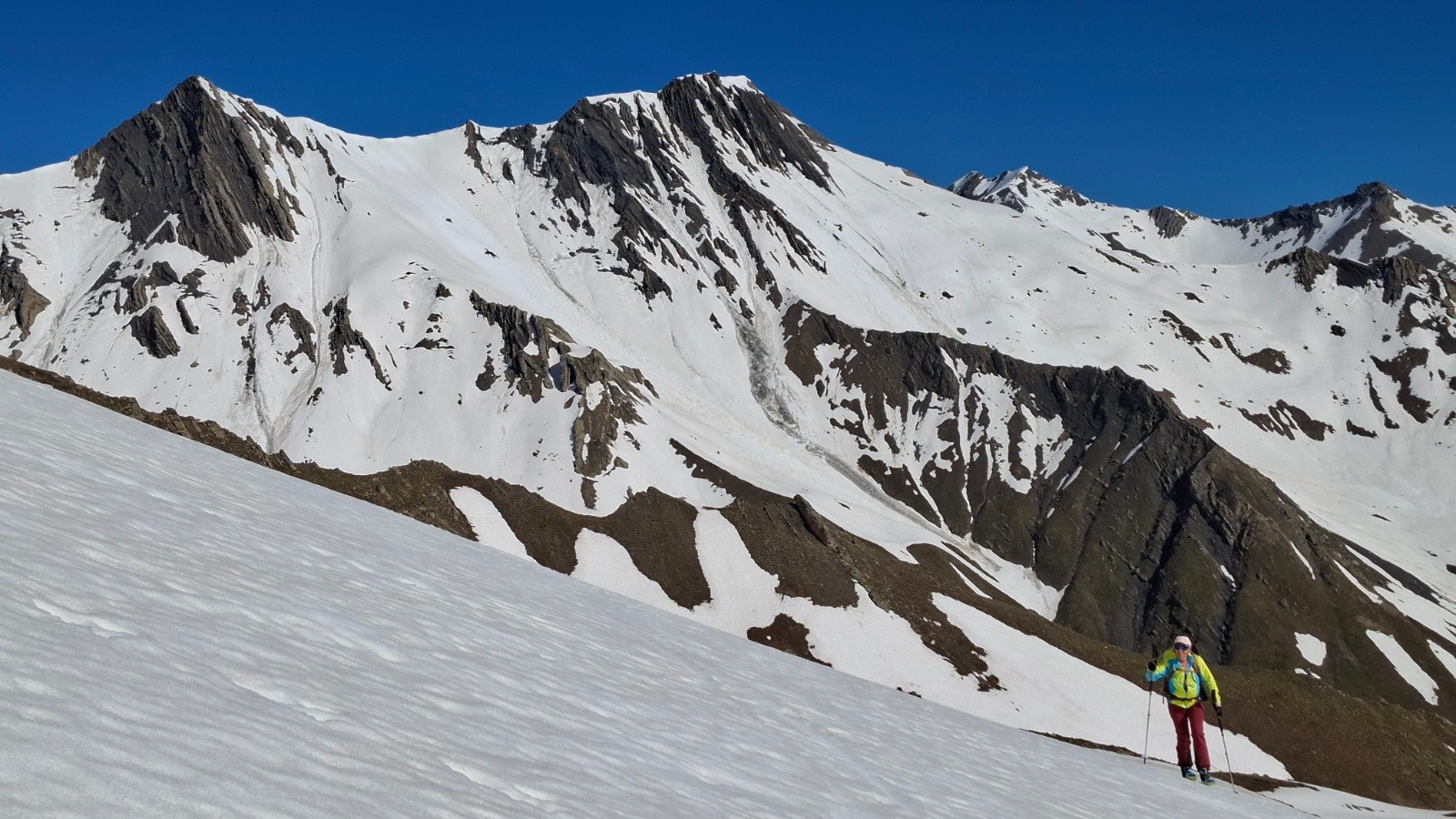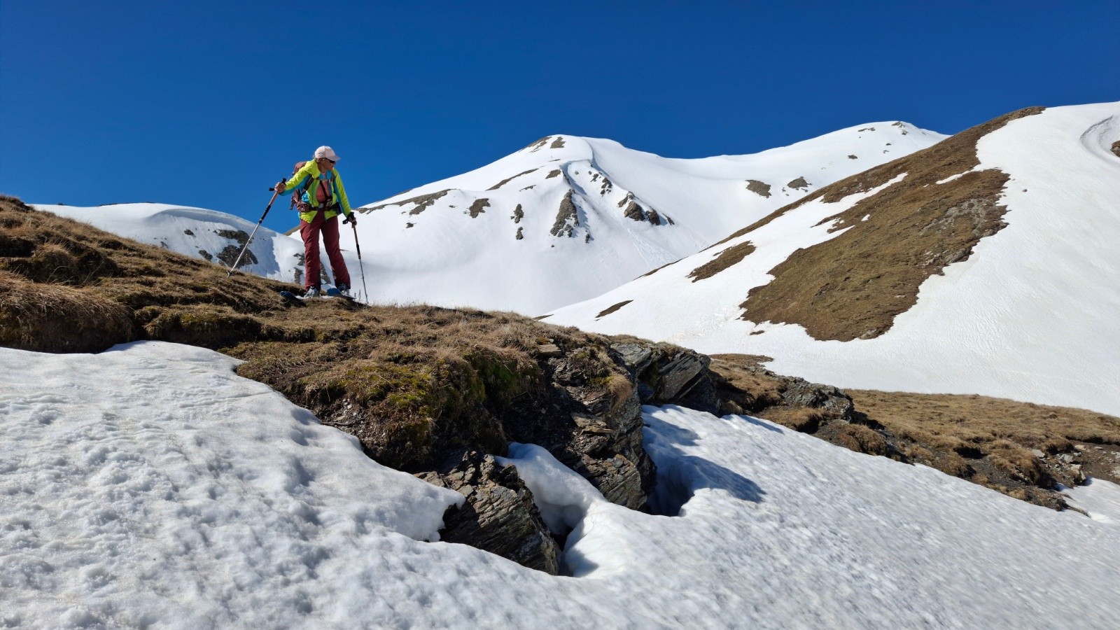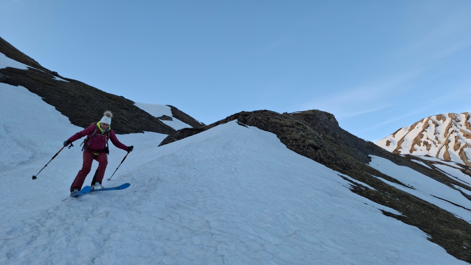 Conditions pour le ski : regel moyen, descente pour rejoindre la combe de fontaine lombarde neige dure bon grip, décaillage progressif à la montée, descente vallon de l’anesse très mou sous le sommet sur 100m d-, ensuite moquette 5*, remontée sans pb, descente vallon de fontaine lombarde transfo portante à moquette suivant orientations, remontée vers route du col neige revenue, névé final retour pk correct