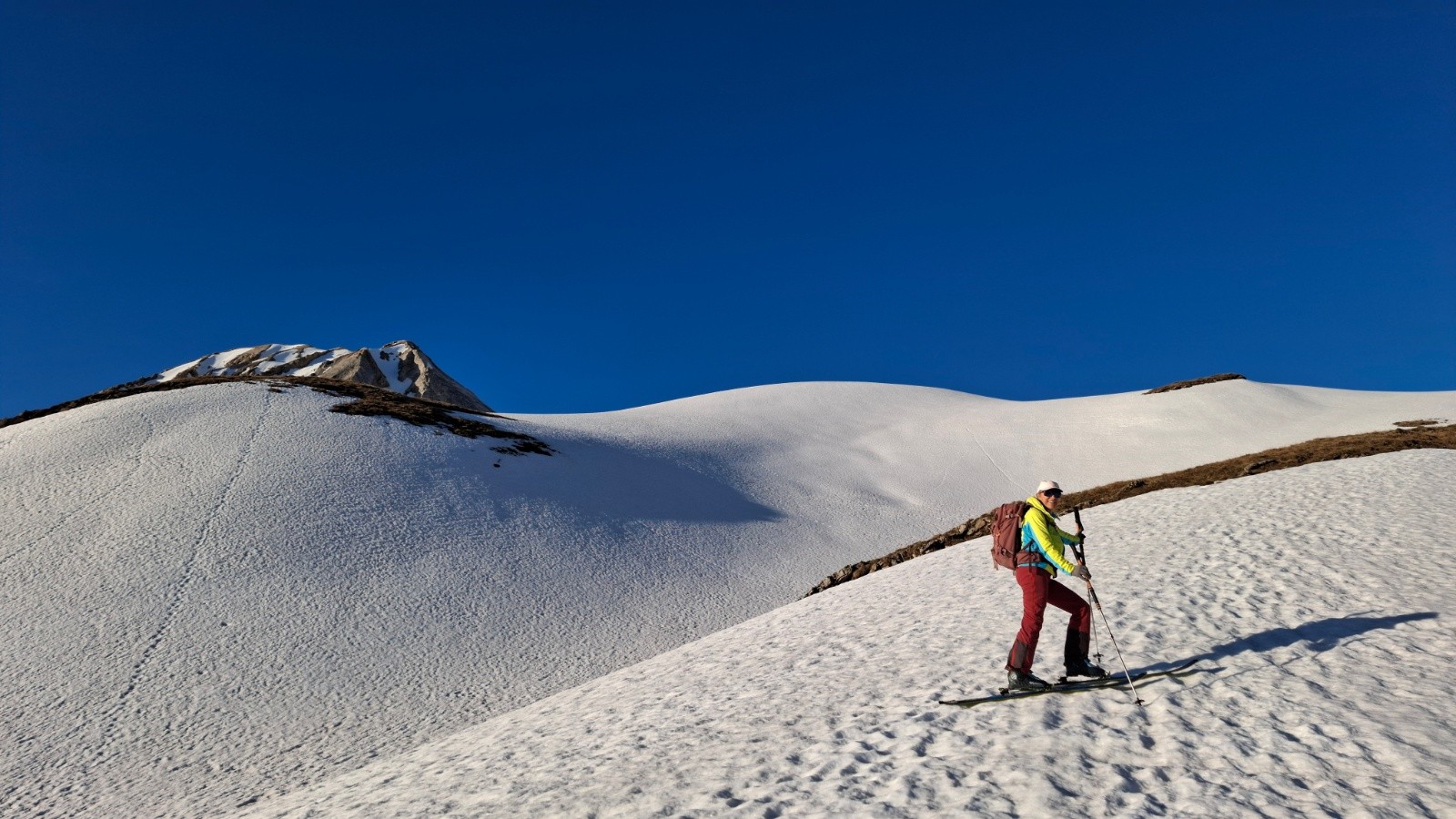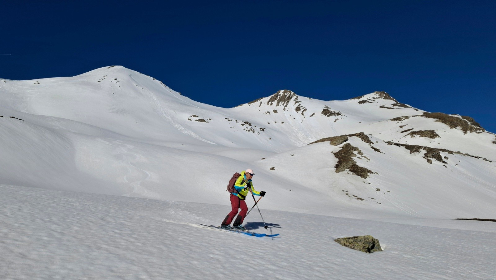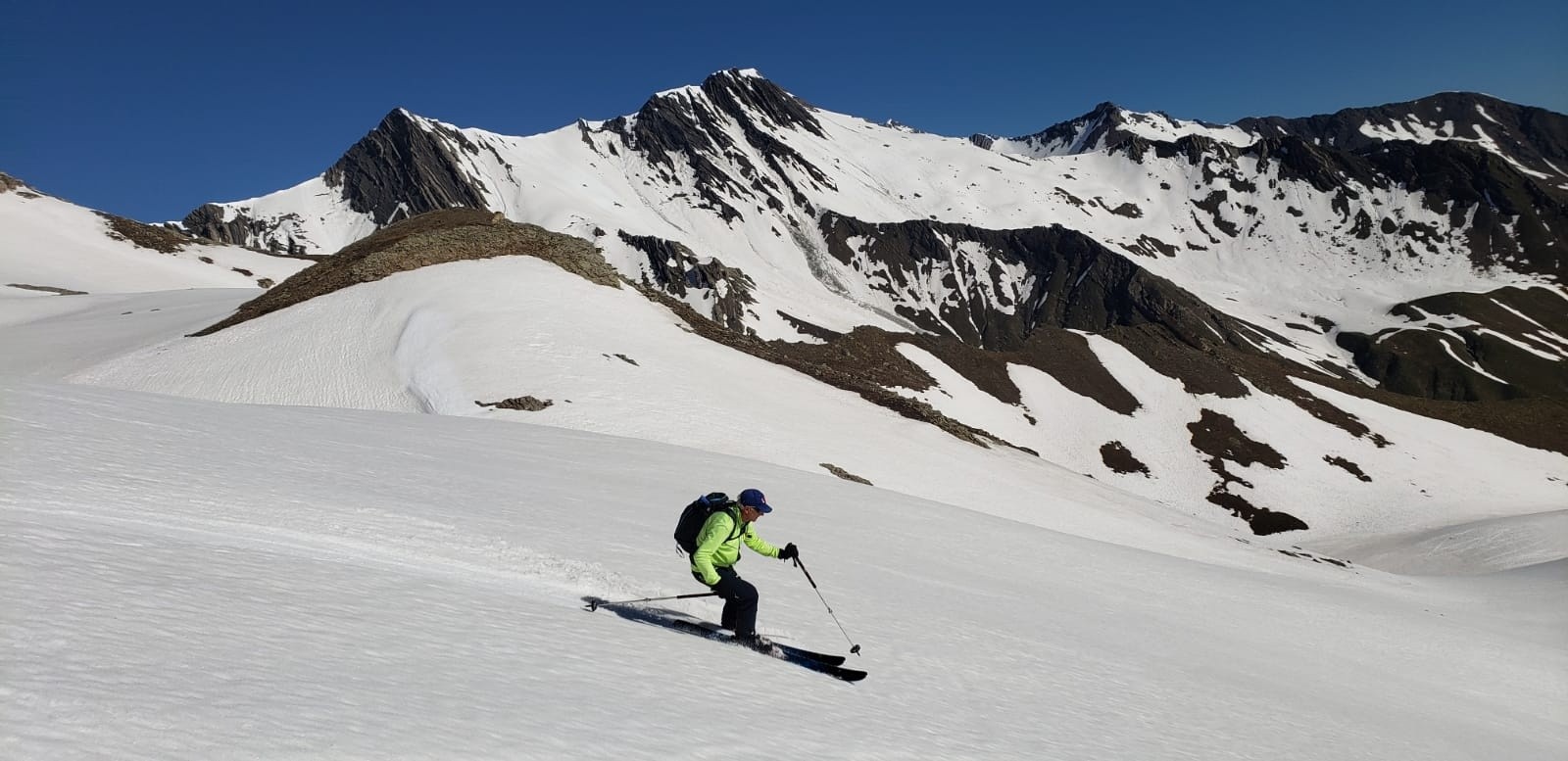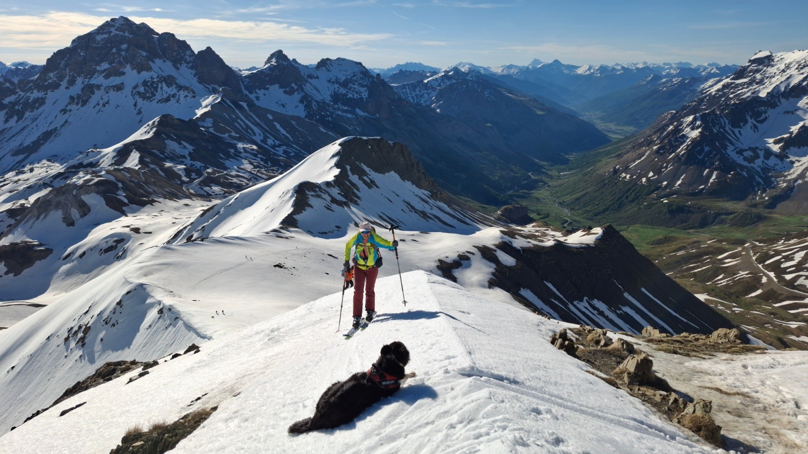 Conditions pour le ski : regel moyen, descente pour rejoindre la combe de fontaine lombarde neige dure bon grip, décaillage progressif à la montée, descente vallon de l’anesse très mou sous le sommet sur 100m d-, ensuite moquette 5*, remontée sans pb, descente vallon de fontaine lombarde transfo portante à moquette suivant orientations, remontée vers route du col neige revenue, névé final retour pk correct