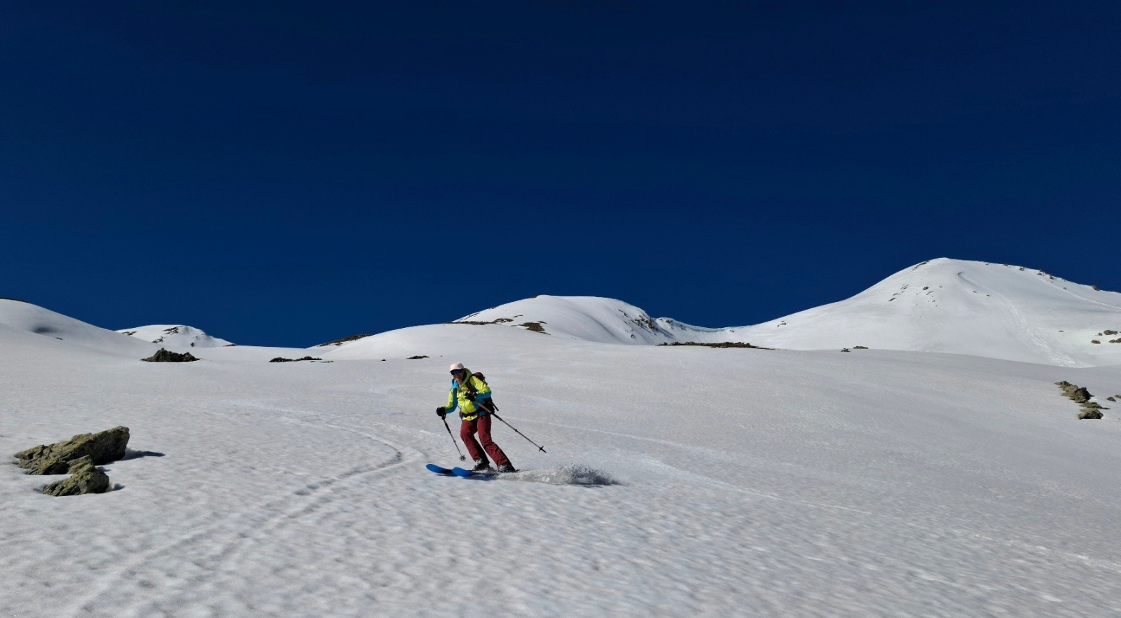 Itinéraire suivi : de la route du col descente sur vallon de fontaine lombarde, montée classique au pic blanc, descente plein E sur le vallon de l’ânesse jusqu'à 2450m env., remontée à un collu entre ânesse et fontaine lombarde jusqu'à env.2700m, descente vallon de l’ânesse jusqu'à 2300m, remontée à la route du col vers 2490m, retour van