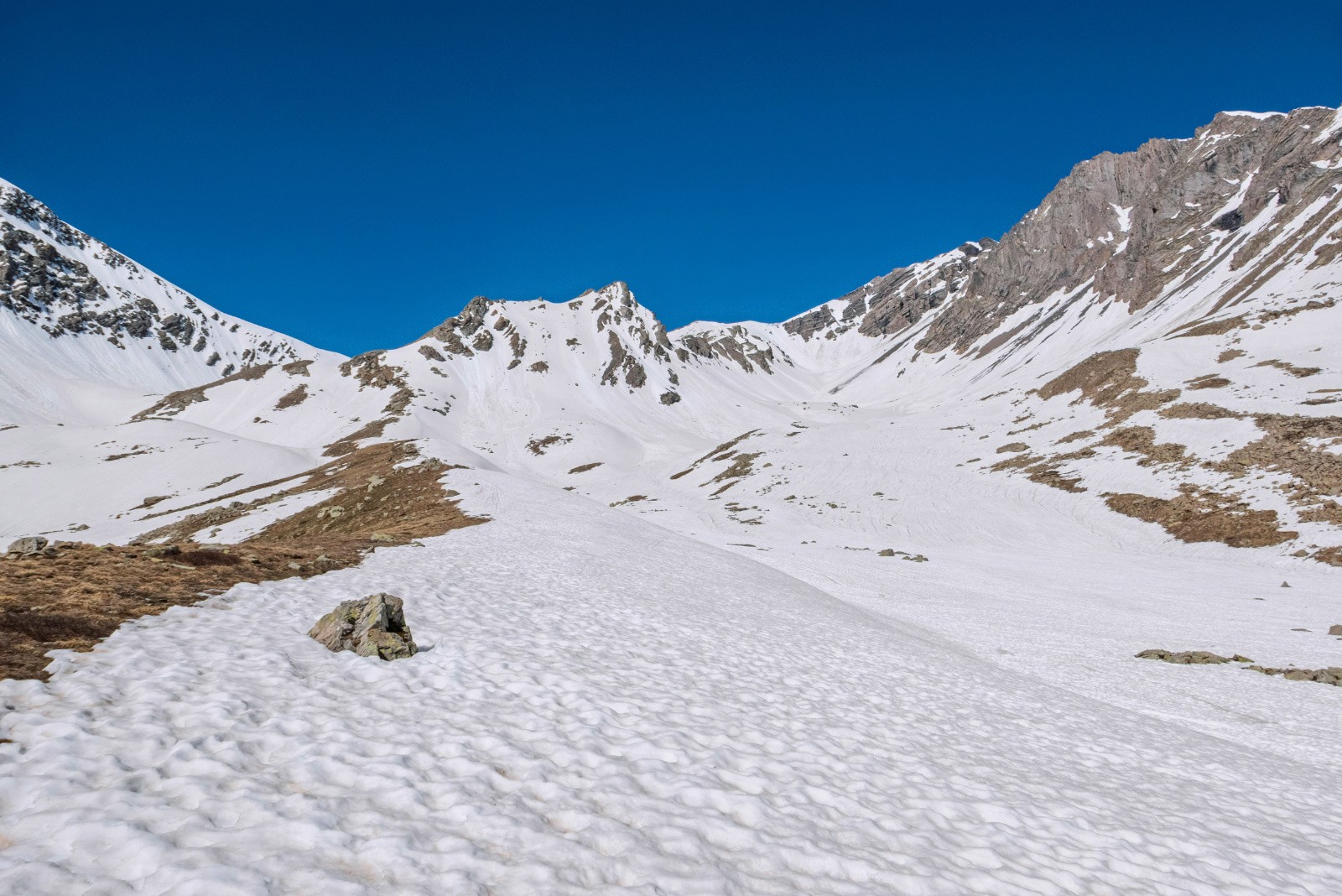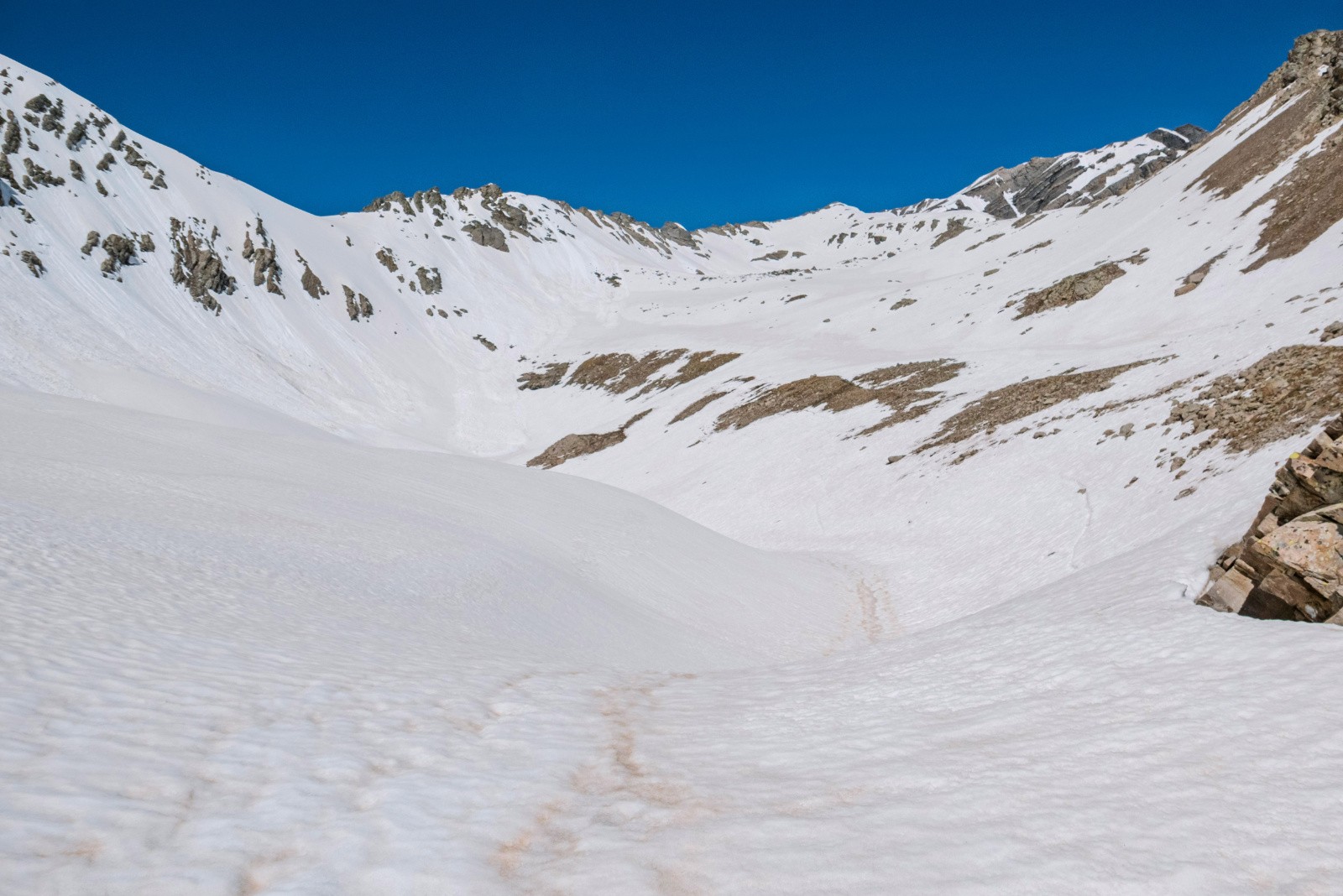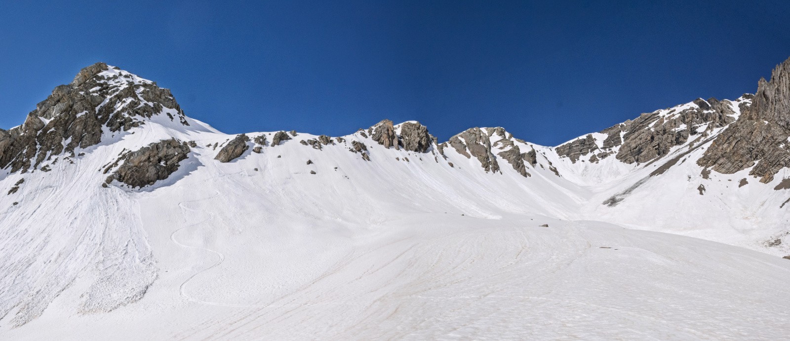 Si la météo avait été moins chaude je serai bien allé faire un tour au Col des Rougnoux (qui passe tout juste), mais ça chauffe trop fort sous le col de Freissinières en est, obligé de revenir pour 11h (et c'est déjà tard). En effet, la neige n'est pas encore du vrai névé au dessus de 2600 environ, moyennement portante. Du coup j'opte pour une boucle plus simple, en tournant autour du secteur de la Perche.