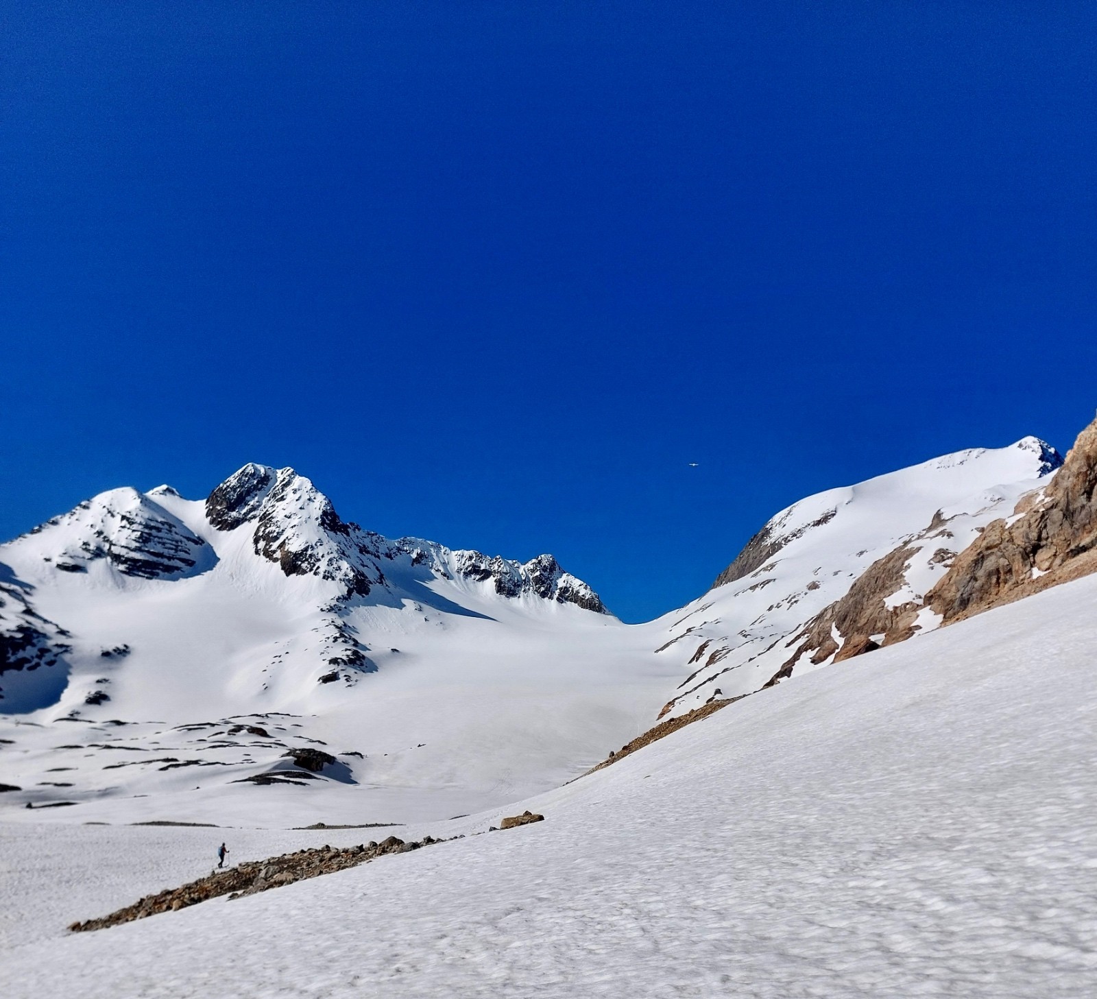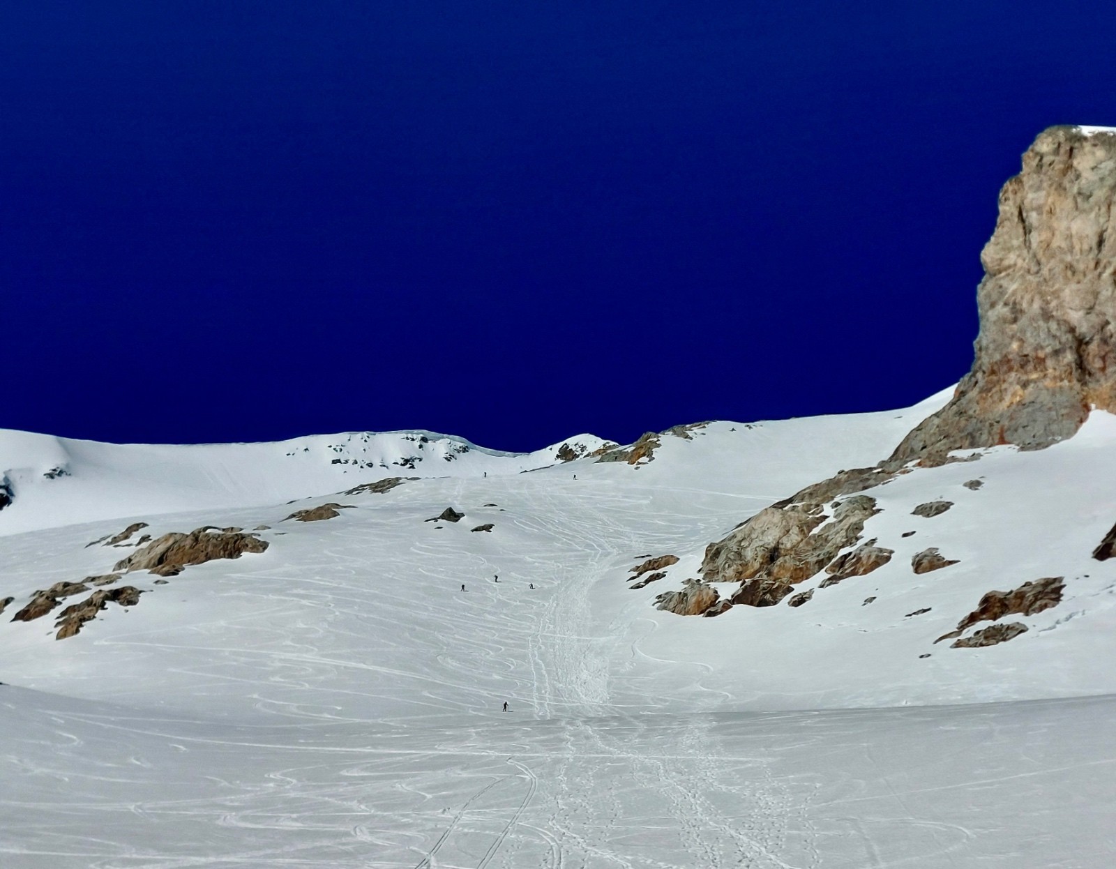 Conditions pour le ski : assez bonnes en général ; descente étendard vers 13h sur neige revenue mais encore consistante et surfaces lisses disponibles ; descente Laisse un peu lourde mais correcte ; descente finale sur neige de printemps agréable