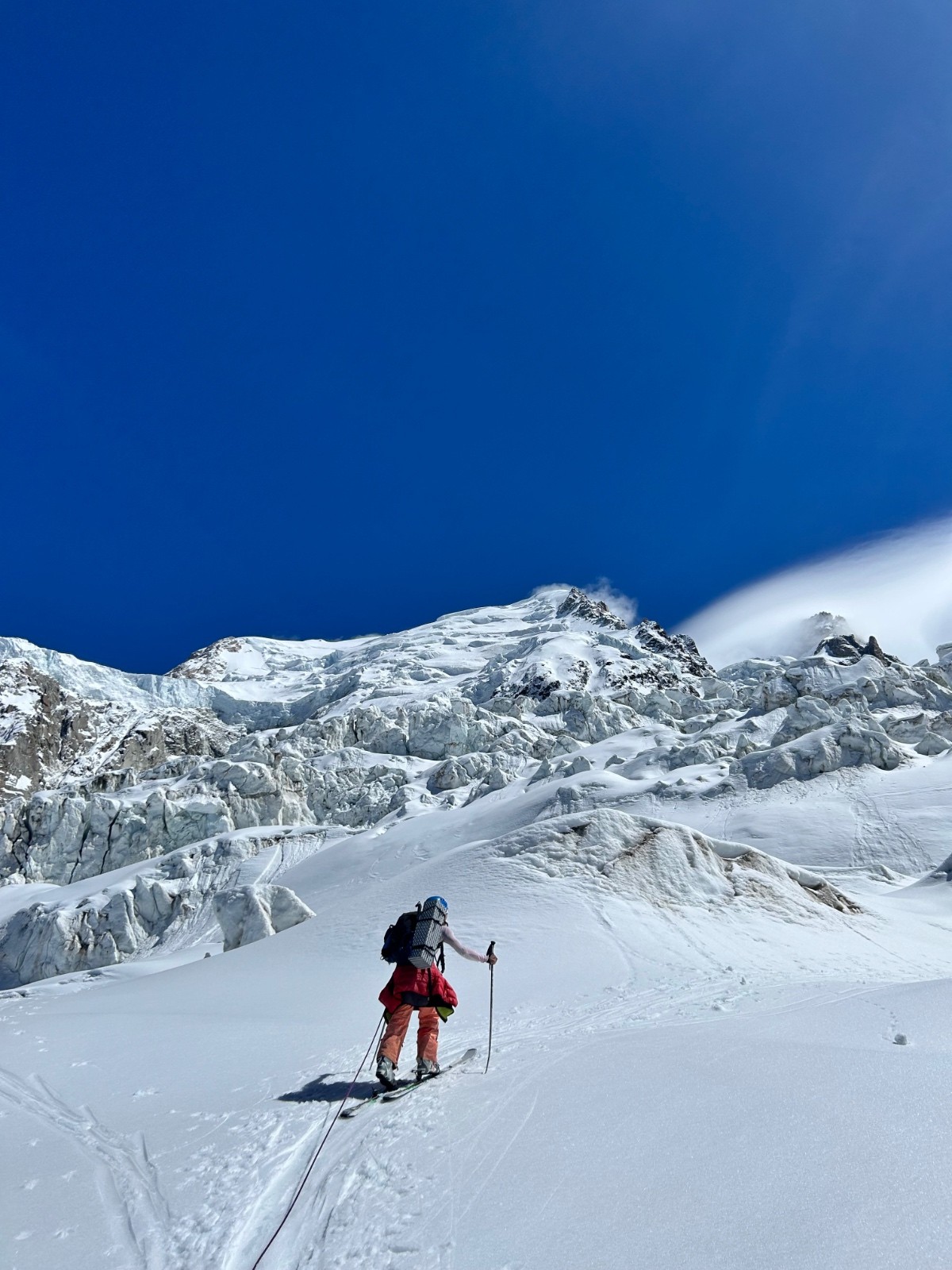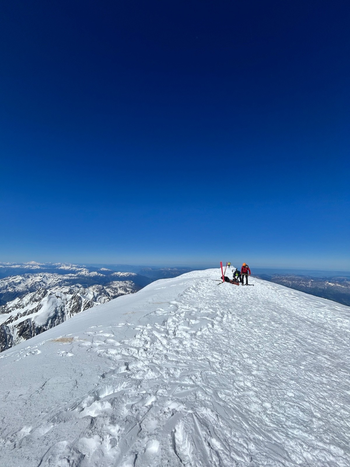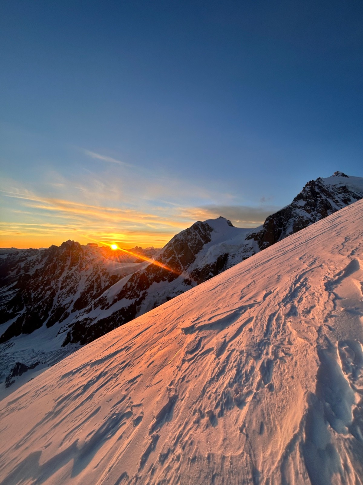 Je gardais ce sommet emblématique de côté, idéalement mon premier choix aurait été de l'atteindre par l'innominata car je suis sentimental et amoureux et veut y aller de la plus belle des manières... Mais déjà quelques semaines / mois avant, j'avais changé d'avis, je m'étais laissé aller avec le Mont Blanc en me disant que peut être j'étais trop exigeant et qu'il fallait que je sois plus souple. On avait parlé d'y aller en famille, donc ça non plus ça ne se refuse pas... mais la météo n'était pas d'accord. Mardi, je discutais avec Aurélie, on parlait d'aller faire la face nord du Grand Paradis, puis tout à coup, elle me parle du Mont Blanc par l'arête nord du dôme. Je réfléchis moins de 15 secondes et lui répond affirmativement. Elle ne l'a jamais fait non plus, et des itinéraires qu'elle n'a pas fait sur ce sommet il n'en reste plus beaucoup. Donc le lendemain petites courses et jeudi nous sommes les skis aux pieds et attaquons notre belle escapade. Avec Aurélie, on est pas super fan de dormir en refuge, donc pour nous c'était une évidence qu'on allait bivouaquer un peu à l'arrache dans un trou de neige. J'avais pas de duvet, en général j'en pique un à mon père, un bon truc avec lequel j'ai jamais eu froid. Mais là, j'ai dû faire autrement. elle m'a prêtée un petit duvet qui ferait relativement l'affaire. On a creusé un petit emplacement chacun pas loin sous le refuge, j'ai eu l'impression qu'on était un peu l'attraction du jour. On voulait se coucher tôt mais une cordée de 3 dé****s ont eu la bonne idée d'arriver après 20h le soir, de manger au refuge en prenant bien leur temps et de monter leur tente et de préparer leur bivouac de naze collé a 1m50 de mon trou de neige vers 21h30 / 22h... Si vous lisez ça, sachez que je vous déteste, non pas parce que j'ai mal dormi (ça c'était une évidence et puis j'en avais un peu rien à faire de mal dormir) mais surtout parce que par respect d'autrui, ça ne se fait pas. Posez vous 50m plus loin dans ce cas là et fermez vos bouches. Bref hein 😅 J2 départ 3h, on atteint le sommet à 10h, tout se passe bien, on était pas acclimaté mais on est bien monté. On s'est fait tabasser par l'altitude sur l'arête des bosses mais globalement assez bien. Cet itinéraire est magnifique, c'est esthétique, ça a de la gueule, tu te sens ridiculement petit. Concernant la descente, c'était bien cool, un peu mal aux cuisses quand même et aussi un peu serré les fesses pour la partie finale (jonction -> plan de l'aiguille) l'aprem avec un iso 0 a 4000 et des purges de malades -> le vallon des boulettes. J'ai versé ma larme au sommet... Là haut j'ai beaucoup pensé à ma famille principalement... à mon père, mon skieur alpiniste favori, à ma mère, et bien sur à Faustine et Nathan avec qui je veux partager ça un jour. Et ça peut sonner niais mais j'ai beaucoup remercié la vie de me permettre de faire ce genre de chose en étant en très bonne santé, que je puisse faire ça "comme ça" sur un coup de tête... C'était tellement magique, de partager ça avec Aurélie, de skier au milieu des immensités... d'aller sur cette montagne que je vois sous tous ses angles depuis petit... d'y aller en posant notre petit bivouac de fortune... bref c'est trop sentimental et je suis sur skitour donc je vais arrêter là. Merci d'avoir lu