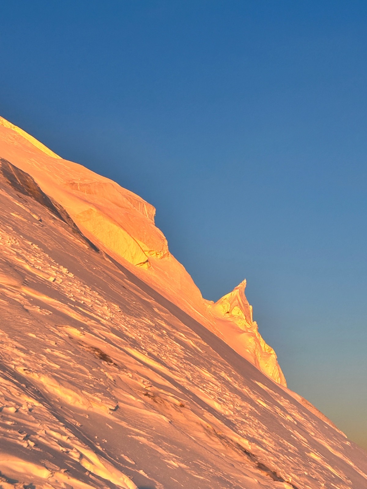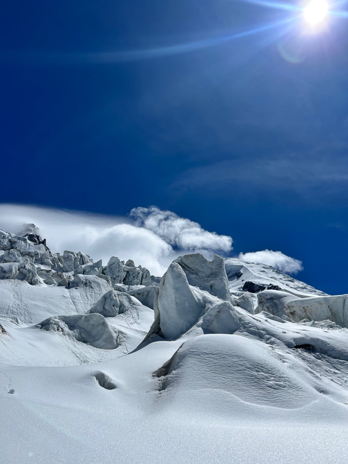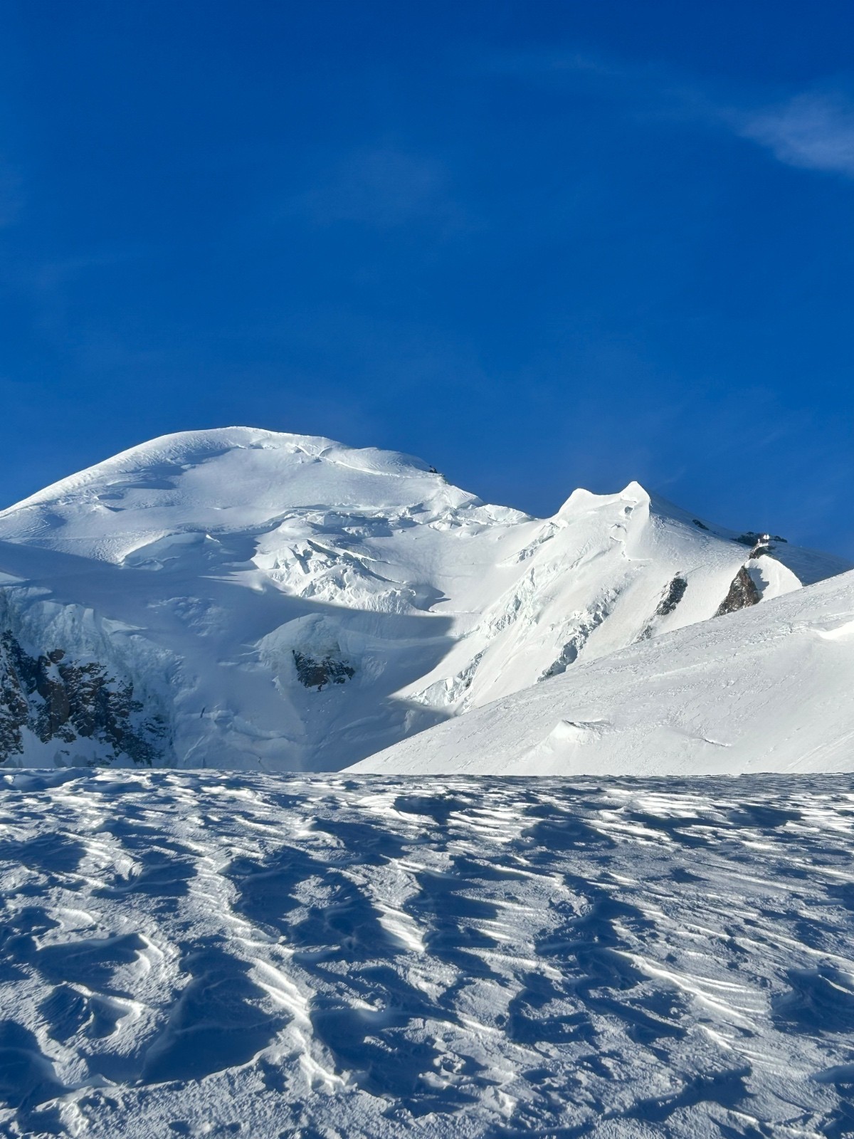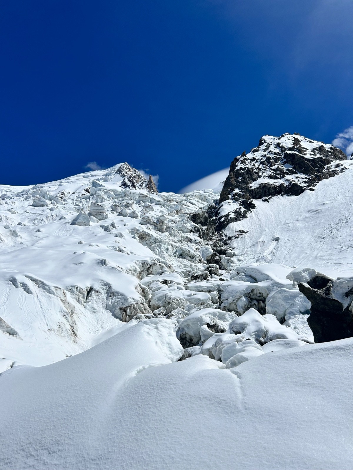 Je gardais ce sommet emblématique de côté, idéalement mon premier choix aurait été de l'atteindre par l'innominata car je suis sentimental et amoureux et veut y aller de la plus belle des manières... Mais déjà quelques semaines / mois avant, j'avais changé d'avis, je m'étais laissé aller avec le Mont Blanc en me disant que peut être j'étais trop exigeant et qu'il fallait que je sois plus souple. On avait parlé d'y aller en famille, donc ça non plus ça ne se refuse pas... mais la météo n'était pas d'accord. Mardi, je discutais avec Aurélie, on parlait d'aller faire la face nord du Grand Paradis, puis tout à coup, elle me parle du Mont Blanc par l'arête nord du dôme. Je réfléchis moins de 15 secondes et lui répond affirmativement. Elle ne l'a jamais fait non plus, et des itinéraires qu'elle n'a pas fait sur ce sommet il n'en reste plus beaucoup. Donc le lendemain petites courses et jeudi nous sommes les skis aux pieds et attaquons notre belle escapade. Avec Aurélie, on est pas super fan de dormir en refuge, donc pour nous c'était une évidence qu'on allait bivouaquer un peu à l'arrache dans un trou de neige. J'avais pas de duvet, en général j'en pique un à mon père, un bon truc avec lequel j'ai jamais eu froid. Mais là, j'ai dû faire autrement. elle m'a prêtée un petit duvet qui ferait relativement l'affaire. On a creusé un petit emplacement chacun pas loin sous le refuge, j'ai eu l'impression qu'on était un peu l'attraction du jour. On voulait se coucher tôt mais une cordée de 3 dé****s ont eu la bonne idée d'arriver après 20h le soir, de manger au refuge en prenant bien leur temps et de monter leur tente et de préparer leur bivouac de naze collé a 1m50 de mon trou de neige vers 21h30 / 22h... Si vous lisez ça, sachez que je vous déteste, non pas parce que j'ai mal dormi (ça c'était une évidence et puis j'en avais un peu rien à faire de mal dormir) mais surtout parce que par respect d'autrui, ça ne se fait pas. Posez vous 50m plus loin dans ce cas là et fermez vos bouches. Bref hein 😅 J2 départ 3h, on atteint le sommet à 10h, tout se passe bien, on était pas acclimaté mais on est bien monté. On s'est fait tabasser par l'altitude sur l'arête des bosses mais globalement assez bien. Cet itinéraire est magnifique, c'est esthétique, ça a de la gueule, tu te sens ridiculement petit. Concernant la descente, c'était bien cool, un peu mal aux cuisses quand même et aussi un peu serré les fesses pour la partie finale (jonction -> plan de l'aiguille) l'aprem avec un iso 0 a 4000 et des purges de malades -> le vallon des boulettes. J'ai versé ma larme au sommet... Là haut j'ai beaucoup pensé à ma famille principalement... à mon père, mon skieur alpiniste favori, à ma mère, et bien sur à Faustine et Nathan avec qui je veux partager ça un jour. Et ça peut sonner niais mais j'ai beaucoup remercié la vie de me permettre de faire ce genre de chose en étant en très bonne santé, que je puisse faire ça "comme ça" sur un coup de tête... C'était tellement magique, de partager ça avec Aurélie, de skier au milieu des immensités... d'aller sur cette montagne que je vois sous tous ses angles depuis petit... d'y aller en posant notre petit bivouac de fortune... bref c'est trop sentimental et je suis sur skitour donc je vais arrêter là. Merci d'avoir lu