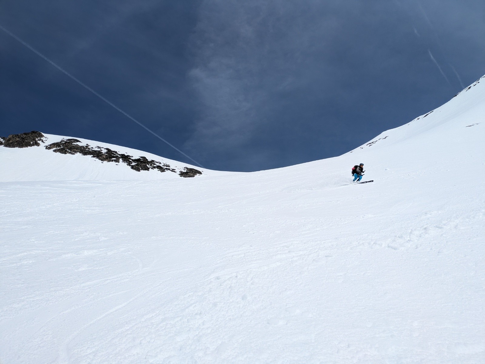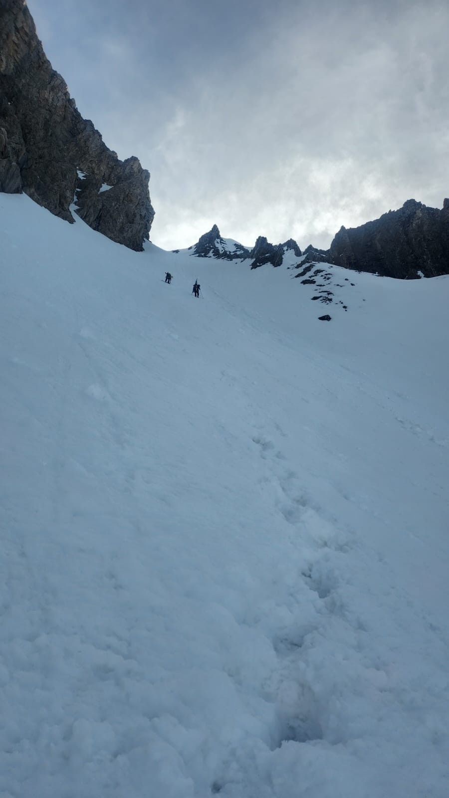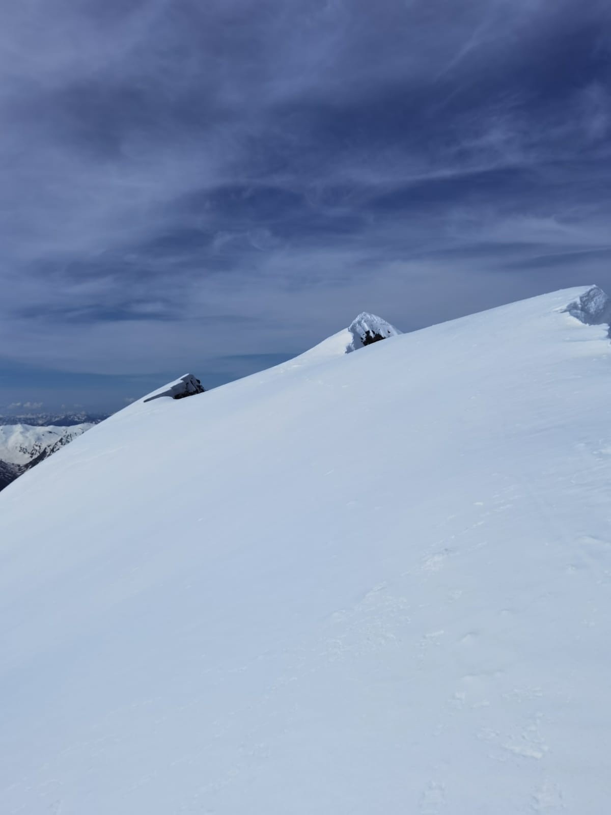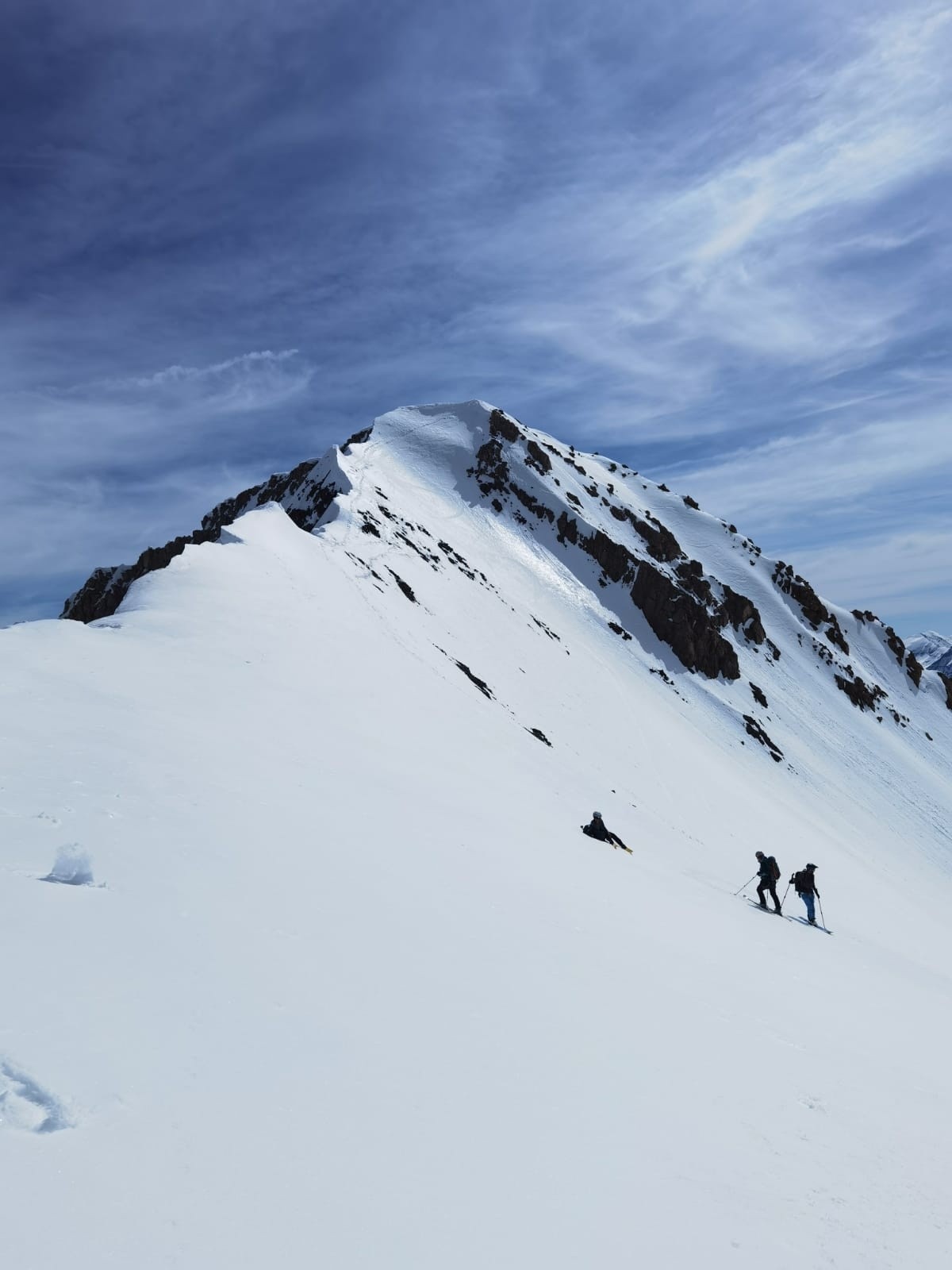 Pente sommitale : la neige nous glisse sous les skis. Nous décidons de stoper avant l'arête (10h15) pour redescendre le passage expo sans attendre.