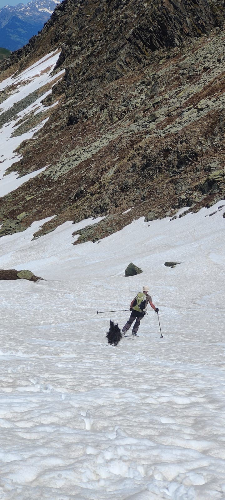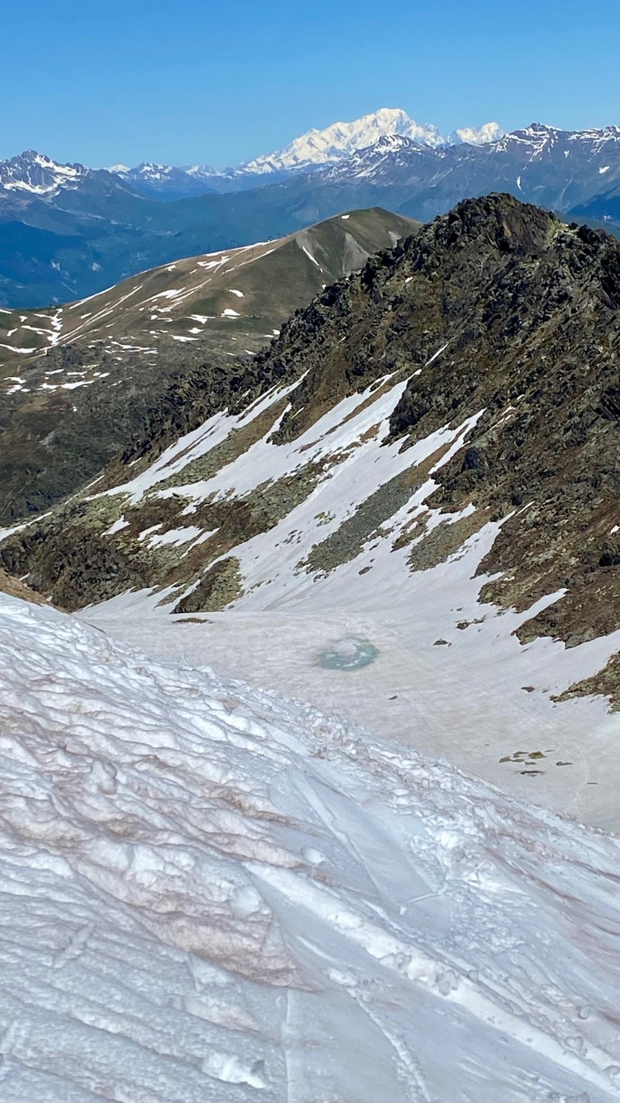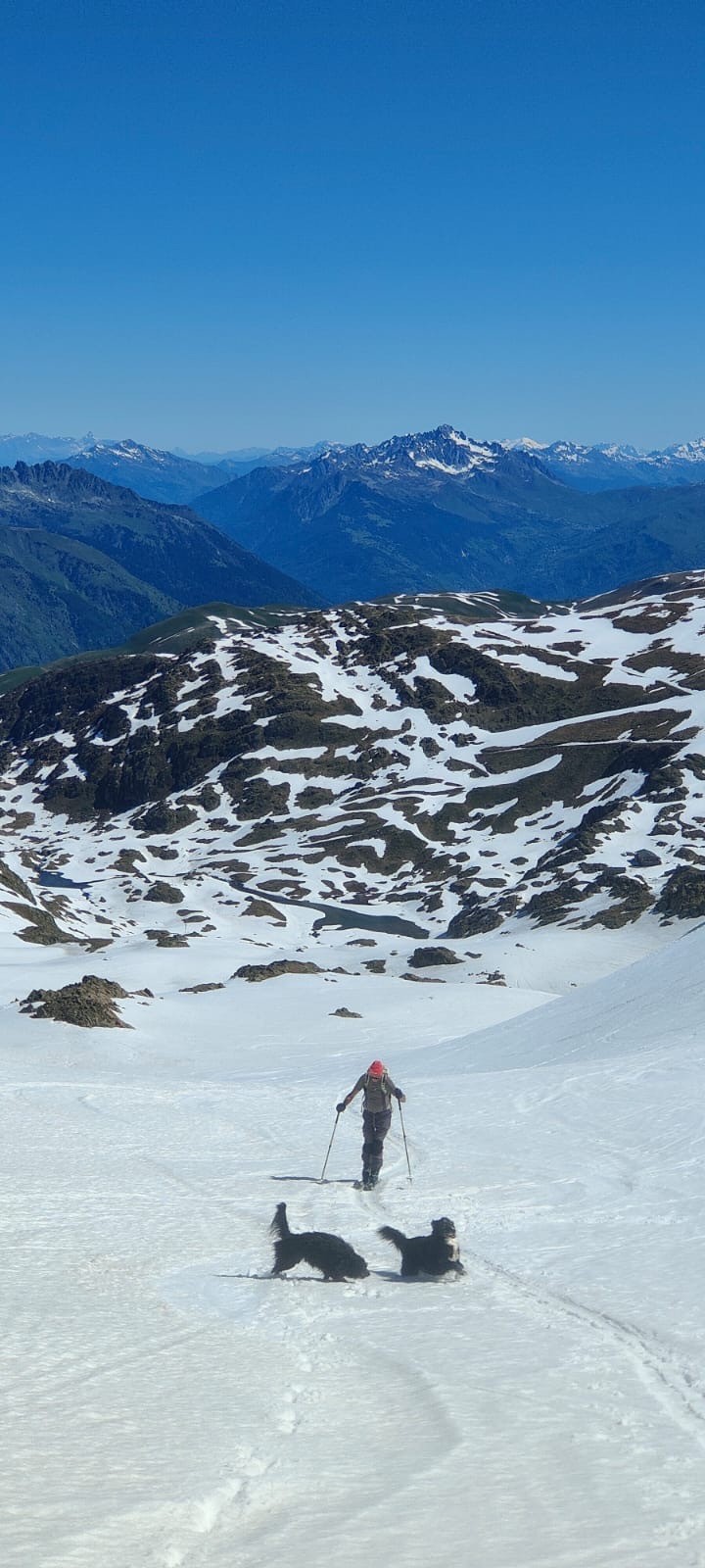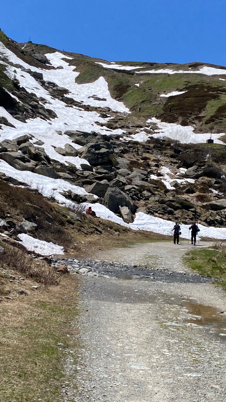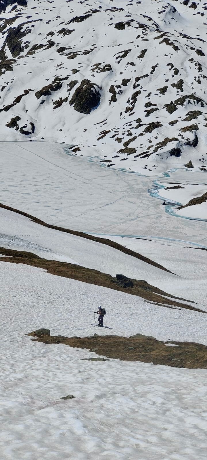 On tourne le dos à tout ça et on chausse assez vite en continu ou presque jusqu’au col des Tufs ; descente sur le refuge sans depeauter, traversée du torrent sous le barrage sans problème ; remontée de la pente NW en T-shirt, les aérations ouvertes!!! Du monde qui descend parti plus tôt que nous, du monde qui me double, des très forts qui remontent le couloir de l’Aiguille Noire…du monde dans tout le massif …et le chauffage qu’ils ont mis à fond là haut ! Pente terminale sans problème, la descente non plus, on laisse pardon! on Laisse glisser jusqu’au lac Majeur sous le refuge.