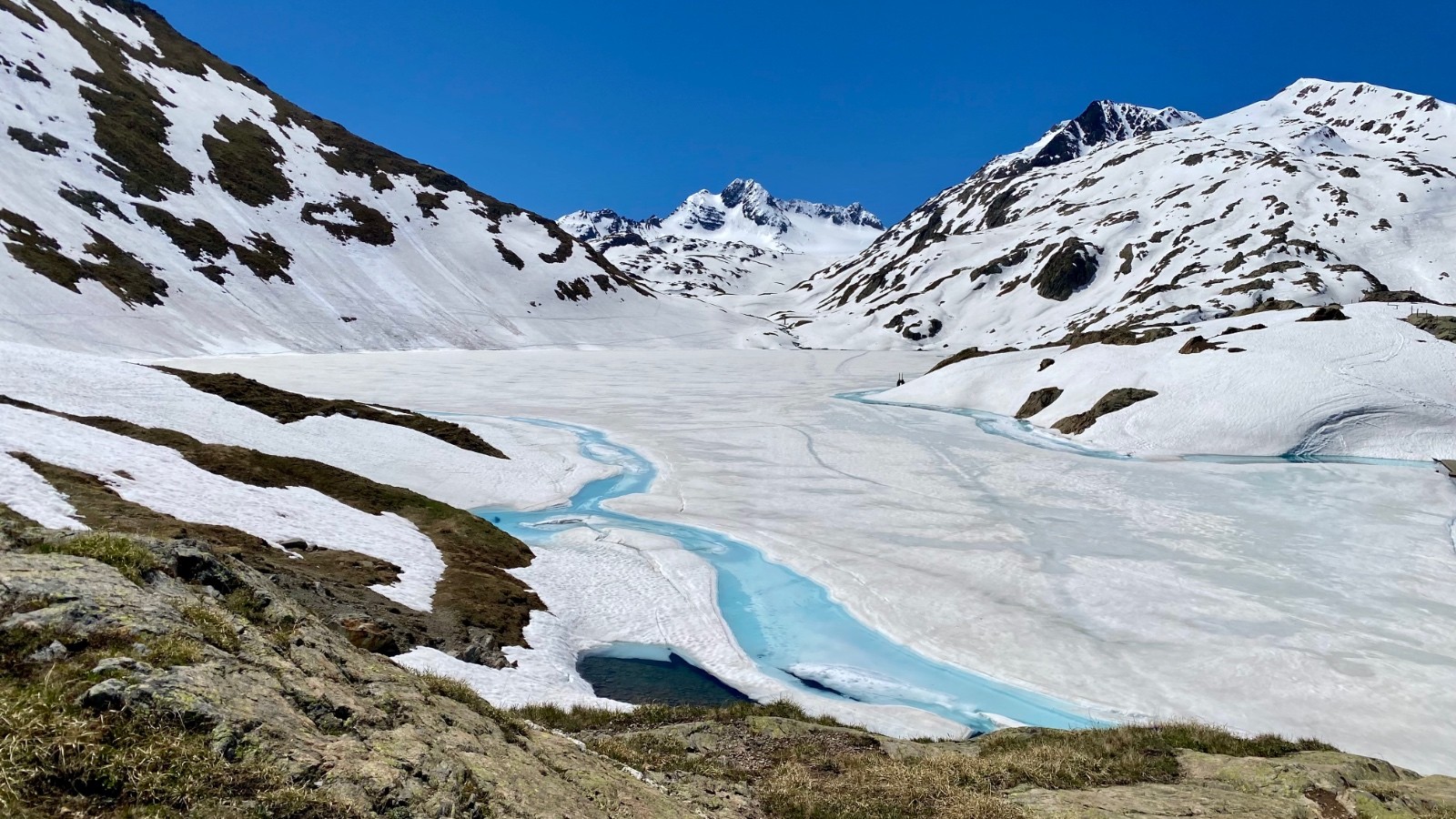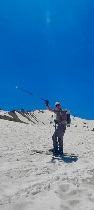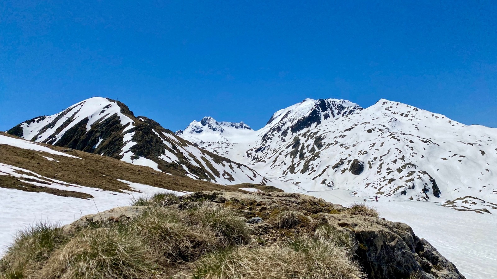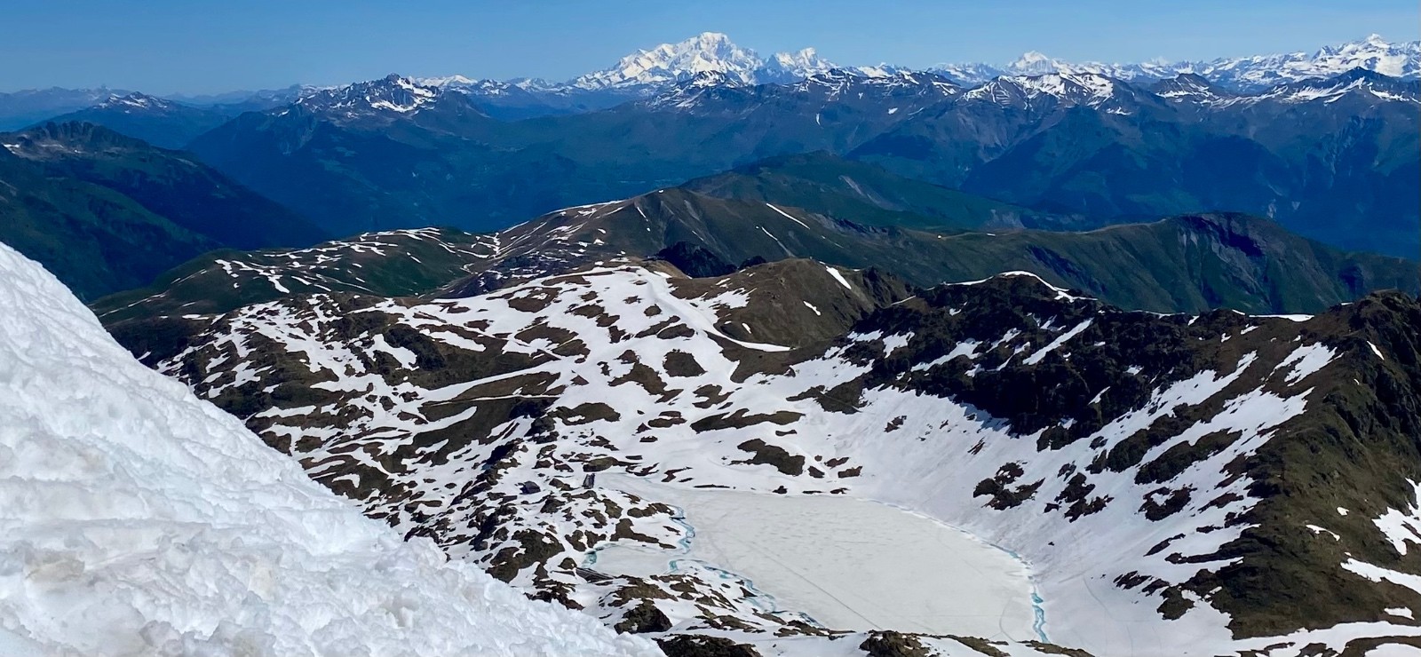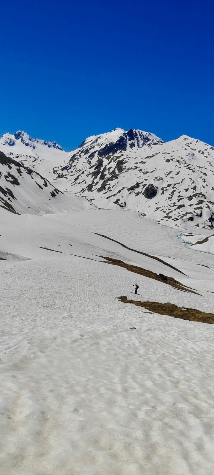 On tourne le dos à tout ça et on chausse assez vite en continu ou presque jusqu’au col des Tufs ; descente sur le refuge sans depeauter, traversée du torrent sous le barrage sans problème ; remontée de la pente NW en T-shirt, les aérations ouvertes!!! Du monde qui descend parti plus tôt que nous, du monde qui me double, des très forts qui remontent le couloir de l’Aiguille Noire…du monde dans tout le massif …et le chauffage qu’ils ont mis à fond là haut ! Pente terminale sans problème, la descente non plus, on laisse pardon! on Laisse glisser jusqu’au lac Majeur sous le refuge.