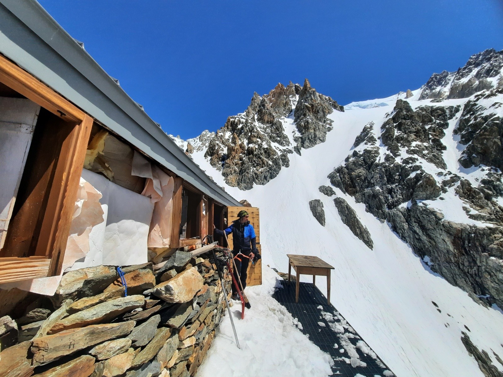 11h00 devant la porte de quintino sella. (Bivouac de 1885, l'un des plus vieux du massif du MB, très beau perché sur un éperon. Dommage qu'il soit en train de se dégradé violemment )