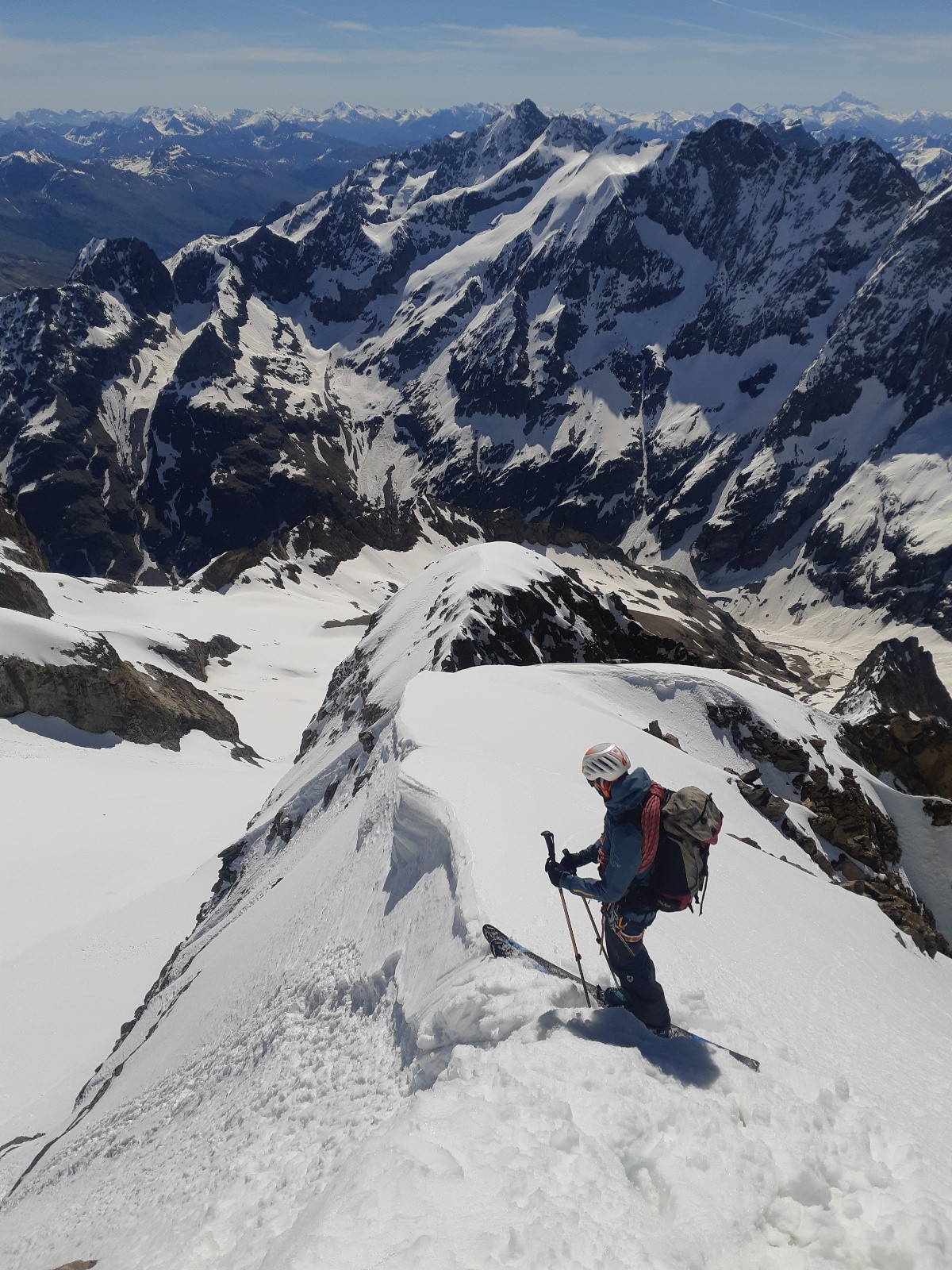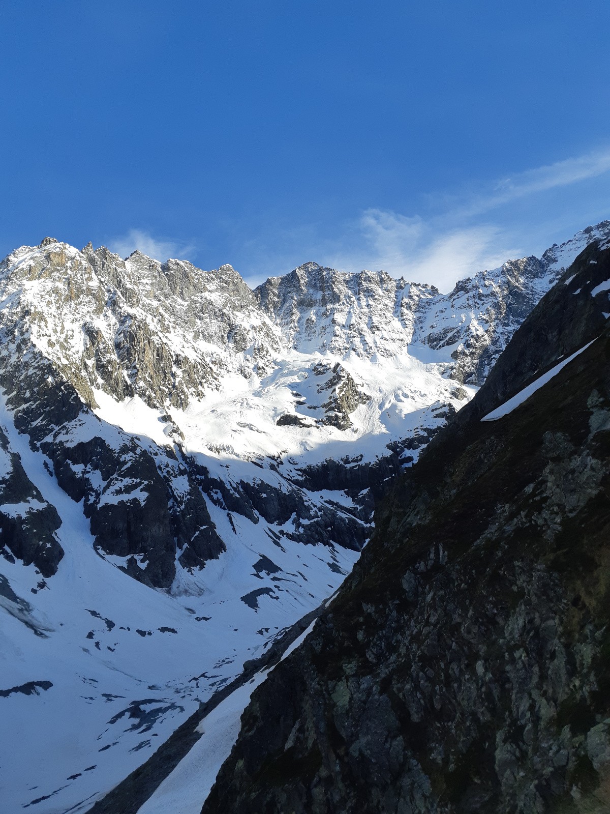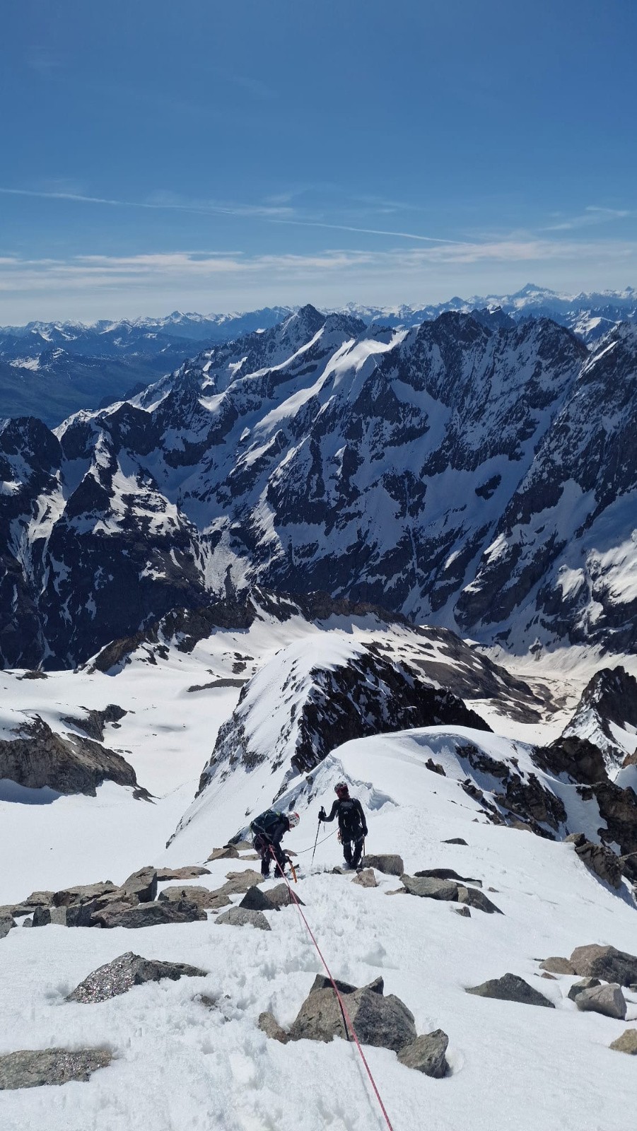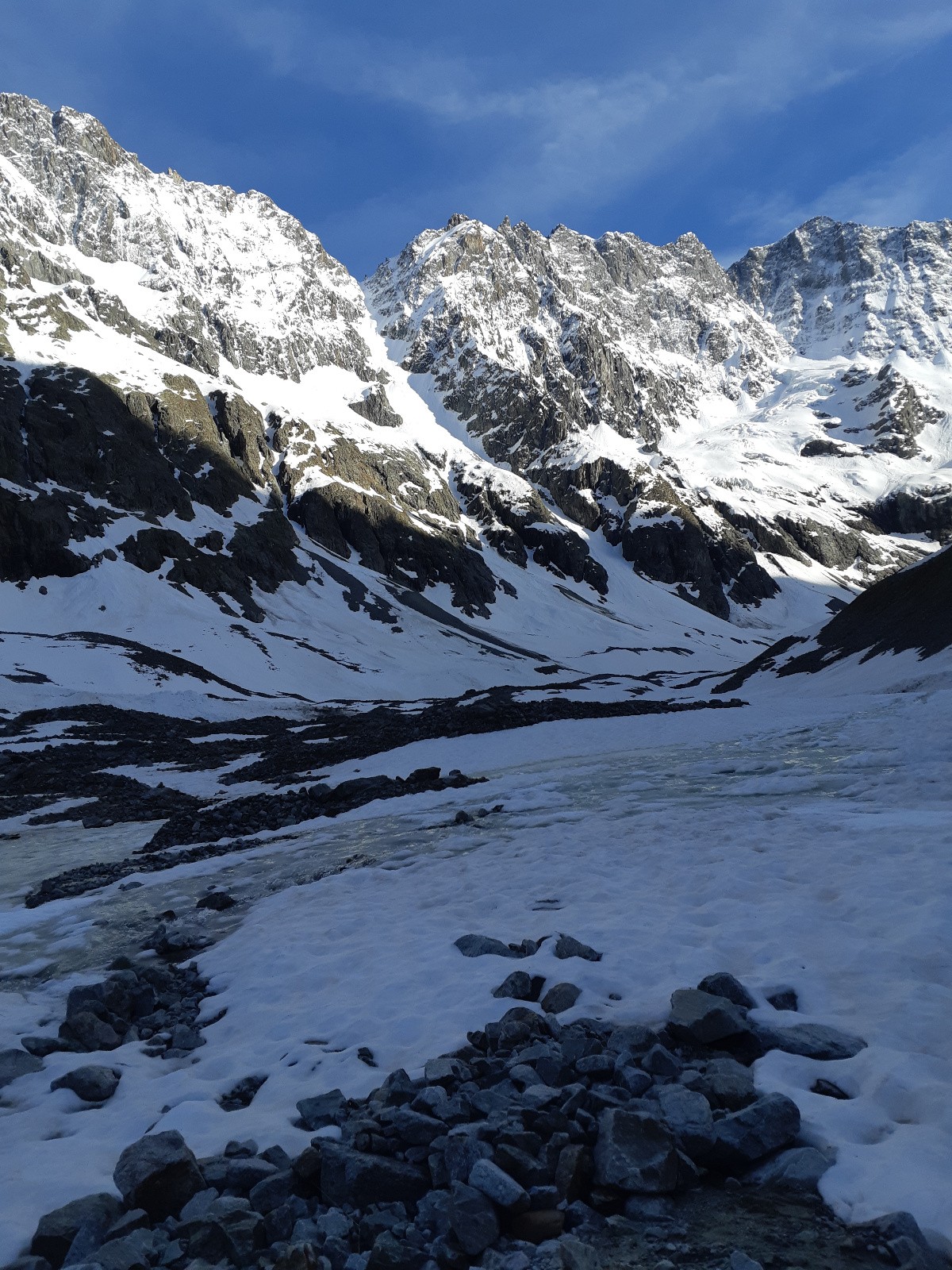 Itinéraire suivi : J1 : montée à vélo de Bourg d'Oisans (ou Grenoble pour Lucas) jusqu'à Villard d'Arene, puis montée à Adèle Planchard par le sentier d'été qui passe très bien (on a pris le piolet pour 2 passages en neige). J2 : Grande Ruine, puis redescente jusqu'au plan de Valfourche et remontée au refuge du Pavé. J3 : brèche des Chamois et retour à Grenoble