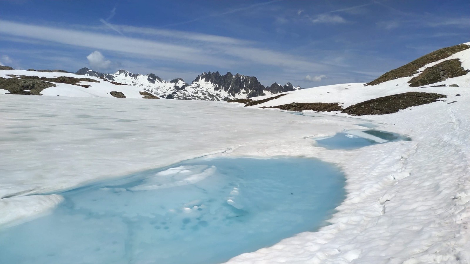 Il n'y a pas trop moyen de se perdre, on monte on monte et ça jusqu'au sommet le plus loin au bout du glacier de St Sorlin. Les 500 premiers mètres de dénivelé s'avalent à peu près vite mais alors après on comprend sa réputation de course plate. On ne peut pas retirer la beauté des paysages mais c'est vraiment long et plat jusqu'au pied de la montée finale du sommet. Heureusement les lacs en phase de fonte apportent un peu de réconfort visuel à la monotonie de la montée.