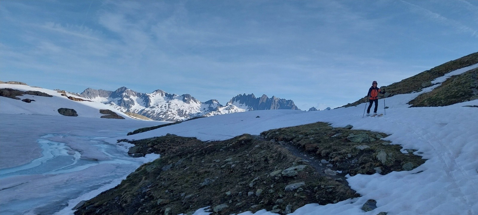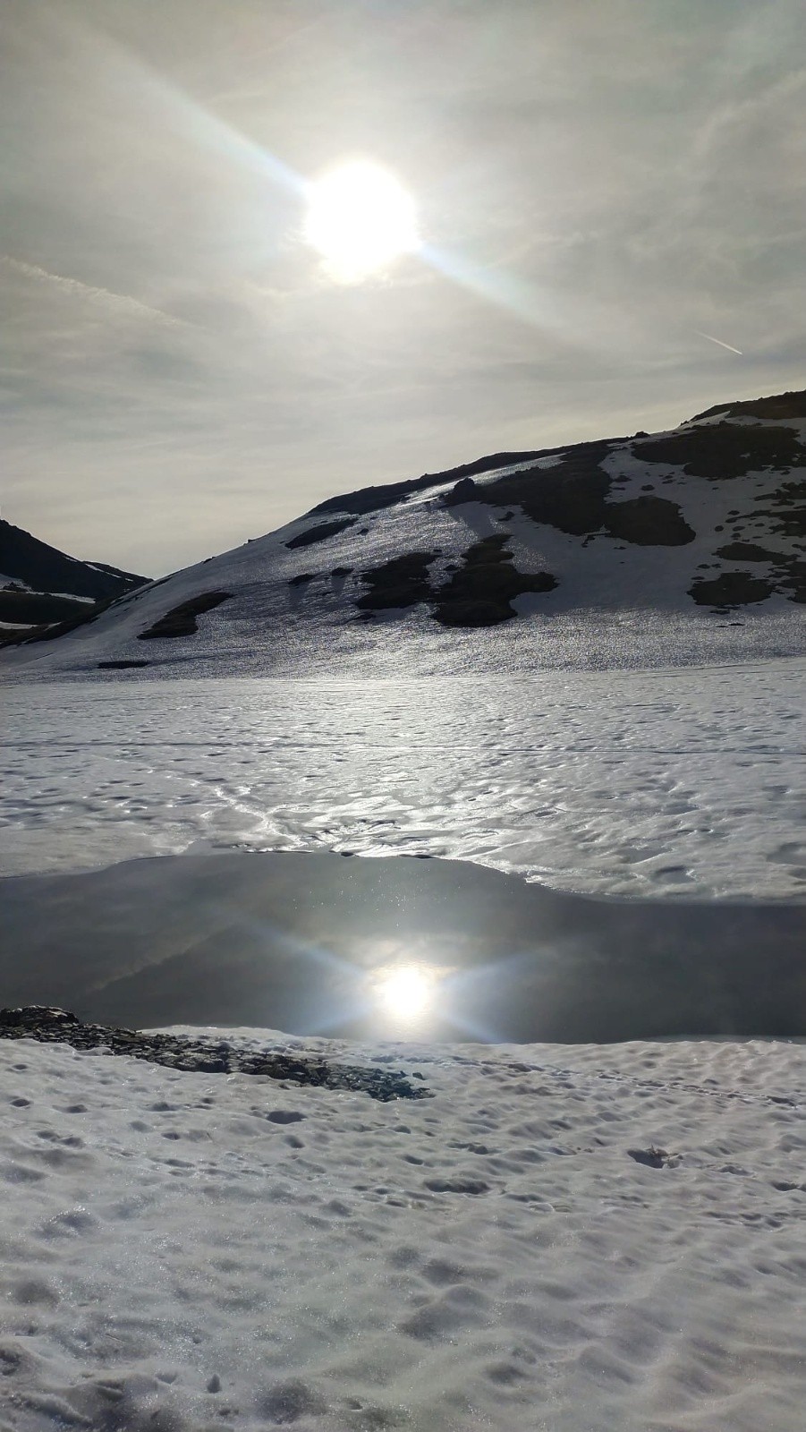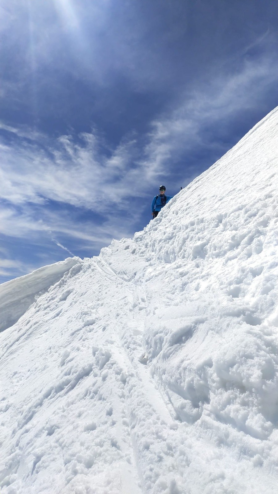 Comme on était en retard avec une arrivée au sommet vers 11h30 on n'a pas trop trainé en haut et on a vite pris le chemin du retour. Neige humide mais facile, agréable et pas trop physique à skier jusqu'à 2850m. C'était un peu inespéré mais on prend avec plaisir. Après cela s'en suit une grosse session "pousse bâton" qui m'a bien soulé. Quand on n'aime pas le plat il suffit de monter et descendre, quoi de mieux que l'aiguille de Laisse pour ça ? Sur accord plutôt unilatéral je laisse maman finir sur le plat pour recoller mes peaux😅. Je remonte sans aller trop vite, c'est assez physique, ça ripe un peu et le soleil cogne bien🥵. Après avoir croisé un chamois au loin je monte au plus direct sur la crête entre l'Aiguille Noire et celle de la Laisse. Je me dis que ce sera plus joli de finir sur les crêtes. Une fois sur la crête c'est effectivement très joli mais ça sera à pied, la neige n'est pas présente partout. Pas de regret, c'était bien sympa 😁!