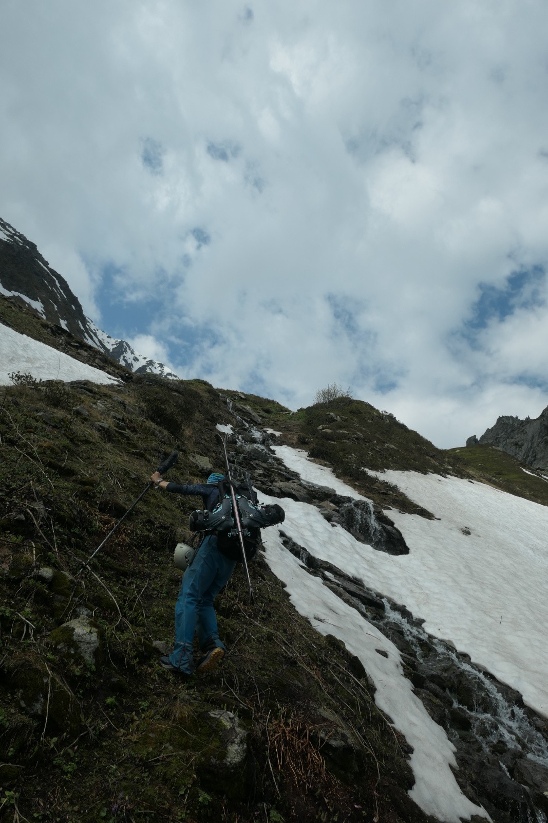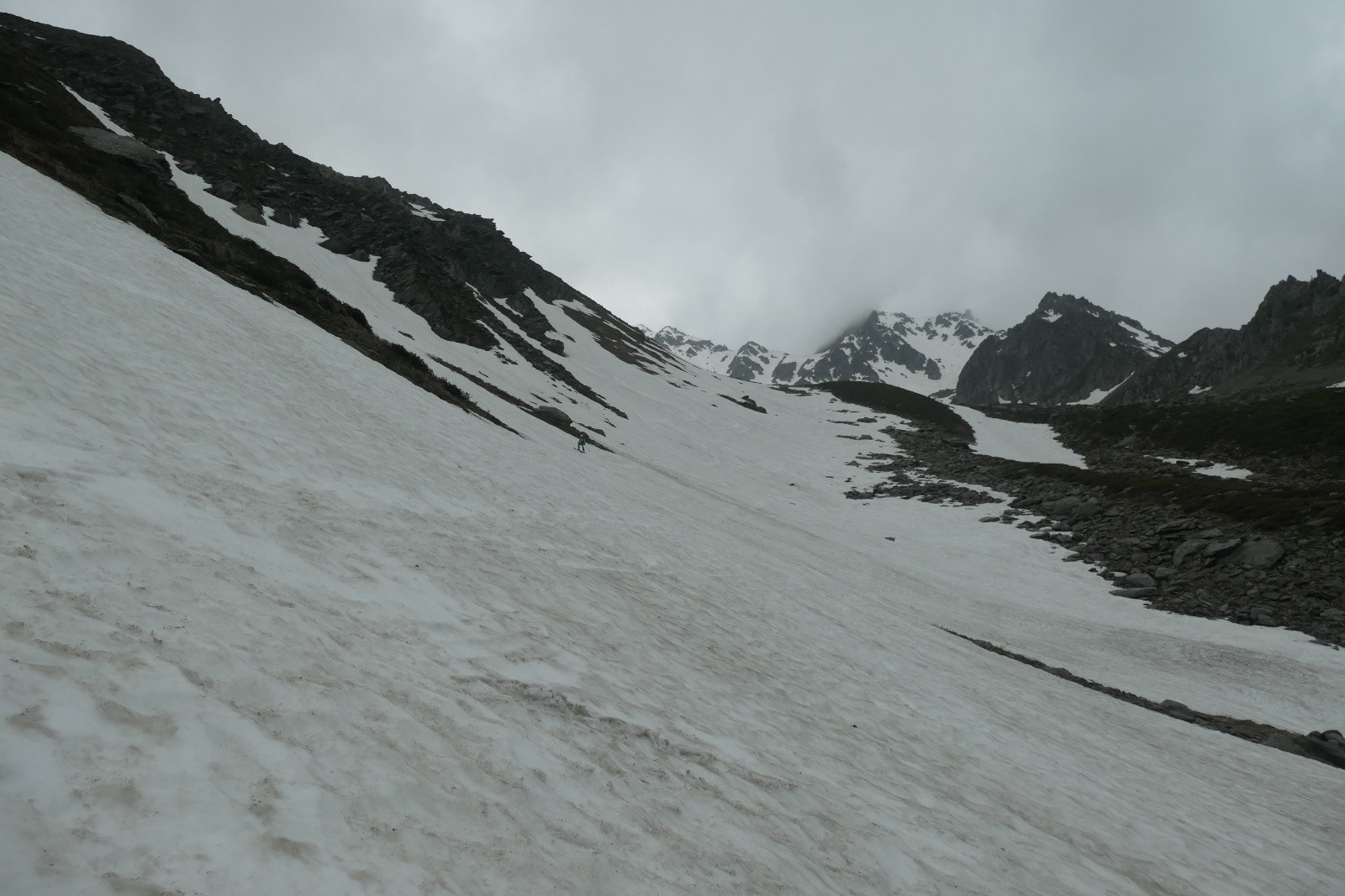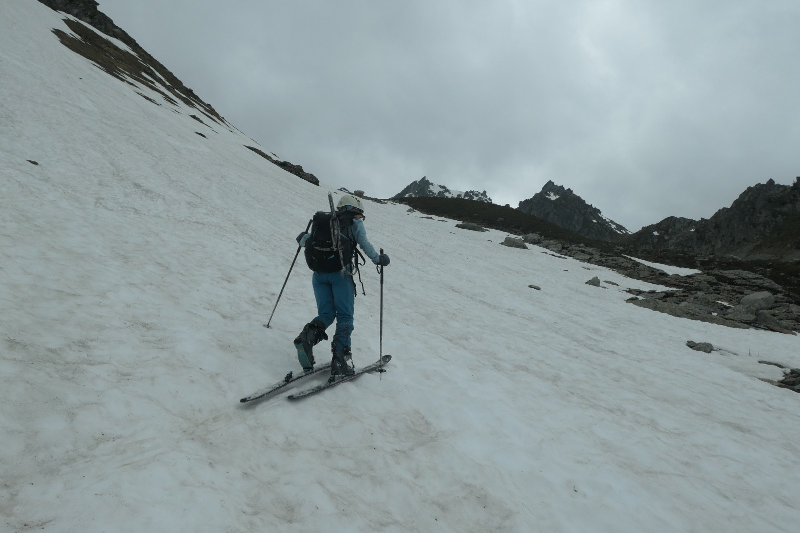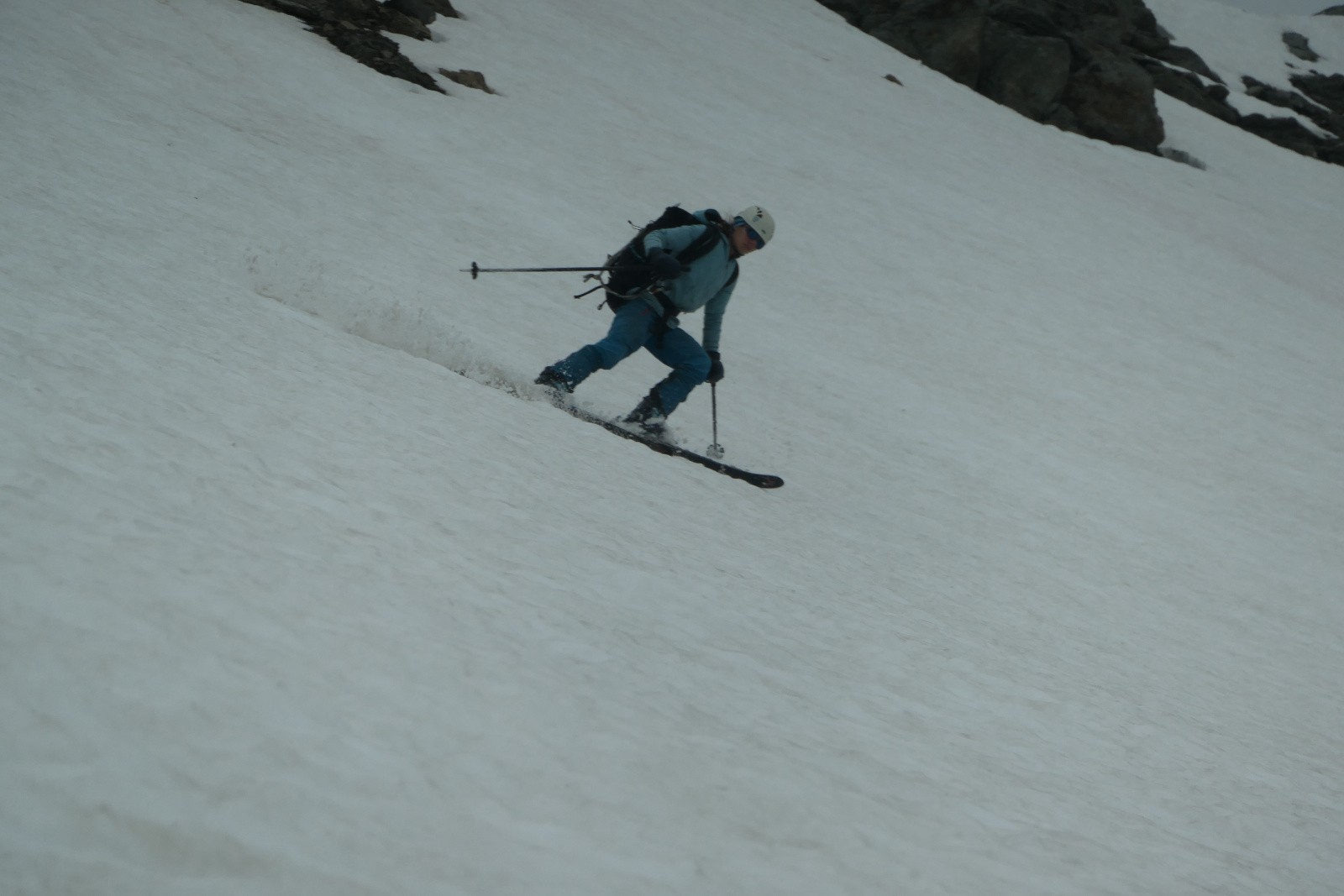 Après une bon portage on profitera d'une neige bien skiante. Un peu zippante en montée vu le faible regel, peu percolée encore à la descente. Second peautage dans la combe avant la reprise des averses. On se fera rincer quelques minutes en remettant les baskets puis ça se calme pour la suite de la descente.