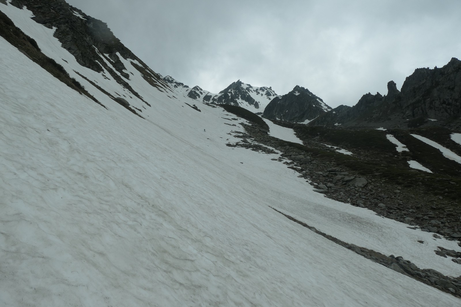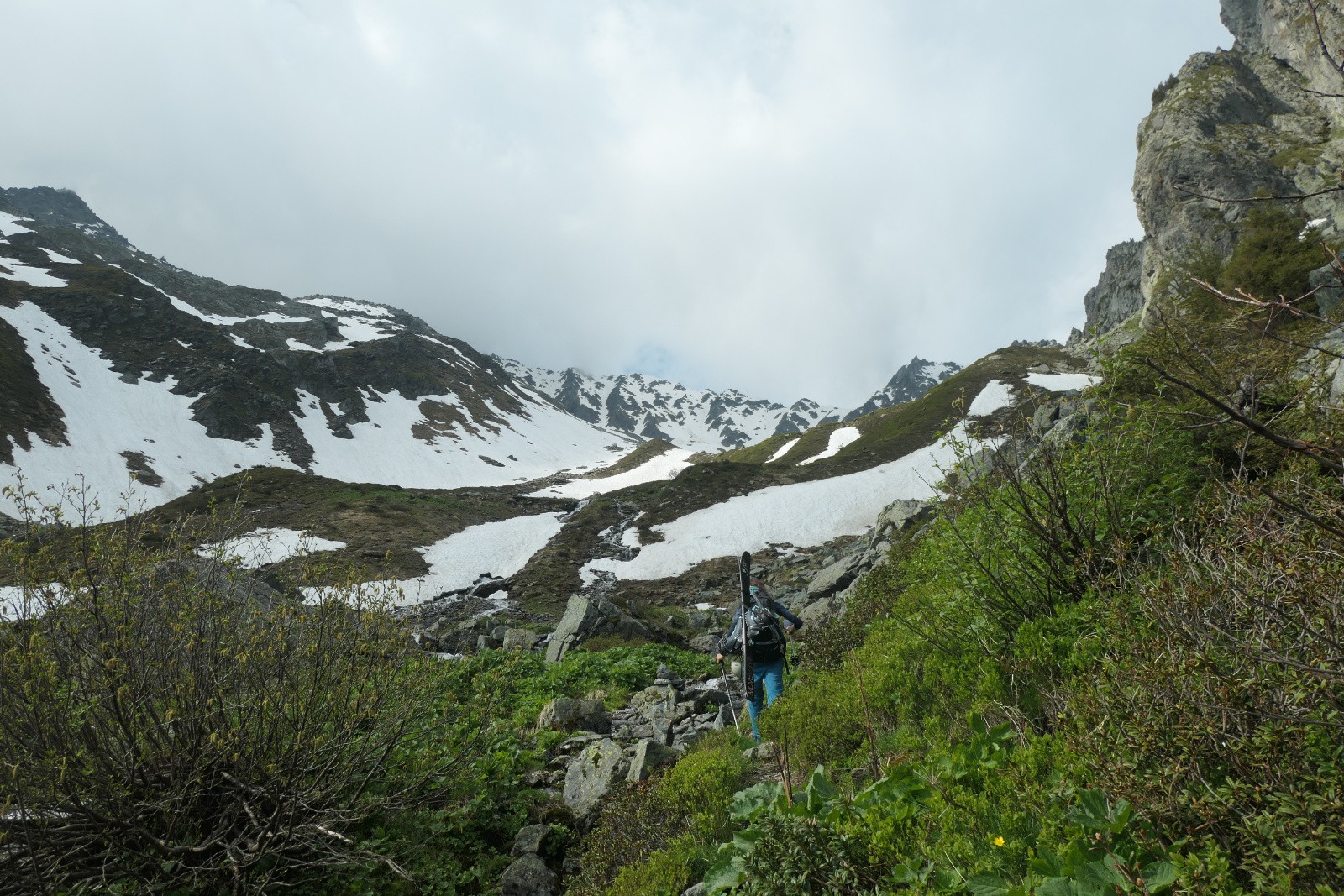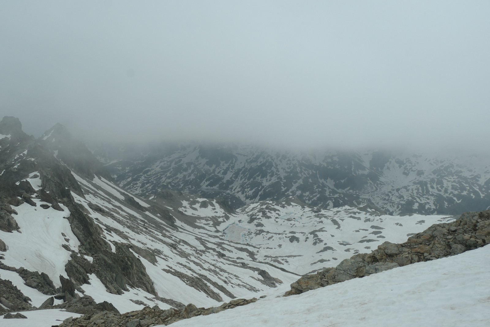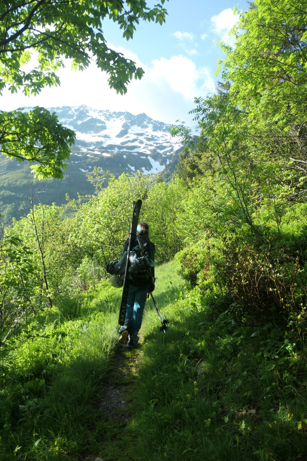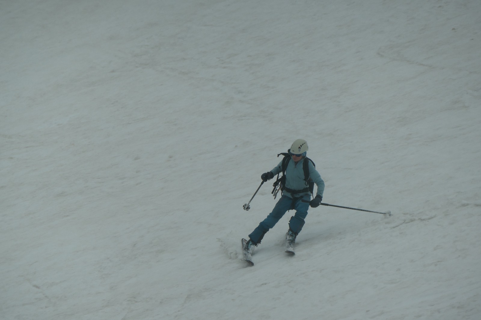 Après une bon portage on profitera d'une neige bien skiante. Un peu zippante en montée vu le faible regel, peu percolée encore à la descente. Second peautage dans la combe avant la reprise des averses. On se fera rincer quelques minutes en remettant les baskets puis ça se calme pour la suite de la descente.