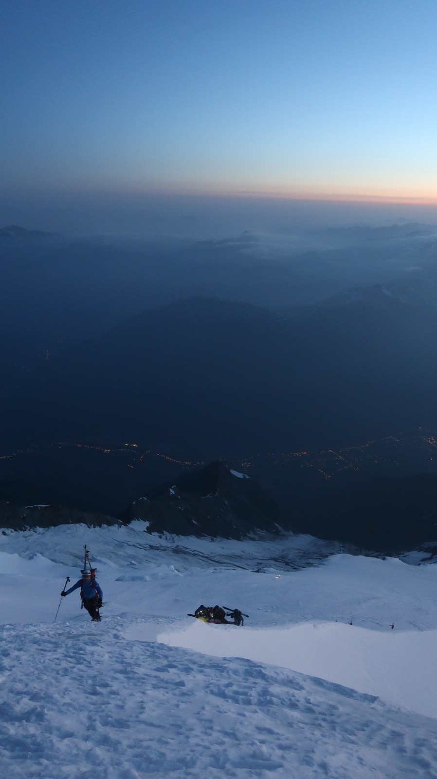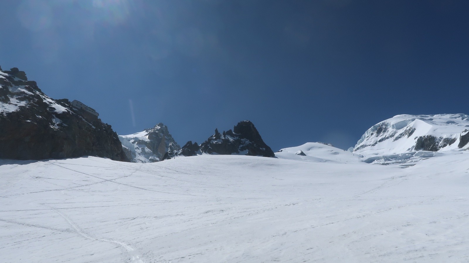 Montée tranquillou jusqu'à l'ancienne gare des glaciers, switch en mode chaussures de ski. Jonction basse qui passe bien lundi - tracée avec des drapeaux tous les 50/80m – pas trop de ponts et crevasse pas trop large sur la trace (ca sera moins le cas le lendemain). Du refuge, on peine à voir le fond de la vallée du fait de l’épais brouillard d’origine canadien (il a pas eu besoin de traité de libre échange pour s'exporter gratis celui là !).