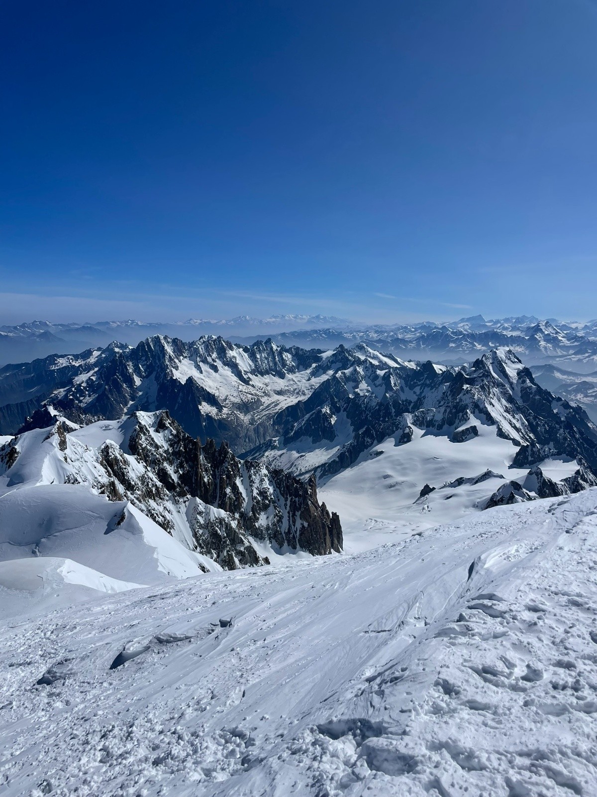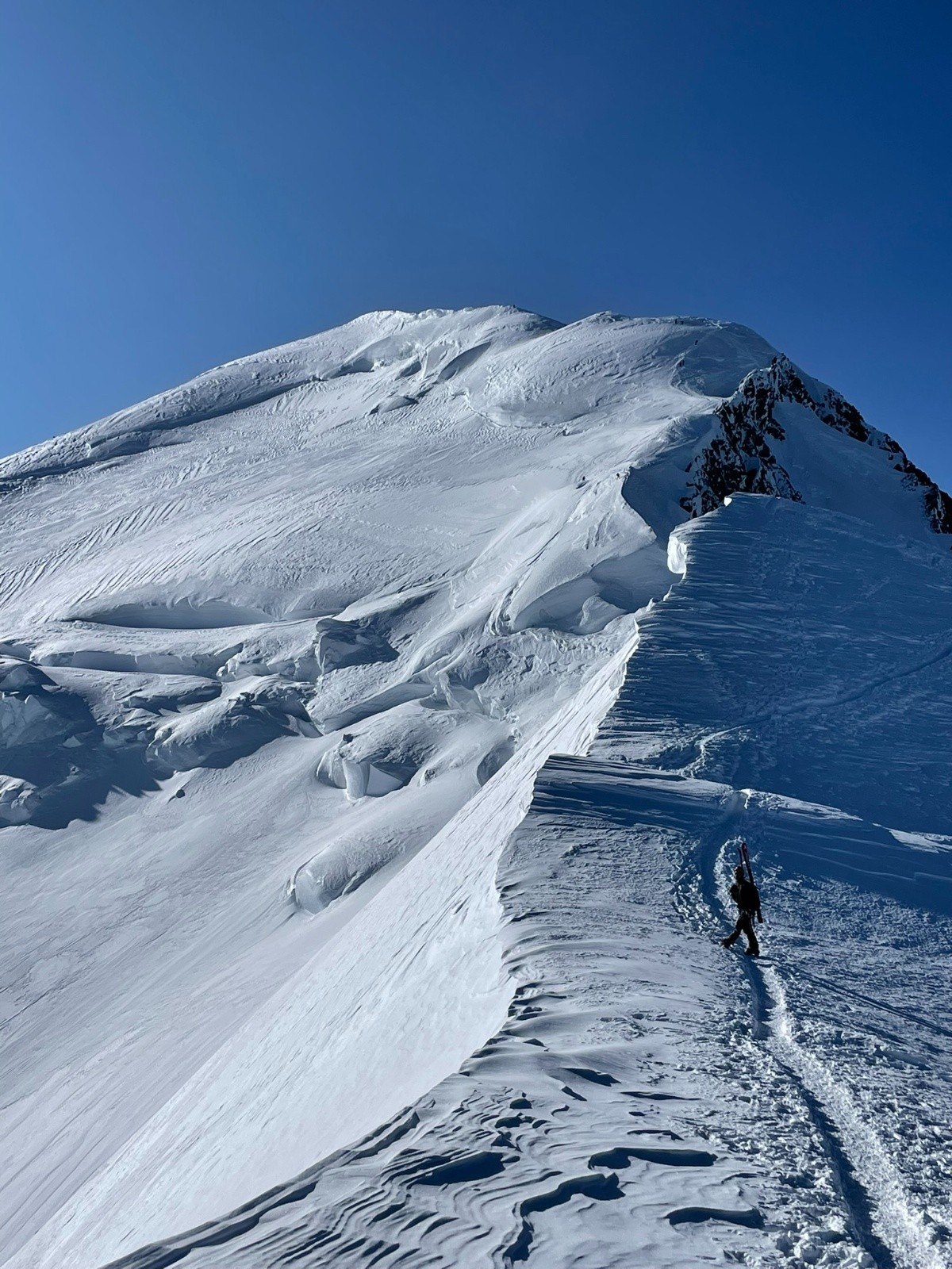 J2 - Ref des Grands Mulets - Mont Blanc (par l'arête des bosses) - Descente Face N - Tunnel (3h - 9h30 - 15h)Après un après-midi de chill sur la terrasse entre coupée de passages de wingsuit, il nous est difficile de trouver le sommeil à 19h30/20h dans un dortoir de 22 plein à craquer, orienté W où le soleil tape encore fort. Courte nuit. Réveil 2h - départ 3h. Excellent regel (ça brillait comme du carrelage avec les frontales). On chausse les crampons à peine passé la petite bosse et arrivé à l'aplomb de l'arête N du Dôme. L'arête est en super condi : neige compacte et bien portante tout du long avec des plaques de glace sur 20m sur le haut. En louvoyant légèrement on trouve tjr des passages avec de la neige. La sortie sur le dos d'âne avec les premiers rayons du soleil est de toute beauté. A ce moment-là, on aurait pu - du - remettre les skis jusqu'à Valo mais on continue en crampons pour s'éviter une manip. Valo à 7h et bonne pause petit dej (un peu comme pour démarrer une journée lambda 😊). On voit un 1er helico du PG au-dessus de la pointe Bravais. On attaque l'arête des bosses avec une super trace (digne de l'A4810). Ça déroule bien ; un poil d'expo sur le passage avec les désormais célèbres pieux. On atteint le sommet autour de 9h30. On marche sur le toit de l’Europe. Moment fort en émotion. Pas froid – léger vent – pas trop de monde (env. 15 personnes). On mesure la chance qu’on a et on profite de ces minutes hors du temps pendant une heure. On restera (i) admiratif devant les gars partis à 2h30 des Houches qui bataillaient avec leur voile de parapente pour décoller et (ii) perplexe devant les alpinistes principalement internationaux qui Facetime leur proche en parlant hyper fort ou ceux qui dansent – à chacun sa façon de célébrer son succès (ceci dit, des comme ça on n’en voit pas souvent à la cime des Agneaux, à la Grande Ruine ou à la Dent Parachée). C’est tout le contraste de Chamonix. Descente dans la face N d'abord dans une neige dure, travaillée par le vent avec de nombreuses aspérités jusqu’au plateau au-dessous des petits mulets (2*). On retrouve de la bonne neige – parfois 5/7cm de poudre moins compact dans l’écharpe entre les seracs de la face (4*) puis une neige en court de transfo sur le grand plateau (4*). On enchaine les beaux virages dans ce cadre somptueux, cerné de ces murailles de glace en équilibre. C’est le pied. Presque moquette (4*) sur le petit plateau jusqu’au niveau du refuge. Arrivé sur le bas du petit plateau, on revoit le PG au niveau des seracs de la face N, là meme ou il y avait eu un accident il y a quelques semaines. Neige lourde sous le refuge (2*). Traversée de la jonction à 12h. On observe + de ponts de neige que la veille. 12h30 ancienne gare des glaciers : fin de la saison de ski et début officielle de la saison de rando. Tunnel 15h.